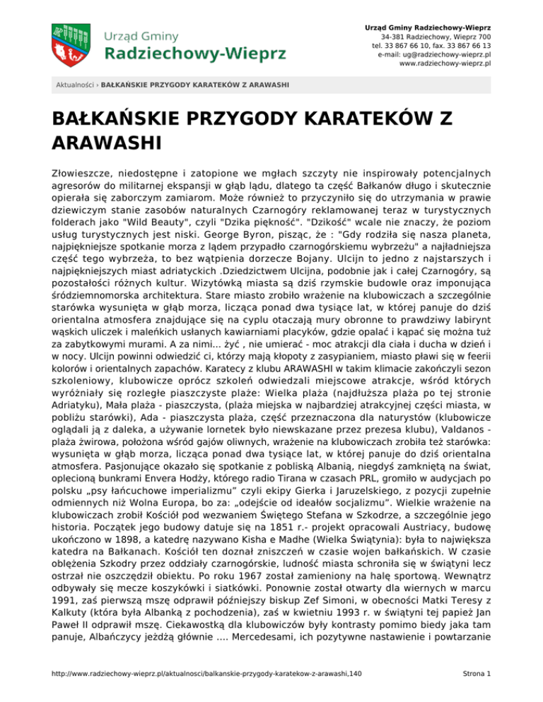 Urząd Gminy Radziechowy-Wieprz 34-381 Radziechowy, Wieprz 700 tel. 33 867 66 10, fax. 33 867 66 13 e-mail: [email protected] www.radziechowy-wieprz.pl Aktualności › BAŁKAŃSKIE PRZYGODY KARATEKÓW Z ARAWASHI BAŁKAŃSKIE PRZYGODY KARATEKÓW Z ARAWASHI Złowieszcze, niedostępne i zatopione we mgłach szczyty nie inspirowały potencjalnych agresorów do militarnej ekspansji w głąb lądu, dlatego ta część Bałkanów długo i skutecznie opierała się zaborczym zamiarom. Może również to przyczyniło się do utrzymania w prawie dziewiczym stanie zasobów naturalnych Czarnogóry reklamowanej teraz w turystycznych folderach jako "Wild Beauty", czyli "Dzika piękność". "Dzikość" wcale nie znaczy, że poziom usług turystycznych jest niski. George Byron, pisząc, że : "Gdy rodziła się nasza planeta, najpiękniejsze spotkanie morza z lądem przypadło czarnogórskiemu wybrzeżu" a najładniejsza część tego wybrzeża, to bez wątpienia dorzecze Bojany. Ulcijn to jedno z najstarszych i najpiękniejszych miast adriatyckich .Dziedzictwem Ulcijna, podobnie jak i całej Czarnogóry, są pozostałości różnych kultur. Wizytówką miasta są dziś rzymskie budowle oraz imponująca śródziemnomorska architektura. Stare miasto zrobiło wrażenie na klubowiczach a szczególnie starówka wysunięta w głąb morza, licząca ponad dwa tysiące lat, w której panuje do dziś orientalna atmosfera znajdujące się na cyplu otaczają mury obronne to prawdziwy labirynt wąskich uliczek i maleńkich usłanych kawiarniami placyków, gdzie opalać i kąpać się można tuż za zabytkowymi murami. A za nimi... żyć , nie umierać - moc atrakcji dla ciała i ducha w dzień i w nocy. Ulcijn powinni odwiedzić ci, którzy mają kłopoty z zasypianiem, miasto pławi się w feerii kolorów i orientalnych zapachów. Karatecy z klubu ARAWASHI w takim klimacie zakończyli sezon szkoleniowy, klubowicze oprócz szkoleń odwiedzali miejscowe atrakcje, wśród których wyróżniały się rozległe piaszczyste plaże: Wielka plaża (najdłuższa plaża po tej stronie Adriatyku), Mała plaża - piaszczysta, (plaża miejska w najbardziej atrakcyjnej części miasta, w pobliżu starówki), Ada - piaszczysta plaża, część przeznaczona dla naturystów (klubowicze oglądali ją z daleka, a używanie lornetek było niewskazane przez prezesa klubu), Valdanos plaża żwirowa, położona wśród gajów oliwnych, wrażenie na klubowiczach zrobiła też starówka: wysunięta w głąb morza, licząca ponad dwa tysiące lat, w której panuje do dziś orientalna atmosfera. Pasjonujące okazało się spotkanie z pobliską Albanią, niegdyś zamkniętą na świat, oplecioną bunkrami Envera Hodży, którego radio Tirana w czasach PRL, gromiło w audycjach po polsku „psy łańcuchowe imperializmu” czyli ekipy Gierka i Jaruzelskiego, z pozycji zupełnie odmiennych niż Wolna Europa, bo za: „odejście od ideałów socjalizmu”. Wielkie wrażenie na klubowiczach zrobił Kościół pod wezwaniem Świętego Stefana w Szkodrze, a szczególnie jego historia. Początek jego budowy datuje się na 1851 r.- projekt opracowali Austriacy, budowę ukończono w 1898, a katedrę nazywano Kisha e Madhe (Wielka Świątynia): była to największa katedra na Bałkanach. Kościół ten doznał zniszczeń w czasie wojen bałkańskich. W czasie oblężenia Szkodry przez oddziały czarnogórskie, ludność miasta schroniła się w świątyni lecz ostrzał nie oszczędził obiektu. Po roku 1967 został zamieniony na halę sportową. Wewnątrz odbywały się mecze koszykówki i siatkówki. Ponownie został otwarty dla wiernych w marcu 1991, zaś pierwszą mszę odprawił późniejszy biskup Zef Simoni, w obecności Matki Teresy z Kalkuty (która była Albanką z pochodzenia), zaś w kwietniu 1993 r. w świątyni tej papież Jan Paweł II odprawił mszę. Ciekawostką dla klubowiczów były kontrasty pomimo biedy jaka tam panuje, Albańczycy jeżdżą głównie …. Mercedesami, ich pozytywne nastawienie i powtarzanie http://www.radziechowy-wieprz.pl/aktualnosci/balkanskie-przygody-karatekow-z-arawashi,140 Strona 1 Urząd Gminy Radziechowy-Wieprz 34-381 Radziechowy, Wieprz 700 tel. 33 867 66 10, fax. 33 867 66 13 e-mail: [email protected] www.radziechowy-wieprz.pl Aktualności › BAŁKAŃSKIE PRZYGODY KARATEKÓW Z ARAWASHI (po albańsku) „BĘDZIE DOBRZE ZA 30 LAT”. Obserwacja żyjących tam ludzi, spotkania i rozmowy stanowiły znakomite uzupełnienie pracy treningowej i wychowawczej klubu gdyż wychowanie i edukacja poprzez „żywe lekcje” są dla zawodników, którego trzon stanowią uczniowie, nie mniej ważne niż szlifowanie umiejętności fizycznych – twierdzi Bogusław Hutman - Wilczek. Bałkańskie przygody zapisały się w sercach i umysłach karateków z Arawashi na długo, naładowały duchowe i fizyczne akumulatory i stanowią doskonały punkt wyjścia do osiągania znakomitych wyników w nowym sezonie. Ciekawe zdjęcia z wyprawy można obejrzeć na stronie internetowej klubu www.arawashi.org w zakładce galeria. http://www.radziechowy-wieprz.pl/aktualnosci/balkanskie-przygody-karatekow-z-arawashi,140 Strona 2