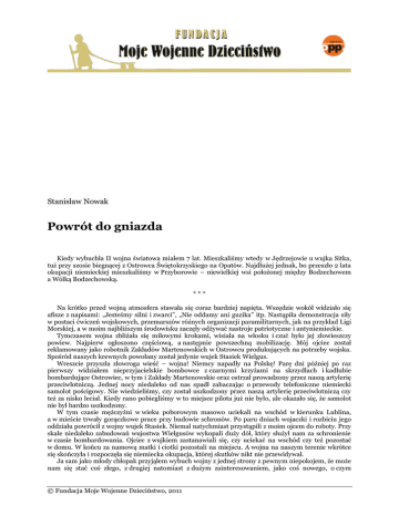 Stanisław Nowak Powrót do gniazda Kiedy wybuchła II wojna światowa miałem 7 lat. Mieszkaliśmy wtedy w Jędrzejowie u wujka Sitka, tuż przy szosie biegnącej z Ostrowca Świętokrzyskiego na Opatów. Najdłużej jednak, bo przeszło 2 lata okupacji niemieckiej mieszkaliśmy w Przyborowie – niewielkiej wsi położonej między Bodzechowem a Wólką Bodzechowską. *** Na krótko przed wojną atmosfera stawała się coraz bardziej napięta. Wszędzie wokół widziało się afisze z napisami: „Jesteśmy silni i zwarci”, „Nie oddamy ani guzika” itp. Nastąpiła demonstracja siły w postaci ćwiczeń wojskowych, przemarszów różnych organizacji paramilitarnych, jak na przykład Ligi Morskiej, a w moim najbliższym środowisku zaczęły odżywać nastroje patriotyczne i antyniemieckie. Tymczasem wojna zbliżała się milowymi krokami, wisiała na włosku i czuć było jej złowieszczy powiew. Najpierw ogłoszono częściową, a następnie powszechną mobilizację. Mój ojciec został reklamowany jako robotnik Zakładów Martenowskich w Ostrowcu produkujących na potrzeby wojska. Spośród naszych krewnych powołany został jedynie wujek Stasiek Wielgus. Wreszcie przyszła złowroga wieść – wojna! Niemcy napadły na Polskę! Parę dni później po raz pierwszy widziałem nieprzyjacielskie bombowce z czarnymi krzyżami na skrzydłach i kadłubie bombardujące Ostrowiec, w tym i Zakłady Martenowskie oraz ostrzał prowadzony przez naszą artylerię przeciwlotniczą. Jednej nocy niedaleko od nas spadł zahaczając o przewody telefoniczne niemiecki samolot pościgowy. Nie wiedzieliśmy, czy został uszkodzony przez naszą artylerię przeciwlotniczą czy też za nisko leciał. Kiedy rano pobiegliśmy w to miejsce pilota już nie było, ale okazało się, że samolot nie był bardzo uszkodzony. W tym czasie mężczyźni w wieku poborowym masowo uciekali na wschód w kierunku Lublina, a w mieście trwały gorączkowe prace przy budowie schronów. Po paru dniach wojaczki i rozbiciu jego oddziału powrócił z wojny wujek Stasiek. Niemal natychmiast przystąpili z moim ojcem do roboty. Przy skale niedaleko zabudowań wujostwa Wielgusów wykopali duży dół, który służył nam za schronienie w czasie bombardowania. Ojciec z wujkiem zastanawiali się, czy uciekać na wschód czy też pozostać w domu. W końcu za namową matki i ciotki pozostali na miejscu. A wojna na naszym terenie wkrótce się skończyła i rozpoczęła się niemiecka okupacja, której skutków nikt nie przewidywał. Ja sam jako młody chłopak przyjąłem wybuch wojny z jednej strony z pewnym niepokojem, że może nam się stać coś złego, z drugiej natomiast z dużym zainteresowaniem, jako coś nowego, o czym © Fundacja Moje Wojenne Dzieciństwo, 2011 Stanisław Nowak, Powrót do gniazda 2 dotychczas nie miałem najmniejszego wyobrażenia. Nie zdawałem sobie również sprawy z tego, co mnie i mojej rodzinie przyniesie okupacja. Moje pierwsze spotkanie z żołnierzami niemieckimi nastąpiło któregoś pogodnego, prawie upalnego dnia, kiedy ujrzałem maszerującą z kierunku Ostrowca długą kolumnę wojska. Okazało się, że są to nasi jeńcy wojenni, konwojowani przez Niemców. Jacy oni byli spoceni, zakurzeni i zmęczeni! Aż żal było patrzeć. Moja matka i pozostałe kobiety z sąsiedztwa nakroiły chleba do misek, nabrały wody do butelek i zaczęły ich częstować w marszu. Niektórzy konwojenci nie zwracali na to uwagi i pozwalali na poczęstunek, natomiast inni zdecydowanie i brutalnie – używając nawet kolb karabinów – odganiali kobiety od kolumny jeńców. Już w tym momencie dało się zauważyć, że wśród żołnierzy niemieckich są ludzie dobrzy i źli, co w znacznej mierze potwierdziły dalsze lata okupacji. Po upływie niecałego tygodnia w okolicy naszych i sąsiednich zabudowań rozłożyła namioty jakaś jednostka niemiecka, składająca się z kilkunastu samochodów i motocykli oraz paru działek przeciwlotniczych. Żołnierze – trzeba to przyznać – zachowywali się wtedy dość poprawnie. O ziemniaki na przykład prosili, a nie zabierali, jak to miało miejsce później – w następnych latach okupacji – i nie dokuczali nam specjalnie. Byliśmy przekonani, że wojna skończyła się już na dobre, aż tu pierwszej niedzieli od zakwaterowania wokół nas tej jednostki, o świcie nadleciał nasz polski samolot myśliwski i zataczając koła rozpoczął ostrzał z karabinu maszynowego niemieckich samochodów i namiotów. Mieliśmy trochę strachu, ale i wielki ubaw, widząc przez okno jak Niemcy w kalesonach wyskakują z namiotów i biegną do działek przeciwlotniczych. Zanim zaczęli strzelać samolot już odleciał i po paru krótkich seriach działek przeciwlotniczych zapanowała cisza. Natychmiast po odjeździe Niemców, my chłopaki, spenetrowaliśmy teren obozowiska. Czego my tam nie znaleźliśmy! Różnego rodzaju paski skórzane – krótsze i dłuższe, małą blaszaną składaną kuchenkę na skondensowany spirytus i parę kostek tego spirytusu. Nawet kilkanaście sztuk naboi karabinowych i o dziwo – granat zaczepny. Amunicję i granat oczywiście zabrał nam mój ojciec i przechowywał w bezpiecznym miejscu do 1942 roku, kiedy te „akcesoria” stały się uzupełnieniem uzbrojenia naszych oddziałów partyzanckich GL i AL. Niezwykłą frajdę sprawiło nam znalezienie kilku blaszanych puszek po miodzie pszczelim (Niemcy wyposażeni byli nie tylko w nowoczesny sprzęt wojskowy, ale i znakomicie odżywiani), na dnie których pozostały spore ilości tego nektaru. Ależ zajadaliśmy się tym miodem! Po raz pierwszy dane mi było poznać jego smak i przekonać się, jaki jest dobry. Takich smakołyków nie zaznałem ani przedtem, ani też w późniejszych latach okupacji. *** Najcięższy okres okupacji przeżyliśmy w Przyborowie, we wsi – jak sama nazwa wskazuje – położonej tuż przy lesie. Mieszkaliśmy tu na lokatornym u państwa Golców, przez 
