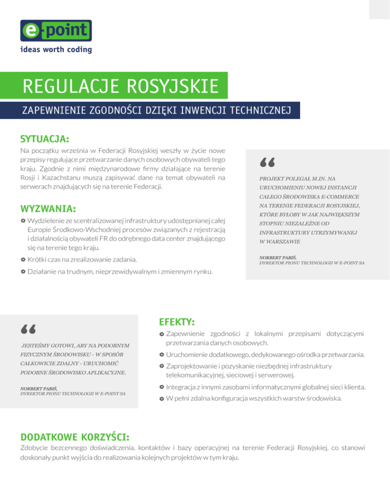 REGULACJE ROSYJSKIE ZAPEWNIENIE ZGODNOŚCI DZIĘKI INWENCJI TECHNICZNEJ SYTUACJA: Na początku września w Federacji Rosyjskiej weszły w życie nowe przepisy regulujące przetwarzanie danych osobowych obywateli tego kraju. Zgodnie z nimi międzynarodowe firmy działające na terenie Rosji i Kazachstanu muszą zapisywać dane na temat obywateli na serwerach znajdujących się na terenie Federacji. PROJEKT POLEGAŁ M.IN. NA URUCHOMIENIU NOWEJ INSTANCJI CAŁEGO ŚRODOWISKA E-COMMERCE WYZWANIA: NA TERENIE FEDERACJI ROSYJSKIEJ, Wydzielenie ze scentralizowanej infrastruktury udostępnianej całej Europie Środkowo-Wschodniej procesów związanych z rejestracją i działalnością obywateli FR do odrębnego data center znajdującego się na terenie tego kraju. KTÓRE BYŁOBY W JAK NAJWIĘKSZYM STOPNIU NIEZALEŻNE OD INFRASTRUKTURY UTRZYMYWANEJ W WARSZAWIE NORBERT PABIŚ, DYREKTOR PIONU TECHNOLOGII W E-POINT SA Krótki czas na zrealizowanie zadania. Działanie na trudnym, nieprzewidywalnym i zmiennym rynku. EFEKTY: JESTEŚMY GOTOWI, ABY NA PODOBNYM Zapewnienie zgodności z lokalnymi przepisami dotyczącymi przetwarzania danych osobowych. FIZYCZNYM ŚRODOWISKU - W SPOSÓB Uruchomienie dodatkowego, dedykowanego ośrodka przetwarzania. CAŁKOWICIE ZDALNY - URUCHOMIĆ Zaprojektowanie i pozyskanie niezbędnej infrastruktury telekomunikacyjnej, sieciowej i serwerowej. PODOBNE ŚRODOWISKO APLIKACYJNE. NORBERT PABIŚ, DYREKTOR PIONU TECHNOLOGII W E-POINT SA Integracja z innymi zasobami informatycznymi globalnej sieci klienta. W pełni zdalna konfiguracja wszystkich warstw środowiska. DODATKOWE KORZYŚCI: Zdobycie bezcennego doświadczenia, kontaktów i bazy operacyjnej na terenie Federacji Rosyjskiej, co stanowi doskonały punkt wyjścia do realizowania kolejnych projektów w tym kraju. 1 ETAP: ORGANIZACJA INFRASTRUKTURY NA MIEJSCU Opracowano trzy możliwe rozwiązania problemu: A. Zakup sprzętu w Polsce i przetransportowanie go do rosyjskiego data center, zdalna konfiguracja Dlaczego nie wybrano tej drogi: kontrola graniczna byłaby długotrwała i drobiazgowa ze względu na obecną sytuację polityczną. Dlatego też potrzebna infrastruktura technologiczna najprawdopodobniej nie dotarłaby na czas. NIE MOGLIŚMY PO PROSTU ZAMÓWIĆ SERWERÓW U DOSTAWCY I CZEKAĆ NA DOSTAWĘ, KTÓRA RÓWNIEŻ PODLEGAŁA PROBLEMOM Z ODPRAWĄ B. Skorzystanie z chmury obliczeniowej CELNĄ. MUSIELIŚMY ZNALEŹĆ Holenderska firma hostingowa posiadała zarówno wymaganą infrastrukturę, jak i fizyczne serwery w Federacji Rosyjskiej. GOTOWY DO INSTALACJI ORAZ Dlaczego nie wybrano tej drogi: ze względu na warunki licencjonowania koszty wykorzystania infrastruktury bardzo by wzrosły, przez co z punktu widzenia wdrożenia byłyby nieopłacalne. C. Zakup sprzętu na terenie Federacji Rosyjskiej DOSTAWCĘ, KTÓRY POSIADA SPRZĘT DOSTOSOWAĆ NASZE PLANY DOTYCZĄCE INFRASTRUKTURY DO TEGO CO JEST DOSTĘPNE OD RĘKI, A SPEŁNIA NASZE WYMAGANIA. NORBERT PABIŚ, DYREKTOR PIONU TECHNOLOGII W E-POINT SA Rozwiązanie, które zostało wybrane. 2 ETAP: MIGRACJA OPROGRAMOWANIA OBECNIE KLIENCI KORZYSTAJĄCY Z SYSTEMU E-COMMERCE Z DOMENY PRZEZNACZONEJ DLA ROSJI I KAZACHSTANU SĄ OBSŁUGIWANI Wszystkie niezbędne prace związane z konfiguracją i instalacją nowego środowiska odbywały się zdalnie. Instalacja niezbędnych komponentów odbywała się etapami. W pierwszym kroku skonfigurowano środowisko sieciowe, aby następnie za jego pomocą uruchamiać kolejne serwery. Wykorzystano autorskie rozwiązania e-point wspierające zdalną administrację oraz skrypty automatyzujące instalację wybranych komponentów aplikacyjnych. PRZEZ SYSTEM DZIAŁAJĄCY NA TERENIE FEDERACJI ROSYJSKIEJ. ŁUKASZ ŁAGUDZA, KIEROWNIK ZESPOŁU MLM W E-POINT SA Produkcyjne uruchomienie platformy e-commerce na tak przygotowanej platformie poprzedziły testy prowadzone przy zaangażowaniu klienta. Przeprowadzono też ostateczny audyt bezpieczeństwa i stabilności środowiska.