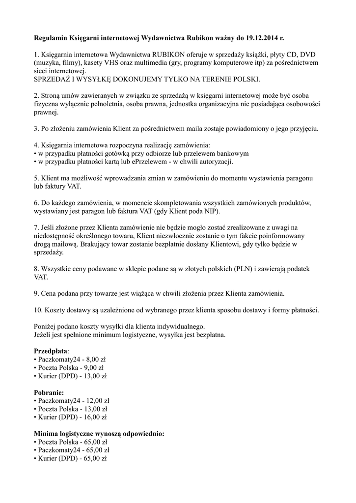 Regulamin Księgarni internetowej Wydawnictwa Rubikon ważny do 19.12.2014 r. 1. Księgarnia internetowa Wydawnictwa RUBIKON oferuje w sprzedaży książki, płyty CD, DVD (muzyka, filmy), kasety VHS oraz multimedia (gry, programy komputerowe itp) za pośrednictwem sieci internetowej. SPRZEDAŻ I WYSYŁKĘ DOKONUJEMY TYLKO NA TERENIE POLSKI. 2. Stroną umów zawieranych w związku ze sprzedażą w księgarni internetowej może być osoba fizyczna wyłącznie pełnoletnia, osoba prawna, jednostka organizacyjna nie posiadająca osobowości prawnej. 3. Po złożeniu zamówienia Klient za pośrednictwem maila zostaje powiadomiony o jego przyjęciu. 4. Księgarnia internetowa rozpoczyna realizację zamówienia: • w przypadku płatności gotówką przy odbiorze lub przelewem bankowym • w przypadku płatności kartą lub ePrzelewem - w chwili autoryzacji. 5. Klient ma możliwość wprowadzania zmian w zamówieniu do momentu wystawienia paragonu lub faktury VAT. 6. Do każdego zamówienia, w momencie skompletowania wszystkich zamówionych produktów, wystawiany jest paragon lub faktura VAT (gdy Klient poda NIP). 7. Jeśli złożone przez Klienta zamówienie nie będzie mogło zostać zrealizowane z uwagi na niedostępność określonego towaru, Klient niezwłocznie zostanie o tym fakcie poinformowany drogą mailową. Brakujący towar zostanie bezpłatnie dosłany Klientowi, gdy tylko będzie w sprzedaży. 8. Wszystkie ceny podawane w sklepie podane są w złotych polskich (PLN) i zawierają podatek VAT. 9. Cena podana przy towarze jest wiążąca w chwili złożenia przez Klienta zamówienia. 10. Koszty dostawy są uzależnione od wybranego przez klienta sposobu dostawy i formy płatności. Poniżej podano koszty wysyłki dla klienta indywidualnego. Jeżeli jest spełnione minimum logistyczne, wysyłka jest bezpłatna. Przedpłata: • Paczkomaty24 - 8,00 zł • Poczta Polska - 9,00 zł • Kurier (DPD) - 13,00 zł Pobranie: • Paczkomaty24 - 12,00 zł • Poczta Polska - 13,00 zł • Kurier (DPD) - 16,00 zł Minima logistyczne wynoszą odpowiednio: • Poczta Polska - 65,00 zł • Paczkomaty24 - 65,00 zł • Kurier (DPD) - 65,00 zł 11. Dostawa towaru realizowana jest za pośrednictwem Poczty Polskiej lub firmy kurierskiej DPD, przy czym Klient sam wybiera sposób dostawy po zapoznaniu się z kosztami, jakie wiążą się z dostawą określonego rodzaju. 12. Termin otrzymania przesyłki przez Klienta uzależniony jest od sposobu dostawy (Poczta Polska - do 14 dni roboczych; firma kurierska: 7 dni roboczych, przy czym sklep nie ponosi odpowiedzialności za czas trwania dostawy). 13. Akceptujemy następujące formy płatności za sprzedany towar: • gotówką przy odbiorze - należność pobiera listonosz lub kurier, • kartą, • ePrzelewem, • przedpłata przelewem bankowym na rachunek BZ WBK 78 1090 2053 0000 0001 0256 9520, • gotówka w siedzibie wydawnictwa. 14. Zgodnie z ustawą z dnia 2 marca 2000 roku o ochronie niektórych praw konsumentów oraz o odpowiedzialności za szkodę wyrządzoną przez produkt niebezpieczny (Dz.U. 2000 Nr 22, poz. 271 ze zm.) Klient będący konsumentem, może odstąpić od umowy sprzedaży towaru (zwrócić zakupiony towar) i dokonać reklamacji bez podania przyczyn w terminie 14 dni od dnia odbioru przesyłki. Do zachowania tego terminu wystarczy wysłanie pisemnego oświadczenia o odstąpieniu od umowy lub nadanie towaru z fakturą VAT przed jego upływem. 15. Towar może zostać zwrócony pod warunkiem, że nie nosi śladów używania, kopiowania, ani nie został zniszczony. 16. Płyty CD, DVD, CD-ROM muszą być zwrócone w oryginalnym nienaruszonym opakowaniu. 17. Koszty zwrotu towaru ponosi Klient. 18. Księgarnia internetowa nie przyjmuje żadnych przesyłek wysłanych na adres księgarni za pobraniem. 19. Zwrot kwoty wpłaconej z tytułu ceny sprzedaży towaru nastąpi w terminie 14 dni roboczych od daty zwrotu towaru przelewem bankowym lub przekazem pocztowym na wskazany przez Klienta rachunek bankowy lub adres. 20. Jeżeli towar zawiera wady fizyczne lub został uszkodzony podczas dostawy, Klient jest zobowiązany w terminie 7 dni roboczych do jego przesłania na swój koszt i na adres księgarni internetowej. Należy także przesłać wypełniony druk reklamacji, który należy pobrać w formacie PDF lub DOC. Do przesyłki należy także dołączyć paragon zakupu lub fakturę VAT. 21. Reklamacje rozpatrywane będą w ciągu 7 dni roboczych od momentu doręczenia przesyłki prze Klienta. 22. Po pozytywnym rozpatrzeniu reklamacji towar zostanie wymieniony na wolny od wad, a jeżeli nie będzie to możliwe, Klient będzie mógł wybrać inny towar z oferty sklepu w cenie odpowiadającej cenie towaru co do którego została zgłoszona reklamacja lub odstąpić od umowy sprzedaży i zażądać zwrotu zapłaconej ceny towaru. 23. Zgodnie z art. 24 ust. 1 ustawy z dnia 29 sierpnia 1997 r. o ochronie danych osobowych (tekst jednolity: Dz.U. z 2002 r. nr 101, poz. 926 ze zm.) informujemy, iż administratorem danych osobowych jest Wydawnictwo i Hurtownia Rubikon Katarzyna Król z siedzibą w Krakowie. Dane osobowe przetwarzane będą w celu marketingu produktów i usług administratora danych i nie będą udostępniane innym odbiorcom. Klientom przysługuje prawo dostępu do treści swoich danych oraz ich poprawiania. Podanie danych osobowych jest dobrowolne. 24. W przypadku sprzedaży towaru w ramach ogłaszanych promocji, Księgarnia zastrzega sobie możliwość wprowadzenia ograniczeń ilościowych w sprzedaży towarów tego samego rodzaju. 25. Ceny promocyjne i rabaty są wyłącznie dla osób fizycznych i prawnych, które nie prowadzą działalności gospodarczej, polegającej na odsprzedaży zakupionego w KsiegarniaRubikon.pl towaru osobom trzecim.