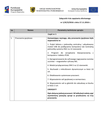 Załącznik 4 do zapytania ofertowego nr 1/JE/3/2016 z dnia 17.11.2016 r. Lp. Nazwa Parametry techniczne sprzętu Część nr 1 1. Pracownia językowa Zamawiający wymaga, aby pracownia językowa była wyposażona w: 1. Pulpit lektora z jednostką centralną i wbudowany moduł USB do podłączenia komputera lub Centralną jednostkę systemu RAC na 12 stanowisk. 2. Program do zarządzania komputera i tabletu PCM. klasopracownią z 3. Oprogramowanie do cyfrowego nagrywania rozmów uczniów – magnetofon cyfrowy MC. 4. Moduł przyłączeniowy DIN 5 na 12 stanowisk. 5. Słuchawki z mikrofonem dynamicznym w ilości 13 szt. 6. Okablowanie systemowe pracowni. 7. Wyposażenie sali językowej w wzmacniacz. 8. Wyposażenie sali w głośniki do zabudowy w biurku w ilości 2 szt. UWAGA!!! Opis dotyczy jednej pracowni. W kalkulacji należy ująć wymieniony powyżej sprzęt w przeliczeniu na trzy pracownie. 2. Tablice interaktywne do organizacji i urozmaicenia zajęć edukacyjnych Specyfikacja techniczna tablicy: wymiar całkowity tablicy min.: 177,6×128,6 cm, wymiar powierzchni użytkowej min: 167×117,6 cm, rozdzielczość w calach min: 80'' (ok. 203,2 cm), powierzchnia tablicy: ceramiczna, technologia: na podczerwień, sposób pisania: palec, lub dowolny wskaźnik, grubość: 4,5 cm właściwość powierzchni: suchościeralnomagnetyczna, komunikacja z komputerem: USB. W zestawie: 3. Projektor multimedialny tablica interaktywna, 4 pisaki magnetyczne, kabel USB – 5 m, płyta CD – sterownik i oprogramowanie do prowadzenia prezentacji/adnotacji, instrukcja obsługi. Tablice zostaną zamontowane przez Wykonawcę w miejscu wskazanym przez Zmawiającego. PARAMETRY OPTYCZNE Rozdzielczość natywna - 1024 x 768 (XGA), Proporcje obrazu - 4:3, Kontrast -12000:1, Jasność -12600 ANSI Lumenów (ok. 80% w trybie Eco), Moc lampy - 180 W AC (145 W AC Tryb Eco ), Żywotność lampy [godz.] - 5000 (6000 Tryb Eco), Obiektyw - F= 2, f= 0 mm, Współczynnik projekcji -0.47 : 1, Odległość projekcji [m] - 0.6 – 1.1, Kąt projekcji [°] -37.3 - 38.6, Wielkość (przekątna) ekranu [cm] / [cale] maksymalnie: 279,4 / 110"; minimalnie: 152,4 / 60", Zoom - Zoom cyfrowy, Ustawienie ostrości - ręczne, Obsługiwane rozdzielczości: 1920 x 1080 (HDTV 1080i/60; HDTV 1080i/50); 1680 x 1050 (WSXGA+); 1600 x 1200 (UXGA); 1600 x 900 (WXGA++); 1440 x 900 (WXGA+); 1400 x 1050 (SXGA+); 1366 x 768 (WXGA); 1360 x 768 (WXGA); 1280 x 1024 (SXGA); 1280 x 1024 (MAC 23"); 1280 x 960 (SXGA); 1280 x 800 (WXGA); 1280 x 768 (WXGA); 1280 x 720 (HDTV 720p); 1152 x 870 (MAC 21"); 1152 x 864 (XGA); 1024 x 768 (XGA); 832 x 624 (MAC 16"); 800 x 600 (SVGA); 720 x 576 SDTV 480p/480i; 720 x 480 SDTV 576p/576i; 640 x 480 (VGA/MAC 13"), Częstotliwość Pionowa: 50 – 120 Hz; Pozioma: 15–100 kHz (RGB: 24 kHz– 100 kHz). MOŻLIWOŚCI PODŁĄCZANIA Komputer (analogowe) - wejście: 2 x Mini D-sub 15-pin, kompatybilne z component (YPbPr), HDMI™ - Wejście: 1 x HDMI™ (głębia koloru, synchronizacja obrazu i dźwięku), Sygnał video - Wejście: 1 x RCA, S-Video - Wejście: 1 x Mini DIN 4-pin, Audio - Wejście: 2 x 3.5 mm Stereo Mini Jack; 2 x RCA Stereo, Wyjście: 1 x 3.5 mm Stereo Mini Jack (variable), Control Wejście: 1 x D-Sub 9 pin (RS-232) (męskie), LAN 1 x RJ45, USB 1 x Type B; 2 x Type A (USB 2.0 high speed), Video NTSC; NTSC 4.43; PAL; PAL-M; PAL60; SECAM, FUNKCJE PILOTA Automatyczne dostosowanie geometrii obrazu; Automatyczne dostosowanie obrazu; Dostosowanie obrazu; Kontrola audio; Numer ID; Prezentacja i sterowanie myszką; Proporcje obrazu; Tryb Help Eco; Tryb obrazu; Wybór źródła sygnału; Wyciszenie AV; Zatrzymanie obrazu; Zoom cyfrowy. PARAMETRY ELEKTRYCZNE Zasilanie - 100-240 V AC; 50 - 60 Hz, Pobór mocy [W] -239 (Normal) / 193 (ECO) / 8 (Network Stand-by) / 0,4 (Stand-by), PARAMETRY MECHANICZNE Wymiary [mm] 398 x 140 x 309,5 (bez nóżek i obiektywu), Waga [kg] - 4, Poziom szumu [dB (A)] -29 / 35 (Eco / Normal), WYPOSAŻENIE DODATKOWE 4. Laptop 5. Tablet 6. Drukarki 3D bezprzewodowy moduł LAN (NP02LM2); DisplayNote; Lampa (NP15LP); Zestaw do montażu naściennego (NP02WK). ekran wielkości: 15,6 cala min; ekran rozdzielczości: 1366 x 768 pikseli lub więcej; processor: Intel Core i3 5gen 5005U 2,0 GHz; system operacyjny: Windows 10 Professional; pamięć RAM 8 GB; dysk 1000 GB; karta graficzna: WXGA (1366 x 768); Adobe Flash Player, wersja 9.0 lub wyższa; Microsoft NET Framework 3,5 lub wyżej. 7 calowy ekran dotykowy o rozdzielczości 1024 x 600; czterordzeniowy procesor MediaTek; wbudowana pamięć 8 GB; możliwość rozbudowania wewnętrznej pamięci o maksymalnie 64 GB poprzez slot na karty microSD; wyposażony w dwie kamery – przednią o rozdzielczości 0,3 Mpix oraz tylną o rozdzielczości 2 Mpix; system operacyjny Android 5.0; łączność poprzez Wi-Fi (802.11b/g/n) , Bluetooth 4.0. Cechy produktu: Pole robocze 200x200x200; Wysokość warstwy 0,1-0,4mm; Średnica Filamentu 1,75mm; Rodzaje Filamentu PLA,ABS, Guma; Podgrzewany stół Mk2B; Dysza 0,4mm; Wymiary drukarki 500x400x420mm; Predkość pracy 50-60mm/s; Elektronika Ramps 1.4; Silniki Nema 17 0,4Nm (Demontaż); Rama 6mm MDF z wspornikami. W skład zestawu wchodzi: rama MDF 6mm + wsporniki; silniki NEMA 17(demontaż) z gotowymi kablami i wtyczkami; sprzęgła elastyczne aluminium; prowadnice: wałki fi 8 ze stali nierdzewnej; łożyska liniowe LM08UU; części wydrukowane z ABS; pręty gwintowane M10 przycięte na wymiar, nakrętki i podkładki; zębatki aluminiowe GT2; elektronika Ramps 1.4 + Mega 2560 + 4x Stepstick A4988 + LCD; czytnik kart SD - drukarka może pracować autonomicznie; stół grzejny MK2B + szybka 20x20 cm + klipsy; głowica full-metal J-Head do wyboru: 1.75 mm lub 3mm; standardowa dysza 0.4 mm; mikroprzełączniki krańcowe, przewody i wtyczki; śruba radełkowana - Hobbed Bolt; przewód USB; filament PLA 1kg + 100g Gumy + 250g ABS; zasilacz przemysłowy 12v 200wat; wyświetlacz 128x124 pixele; karta SD 8GB; stojak (podajnik) na 