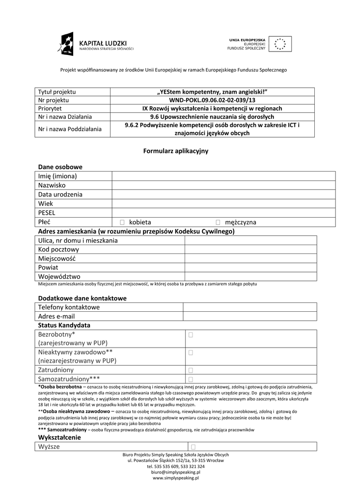 Projekt współfinansowany ze środków Unii Europejskiej w ramach Europejskiego Funduszu Społecznego Tytuł projektu Nr projektu Priorytet Nr i nazwa Działania Nr i nazwa Poddziałania „YEStem kompetentny, znam angielski!” WND-POKL.09.06.02-02-039/13 IX Rozwój wykształcenia i kompetencji w regionach 9.6 Upowszechnienie nauczania się dorosłych 9.6.2 Podwyższenie kompetencji osób dorosłych w zakresie ICT i znajomości języków obcych Formularz aplikacyjny Dane osobowe Imię (imiona) Nazwisko Data urodzenia Wiek PESEL Płeć kobieta mężczyzna Adres zamieszkania (w rozumieniu przepisów Kodeksu Cywilnego) Ulica, nr domu i mieszkania Kod pocztowy Miejscowość Powiat Województwo Miejscem zamieszkania osoby fizycznej jest miejscowość, w której osoba ta przebywa z zamiarem stałego pobytu Dodatkowe dane kontaktowe Telefony kontaktowe Adres e-mail Status Kandydata Bezrobotny* (zarejestrowany w PUP) Nieaktywny zawodowo** (niezarejestrowany w PUP) Zatrudniony Samozatrudniony*** *Osoba bezrobotna – oznacza to osobę niezatrudnioną i niewykonującą innej pracy zarobkowej, zdolną i gotową do podjęcia zatrudnienia, zarejestrowaną we właściwym dla miejsca zameldowania stałego lub czasowego powiatowym urzędzie pracy. Do grupy tej zalicza się jedynie osobę nieuczącą się w szkole, z wyjątkiem szkół dla dorosłych lub szkół wyższych w systemie wieczorowym albo zaocznym, która ukończyła 18 lat i nie ukończyła 60 lat w przypadku kobiet lub 65 lat w przypadku mężczyzn. **Osoba nieaktywna zawodowo – oznacza to osobę niezatrudnioną, niewykonującą innej pracy zarobkowej, zdolną i gotową do podjęcia zatrudnienia lub innej pracy zarobkowej w co najmniej połowie wymiaru czasu pracy; jednocześnie osoba ta nie może być zarejestrowana w powiatowym urzędzie pracy jako bezrobotna *** Samozatrudniony – osoba fizyczna prowadząca działalność gospodarczą, nie zatrudniająca pracowników Wykształcenie Wyższe Biuro Projektu Simply Speaking Szkoła Języków Obcych ul. Powstańców Śląskich 152/1a, 53-315 Wrocław tel. 535 535 609, 533 321 324 [email protected] www.simplyspeaking.pl Projekt współfinansowany ze środków Unii Europejskiej w ramach Europejskiego Funduszu Społecznego Pomaturalne Ponadgimnazjalne Gimnazjalne Podstawowe Brak Dodatkowe informacje: Osoba z wykształceniem co najwyżej średnim Osoba powracająca oraz wchodząca na rynek pracy po raz pierwszy po przerwie związanej z urodzeniem i wychowaniem dzieci**** Osoba w wieku powyżej 64 roku życia, pozostająca bez zatrudnienia, deklarująca gotowość podjęcia zatrudnienia po zakończeniu udziału w projekcie Tak Nie Tak Nie Tak Nie ****Przez osoby powracające na rynek pracy po przerwie związanej z urodzeniem lub wychowaniem dzieci należy rozumieć osoby pozostające bez zatrudnienia będące rodzicem lub opiekunem prawnym dziecka w wieku do lat 3 lub osoby przebywające na urlopie macierzyńskim lub wychowawczym oraz planujące powrót na rynek pracy. Zgłaszam swoją kandydaturę do udziału w Projekcie „YEStem kompetentny, znam angielski”, realizowanego przez Katarzynę Bartoszek-Górską Oświadczam, że: 1. Pouczona/y o odpowiedzialności za składanie oświadczeń niezgodnych z prawdą, oświadczam, że podane wyżej dane są zgodne z prawdą i zobowiązuję się do bezzwłocznego poinformowania Szkoły Jezyków Obcych Simply Speaking o ich zmianie. 2. Zapoznałem/am się z Regulaminem rekrutacji i spełniam warunki uczestnictwa w Projekcie „YEStem kompetentny, znam angielski”. 3. Zostałem/am poinformowany/a, że Projekt jest współfinansowany przez Unię Europejską w ramach Europejskiego Funduszu Społecznego. 4. Oświadczam, że przystępuję do udziału w projekcie z własnej inicjatywy. 5. Wyrażam zgodę na gromadzenie, przetwarzanie i przekazywanie moich danych osobowych zawartych w niniejszym formularzu (zgodnie z Ustawą z dnia 29.08.97r. o ochronie danych osobowych Dz. U. z 2002r. Nr 101 poz. 926, ze zm.), do celów związanych z przeprowadzeniem rekrutacji, wszystkich form wsparcia, monitoringu i ewaluacji Projektu. ………………………………. Miejscowość i data ………………………………. Czytelny podpis Kandydata Wypełnia Szkoła Języków Obcych Simply Speaking.: Kandydat spełnia kryteria rekrutacyjne do wzięcia udziału w Projekcie „YEStem kompetentny, znam angielski” Poziom motywacji Kandydata do uzyskania certyfikatu Tak Nie 1 2 Biuro Projektu Simply Speaking Szkoła Języków Obcych ul. Powstańców Śląskich 152/1a, 53-315 Wrocław tel. 535 535 609, 533 321 324 [email protected] www.simplyspeaking.pl 3 Projekt współfinansowany ze środków Unii Europejskiej w ramach Europejskiego Funduszu Społecznego Biuro Projektu Simply Speaking Szkoła Języków Obcych ul. Powstańców Śląskich 152/1a, 53-315 Wrocław tel. 535 535 609, 533 321 324 [email protected] www.simplyspeaking.pl