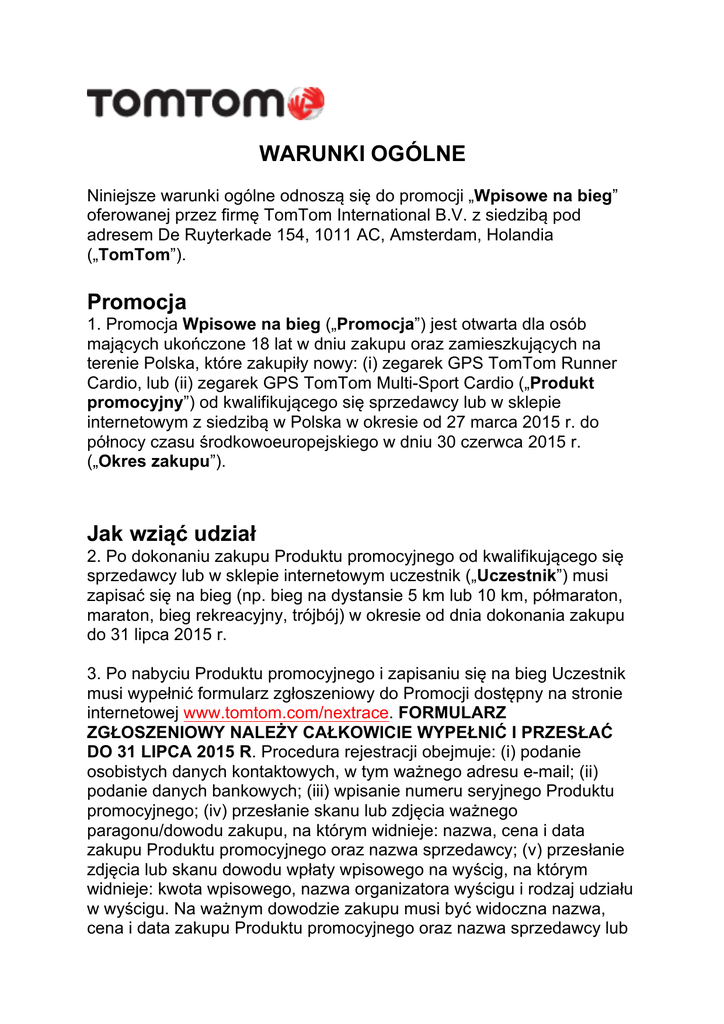 WARUNKI OGÓLNE Niniejsze warunki ogólne odnoszą się do promocji „Wpisowe na bieg” oferowanej przez firmę TomTom International B.V. z siedzibą pod adresem De Ruyterkade 154, 1011 AC, Amsterdam, Holandia („TomTom”). Promocja 1. Promocja Wpisowe na bieg („Promocja”) jest otwarta dla osób mających ukończone 18 lat w dniu zakupu oraz zamieszkujących na terenie Polska, które zakupiły nowy: (i) zegarek GPS TomTom Runner Cardio, lub (ii) zegarek GPS TomTom Multi-Sport Cardio („Produkt promocyjny”) od kwalifikującego się sprzedawcy lub w sklepie internetowym z siedzibą w Polska w okresie od 27 marca 2015 r. do północy czasu środkowoeuropejskiego w dniu 30 czerwca 2015 r. („Okres zakupu”). Jak wziąć udział 2. Po dokonaniu zakupu Produktu promocyjnego od kwalifikującego się sprzedawcy lub w sklepie internetowym uczestnik („Uczestnik”) musi zapisać się na bieg (np. bieg na dystansie 5 km lub 10 km, półmaraton, maraton, bieg rekreacyjny, trójbój) w okresie od dnia dokonania zakupu do 31 lipca 2015 r. 3. Po nabyciu Produktu promocyjnego i zapisaniu się na bieg Uczestnik musi wypełnić formularz zgłoszeniowy do Promocji dostępny na stronie internetowej www.tomtom.com/nextrace. FORMULARZ ZGŁOSZENIOWY NALEŻY CAŁKOWICIE WYPEŁNIĆ I PRZESŁAĆ DO 31 LIPCA 2015 R. Procedura rejestracji obejmuje: (i) podanie osobistych danych kontaktowych, w tym ważnego adresu e-mail; (ii) podanie danych bankowych; (iii) wpisanie numeru seryjnego Produktu promocyjnego; (iv) przesłanie skanu lub zdjęcia ważnego paragonu/dowodu zakupu, na którym widnieje: nazwa, cena i data zakupu Produktu promocyjnego oraz nazwa sprzedawcy; (v) przesłanie zdjęcia lub skanu dowodu wpłaty wpisowego na wyścig, na którym widnieje: kwota wpisowego, nazwa organizatora wyścigu i rodzaj udziału w wyścigu. Na ważnym dowodzie zakupu musi być widoczna nazwa, cena i data zakupu Produktu promocyjnego oraz nazwa sprzedawcy lub sklepu internetowego. Na ważnym dowodzie wpłaty wpisowego musi być widoczna nazwa organizatora wyścigu oraz cena i rodzaj wyścigu, w którym został wykupiony udział. Szczegółowe informacje umożliwiające zlokalizowanie numeru seryjnego zegarka można znaleźć tutaj. 4. Promocją są objęte wyłącznie nowe i oryginalne produkty. Używane, odświeżone lub regenerowane produkty są wykluczone z Promocji. Oprócz tego, wyłączone z Promocji są również zakupy dokonane w serwisie eBay (obejmujące nowe i używane artykuły) oraz u innych dostawców w witrynie Amazon. 5. Po prawidłowym wypełnieniu danych w formularzu zgłoszeniowym Uczestnik otrzyma pocztą elektroniczną potwierdzenie rejestracji zawierające unikalny numer referencyjny, który musi być umieszczany w całej korespondencji dotyczącej Promocji. 6. Kwota zwrotu zależy od rodzaju wyścigu, udział w którym zostanie wykupiony. Maksymalna kwota zwrotu to ZŁ 120. Jeśli koszt uczestnictwa w wyścigu jest mniejszy niż ZŁ 120, wysokość zwrotu będzie równa opłacie za udział w wyścigu. Jeśli koszt wyścigu przekracza maksymalną kwotę zwrotu, Uczestnik otrzyma zwrot w wysokości ZŁ 120. 7. Jeśli wpisowe na wyścig zostało opłacone w walucie innej niż obowiązująca w kraju zamieszkiwanym przez Uczestnika oraz przypisana do rachunku bankowego, zwrot zostanie przyznany w kwocie określonej na podstawie kursu waluty obowiązującego na dzień przetworzenia i opłacenia zgłoszenia udziału w wyścigu w lokalnej walucie. Jeśli na przykład Uczestnik zamieszkuje na terenie Holandii i ma holenderski rachunek bankowy, ale zapisze się na maraton odbywający się w Nowym Jorku i na dowodzie zapłaty widnieje kwota 30 USD, Uczestnik otrzyma zwrot w wysokości ZŁ 111. 8. Po potwierdzeniu zgłoszenia i weryfikacji dokumentacji kwota zwrotu („Premia”) zostanie przekazana w ciągu trzydziestu (30) dni bezpośrednio na rachunek bankowy wskazany przez Uczestnika. 9. Wszelkie niekompletne i nieprawidłowe formularze zgłoszeniowe zostaną automatycznie odrzucone, a do Uczestników zostaną wysłane stosowne powiadomienia e-mail. Niekompletne formularze zgłoszeniowe należy uzupełnić i ponownie przesłać w ciągu 7 (siedmiu) dni roboczych od daty otrzymania powiadomienia. W przeciwnym razie formularz nie zostanie przetworzony. Zgłoszenie jest uznawane za niekompletne w przypadku, gdy spełnia jedno lub więcej spośród następujących kryteriów: • Zakupiony produkt nie jest objęty Promocją. • Produkt promocyjny został nabyty poza Okresem zakupu. • Produkt promocyjny został zwrócony. • Produkt promocyjny nie został zakupiony u kwalifikującego się sprzedawcy. • Procedura rejestracji została zakończona po wyznaczonym terminie. • W formularzu zgłoszeniowym brakuje jakichkolwiek wymaganych informacji. • Nie dostarczono dowodu zakupu lub dostarczony dowód zakupu jest nieważny. • Dostarczono nieprawidłowe zdjęcie/kopię dowodu zakupu Produktu promocyjnego lub dowodu uiszczenia wpisowego na wyścig. • Dostarczono niepełne lub nieprawidłowe dane bankowe. 10. Uczestnik musi postępować zgodnie z opisaną procedurą oraz z warunkami ogólnymi, w tym także stosować się do określonych terminów i wymogów Promocji. Uczestnicy muszą zakończyć procedurę rejestracji do godziny 23:59 czasu środkowoeuropejskiego w dniu 31 lipca 2015 r. („Dzień zakończenia”). Ogólne warunki uczestnictwa 11. Promocja jest otwarta dla osób mających ukończone 18 lat w dniu zgłoszenia udziału w Promocji. Uczestnicy mają prawo ubiegać się o maksymalnie 1 (jedną) Premię na osobę (to samo nazwisko i/lub adres). Promocja nie łączy się z żadną inną ofertą ani promocją. 12. Firma TomTom szanuje prywatność Uczestników i dba o to, aby wszystkie dane osobowe były przetwarzane zgodnie z polityką prywatności firmy TomTom. Szczegóły znajdują się na stronie www.tomtom.com/legal/privacy/. Dane osobowe dostarczane przez Uczestników w celu zrealiz