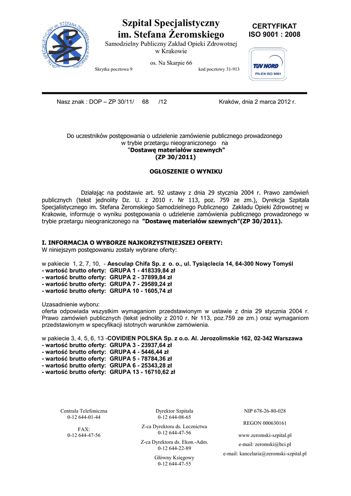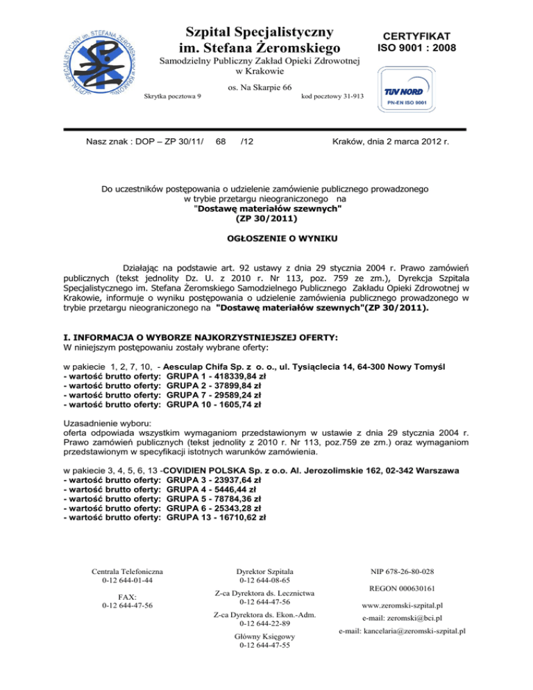 Szpital Specjalistyczny im. Stefana Żeromskiego CERTYFIKAT ISO 9001 : 2008 Samodzielny Publiczny Zakład Opieki Zdrowotnej w Krakowie os. Na Skarpie 66 Skrytka pocztowa 9 Nasz znak : DOP – ZP 30/11/ kod pocztowy 31-913 68 /12 Kraków, dnia 2 marca 2012 r. Do uczestników postępowania o udzielenie zamówienie publicznego prowadzonego w trybie przetargu nieograniczonego na "Dostawę materiałów szewnych" (ZP 30/2011) OGŁOSZENIE O WYNIKU Działając na podstawie art. 92 ustawy z dnia 29 stycznia 2004 r. Prawo zamówień publicznych (tekst jednolity Dz. U. z 2010 r. Nr 113, poz. 759 ze zm.), Dyrekcja Szpitala Specjalistycznego im. Stefana Żeromskiego Samodzielnego Publicznego Zakładu Opieki Zdrowotnej w Krakowie, informuje o wyniku postępowania o udzielenie zamówienia publicznego prowadzonego w trybie przetargu nieograniczonego na "Dostawę materiałów szewnych"(ZP 30/2011). I. INFORMACJA O WYBORZE NAJKORZYSTNIEJSZEJ OFERTY: W niniejszym postępowaniu zostały wybrane oferty: w pakiecie 1, 2, 7, 10, - Aesculap Chifa Sp. z o. o., ul. Tysiąclecia 14, 64-300 Nowy Tomyśl - wartość brutto oferty: GRUPA 1 - 418339,84 zł - wartość brutto oferty: GRUPA 2 - 37899,84 zł - wartość brutto oferty: GRUPA 7 - 29589,24 zł - wartość brutto oferty: GRUPA 10 - 1605,74 zł Uzasadnienie wyboru: oferta odpowiada wszystkim wymaganiom przedstawionym w ustawie z dnia 29 stycznia 2004 r. Prawo zamówień publicznych (tekst jednolity z 2010 r. Nr 113, poz.759 ze zm.) oraz wymaganiom przedstawionym w specyfikacji istotnych warunków zamówienia. w pakiecie 3, 4, 5, 6, 13 -COVIDIEN POLSKA Sp. z o.o. Al. Jerozolimskie 162, 02-342 Warszawa - wartość brutto oferty: GRUPA 3 - 23937,64 zł - wartość brutto oferty: GRUPA 4 - 5446,44 zł - wartość brutto oferty: GRUPA 5 - 78784,36 zł - wartość brutto oferty: GRUPA 6 - 25343,28 zł - wartość brutto oferty: GRUPA 13 - 16710,62 zł Centrala Telefoniczna 0-12 644-01-44 FAX: 0-12 644-47-56 Dyrektor Szpitala 0-12 644-08-65 Z-ca Dyrektora ds. Lecznictwa 0-12 644-47-56 Z-ca Dyrektora ds. Ekon.-Adm. 0-12 644-22-89 Główny Księgowy 0-12 644-47-55 NIP 678-26-80-028 REGON 000630161 www.zeromski-szpital.pl e-mail: [email protected] e-mail: [email protected] Szpital Specjalistyczny im. Stefana Żeromskiego CERTYFIKAT ISO 9001 : 2008 Samodzielny Publiczny Zakład Opieki Zdrowotnej w Krakowie os. Na Skarpie 66 Skrytka pocztowa 9 kod pocztowy 31-913 Uzasadnienie wyboru: oferta odpowiada wszystkim wymaganiom przedstawionym w ustawie z dnia 29 stycznia 2004 r. Prawo zamówień publicznych (tekst jednolity z 2010 r. Nr 113, poz.759 ze zm.) oraz wymaganiom przedstawionym w specyfikacji istotnych warunków zamówienia. Termin podpisania umów nastąpi zgodnie z art. 94 ust. 1 ustawy Prawo zamówień publicznych (tekst jednolity Dz. U. z 2010 r. Nr 113, poz. 759 ze zm.), Zamawiający informuje, że pakietach nr 8, 9, 11, na podstawie art. 93 ust. 1 pkt 1 ustawy postępowanie zostało unieważnione, ponieważ nie złożono żadnej oferty niepodlegającej odrzuceniu. W pakiecie 12 Zamawiający unieważnił postępowanie na podstawie art. 93 ust. 1 pkt 7 ustawy ponieważ jest obarczone wadą uniemożliwiającą zawarcie niepodlegającej unieważnieniu umowy w sprawie zamówienia publicznego. Pakiet 12 zawiera opis przedmiotu zamówienia: "inne specjalistyczne materiały typu surgicel", które nie można ocenić w sposób wskazany przez Zamawiającego w pkt XIV. 1 SIWZ z dnia 10 października 2011 r. Ponadto pakiet 12 został nieprawidłowo sporządzony przez Zamawiającego ponieważ nie podał wymaganej ilości sztuk w kol. 9 formularza asortymentowo cenowego. II. WYKONAWCY WYKLUCZENI: Wykonawca JOHNSON & JOHNSON Sp z o.o. ul. Iłżecka 24, 02-135 Warszawa, został wykluczony z postępowania na podstawie art. 24 ust. 2 pkt 4 ustawy, ponieważ nie wykazał spełniania warunków udziału w postępowaniu. Wykonawca złożył dokument z KRK dla Pana Pawła Chrościckiego z dnia 7.12.2011 r., dokument ten nie potwierdza spełniania przez oferowane dostawy wymagań określonych przez zamawiającego nie później niż w dniu, w którym upłynął termin składania ofert tj. na dzień 1.12.2011 r. Ponadto oferta w pakiecie 12 w formularzu ofertowym asortymentowo - cenowym zawiera błąd w postaci podania przez Wykonawcę stawki 7 % oraz w pakiecie nr 1 poz. 28, 29 oraz w pakiecie 10 Wykonawca zaoferował igłę zakłóciową natomiast Zamawiający wymagał zaoferowania igły tępej. III. OFERTY ODRZUCONE: Oferta Wykonawcy GCZM ZARYS Sp. z o.o. ul. Pod Borem 18, 41-808 Zabrze w pakiecie 5 została odrzucona na podstawie art. 89 ust. 1 pkt 8 ustawy, ponieważ jest nieważna na podstawie odrębnych przepisów. Wykonawca nie podpisał 4 strony oferty, co jest niezgodne z pkt. X.3 SIWZ ponieważ "oferta, pod rygorem nieważności, powinna być (...) podpisana przez osobę upoważnioną do reprezentowania Wykonawcy". Centrala Telefoniczna 0-12 644-01-44 FAX: 0-12 644-47-56 Dyrektor Szpitala 0-12 644-08-65 Z-ca Dyrektora ds. Lecznictwa 0-12 644-47-56 Z-ca Dyrektora ds. Ekon.-Adm. 0-12 644-22-89 Główny Księgowy 0-12 644-47-55 NIP 678-26-80-028 REGON 000630161 www.zeromski-szpital.pl e-mail: [email protected] e-mail: [email protected] Szpital Specjalistyczny im. Stefana Żeromskiego CERTYFIKAT ISO 9001 : 2008 Samodzielny Publiczny Zakład Opieki Zdrowotnej w Krakowie os. Na Skarpie 66 Skrytka pocztowa 9 kod pocztowy 31-913 IV. ZESTAWIENIE WYKONAWCÓW, KTÓRZY ZŁOŻYLI OFERTY WRAZ ZE STRESZCZENIEM OCENY I PORÓWNANIEM ZŁOŻONYCH OFERT: L.p Nr oferty 1 5 2 Nazwa i siedziba wykonawców, którzy złożyli oferty cena jakość RAZEM PAKIET 1 Aesculap Chifa Sp.z o.o., ul. Tysiąclecia 14, 64-300 Nowy Tomyśl 60,00 pkt 40,00 pkt 100,00 pkt 6 PAKIET 1 COVIDIEN POLSKA Sp. z o.o. Al. Jerozolimskie 162, 02-342 Warszawa 48,88 pkt 40,00 pkt 88,80 pkt 3 5 PAKIET 2 Aesculap Chifa Sp.z o.o., ul. Tysiąclecia 14, 64-300 Nowy Tomyśl 60,00 pkt 40,00 pkt 100,00 pkt 4 6 PAKIET 2 COVIDIEN POLSKA Sp
