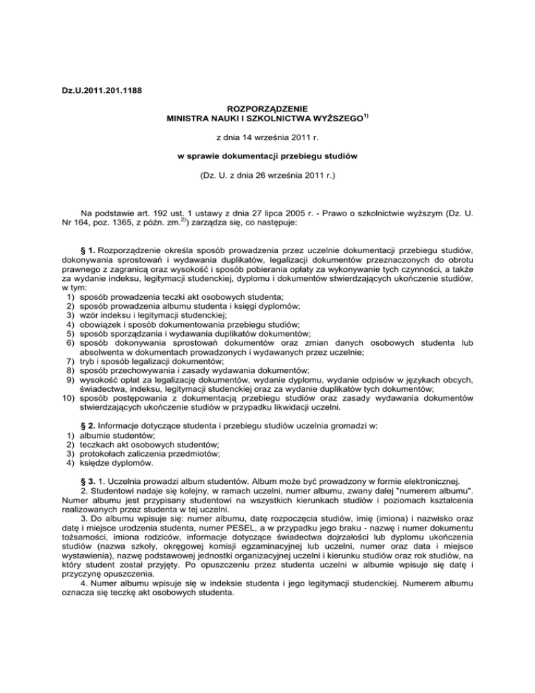 Dz.U.2011.201.1188 ROZPORZĄDZENIE 1) MINISTRA NAUKI I SZKOLNICTWA WYśSZEGO z dnia 14 września 2011 r. w sprawie dokumentacji przebiegu studiów (Dz. U. z dnia 26 września 2011 r.) Na podstawie art. 192 ust. 1 ustawy z dnia 27 lipca 2005 r. - Prawo o szkolnictwie wyŜszym (Dz. U. 2) Nr 164, poz. 1365, z późn. zm. ) zarządza się, co następuje: § 1. Rozporządzenie określa sposób prowadzenia przez uczelnie dokumentacji przebiegu studiów, dokonywania sprostowań i wydawania duplikatów, legalizacji dokumentów przeznaczonych do obrotu prawnego z zagranicą oraz wysokość i sposób pobierania opłaty za wykonywanie tych czynności, a takŜe za wydanie indeksu, legitymacji studenckiej, dyplomu i dokumentów stwierdzających ukończenie studiów, w tym: 1) sposób prowadzenia teczki akt osobowych studenta; 2) sposób prowadzenia albumu studenta i księgi dyplomów; 3) wzór indeksu i legitymacji studenckiej; 4) obowiązek i sposób dokumentowania przebiegu studiów; 5) sposób sporządzania i wydawania duplikatów dokumentów; 6) sposób dokonywania sprostowań dokumentów oraz zmian danych osobowych studenta lub absolwenta w dokumentach prowadzonych i wydawanych przez uczelnie; 7) tryb i sposób legalizacji dokumentów; 8) sposób przechowywania i zasady wydawania dokumentów; 9) wysokość opłat za legalizację dokumentów, wydanie dyplomu, wydanie odpisów w językach obcych, świadectwa, indeksu, legitymacji studenckiej oraz za wydanie duplikatów tych dokumentów; 10) sposób postępowania z dokumentacją przebiegu studiów oraz zasady wydawania dokumentów stwierdzających ukończenie studiów w przypadku likwidacji uczelni. 1) 2) 3) 4) § 2. Informacje dotyczące studenta i przebiegu studiów uczelnia gromadzi w: albumie studentów; teczkach akt osobowych studentów; protokołach zaliczenia przedmiotów; księdze dyplomów. § 3. 1. Uczelnia prowadzi album studentów. Album moŜe być prowadzony w formie elektronicznej. 2. Studentowi nadaje się kolejny, w ramach uczelni, numer albumu, zwany dalej "numerem albumu". Numer albumu jest przypisany studentowi na wszystkich kierunkach studiów i poziomach kształcenia realizowanych przez studenta w tej uczelni. 3. Do albumu wpisuje się: numer albumu, datę rozpoczęcia studiów, imię (imiona) i nazwisko oraz datę i miejsce urodzenia studenta, numer PESEL, a w przypadku jego braku - nazwę i numer dokumentu toŜsamości, imiona rodziców, informacje dotyczące świadectwa dojrzałości lub dyplomu ukończenia studiów (nazwa szkoły, okręgowej komisji egzaminacyjnej lub uczelni, numer oraz data i miejsce wystawienia), nazwę podstawowej jednostki organizacyjnej uczelni i kierunku studiów oraz rok studiów, na który student został przyjęty. Po opuszczeniu przez studenta uczelni w albumie wpisuje się datę i przyczynę opuszczenia. 4. Numer albumu wpisuje się w indeksie studenta i jego legitymacji studenckiej. Numerem albumu oznacza się teczkę akt osobowych studenta. § 4. 1. Uczelnia zakłada teczkę akt osobowych studenta, w której przechowuje się: 1) dokumenty wymagane od kandydata na studia, w tym: a) poświadczoną przez uczelnię kopię świadectwa dojrzałości, a w przypadku kandydata na studia drugiego stopnia - równieŜ poświadczoną przez uczelnię kopię dyplomu ukończenia studiów, b) ankietę osobową zawierającą imię (imiona) i nazwisko, datę i miejsce urodzenia, numer PESEL, a w przypadku jego braku - nazwę i numer dokumentu toŜsamości, adres zamieszkania oraz adres do korespondencji, c) poświadczoną przez uczelnię kopię dowodu osobistego lub innego dokumentu potwierdzającego toŜsamość kandydata na studia w przypadku kandydatów na studia będących cudzoziemcami, d) aktualną fotografię kandydata, zgodną z wymaganiami obowiązującymi przy wydawaniu dowodów osobistych, e) oświadczenie o spełnianiu warunków do podjęcia i kontynuowania studiów bez wnoszenia opłat, o którym mowa w art. 170a ust. 9 ustawy z dnia 27 lipca 2005 r. - Prawo o szkolnictwie wyŜszym, zwanej dalej "ustawą" - w przypadku kandydata na studia stacjonarne w uczelni publicznej; 2) dokumenty postępowania kwalifikacyjnego stanowiące podstawę do podjęcia decyzji o przyjęciu na studia; 3) kopię decyzji o przyjęciu na studia oraz oryginał potwierdzenia jej doręczenia; 4) podpisany przez studenta akt ślubowania; 5) umowę lub kopię umowy zawartej ze studentem, o której mowa w art. 160 ust. 3 ustawy; 6) potwierdzenie odbioru legitymacji studenckiej i indeksu, jeŜeli regulamin studiów przewiduje dokumentowanie przebiegu studiów w indeksie, a takŜe ich duplikatów; 7) karty okresowych osiągnięć studenta; 8) decyzje władz uczelni dotyczące przebiegu studiów, w szczególności: udzielonych urlopów, powtarzania roku, skreślenia z listy studentów, a takŜe nagród, wyróŜnień i kar dyscyplinarnych; 9) dokumenty dotyczące przyznania studentowi pomocy materialnej; 10) oświadczenia o niepobieraniu świadczeń na innym kierunku, o których mowa w art. 184 ust. 7 ustawy; 11) jeden egzemplarz pracy dyplomowej; 12) recenzję (recenzje) pracy dyplomowej; 13) protokół egzaminu dyplomowego; 14) dyplom ukończenia studiów - egzemplarz do akt; 15) suplement do dyplomu - egzemplarz do akt; 16) potwierdzenie odbioru dyplomu i jego odpisów, suplementu do dyplomu, a takŜe duplikatu dyplomu lub duplikatu suplementu do dyplomu przez osobę odbierającą dyplom. 2. Teczkę akt osobowych studenta przechowuje się w archiwum uczelni przez okres 50 lat. § 5. 1. W przypadku przeniesienia się studenta do innej uczelni, dokumenty dotyczące przebiegu studiów przesyła się do uczelni, do której student się przeniósł, na wniosek tej uczelni. 2. W uczelni, którą student opuścił, w teczce akt osobowych studenta pozostaje kopia pisma, przy którym przesłano dokumenty oraz ich wykaz. § 6. 1. Po immatrykulacji student otrzymuje: 1) indeks, którego wzór jest określony w załączniku nr 1 do rozporzą