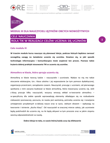 MODUŁ III DLA NAUCZYCIELI JĘZYKÓW OBCYCH NOWOŻYTNYCH CELE NAUCZANIA ROLA TIK W REALIZACJI CELÓW UCZENIA SIĘ UCZNIÓW ANIA. Cele modułu III W trzecim module kursu nauczysz się planować lekcje, podczas których będziesz zwracać szczególną uwagę na świadome uczenie się uczniów. Dowiesz się, w jaki sposób technologia informacyjna i komunikacyjna może wspierać ten proces. Poznasz także kryteria dobrej praktyki stosowania TIK w uczeniu się uczniów. Atmosfera w klasie, która sprzyja uczeniu się Atmosferę w klasie tworzą ludzie – nauczyciele i uczniowie. Wpływ na nią ma także otoczenie edukacyjne, tzn.: klasa szkolna i jej wyposażenie (w tym pomoce dydaktyczne), organizacja przestrzeni, zarządzanie czasem. Nauczyciel, pracując z uczniami, od pierwszego spotkania z nimi zaczyna budować w klasie atmosferę, która towarzyszy uczeniu się. Jeśli z klasą pracuje kilku nauczycieli, wszyscy wnoszą wkład w tworzenie atmosfery – w specyficzny dla siebie sposób wprowadzają elementy składające się na rozbudzanie ciekawości poznawczej, poczucia, że nauka jest wartością, potrzeby uczenia się i rozwijania umiejętności przydatnych w dalszej nauce oraz w życiu. Jednym słowem – wpływają na tworzenie i istnienie „ducha klasy”. Od nauczycieli w znacznej mierze zależy, jak uczniowie będą podchodzili do uczenia się, na ile będą aktywni w tym procesie oraz w jakim stopniu wezmą odpowiedzialność za naukę. Dobra lekcja to taka, w czasie której każdy uczy się efektywnie 1 W bieżącym module zajmiesz się zasadami planowania dobrej lekcji angażującej uczniów w kształcenie umiejętności językowych. Zanim zaczniesz wprowadzać technologię informacyjną, warto uświadomić sobie, że nie ma dobrego nauczania bez pokazywania uczniom sensu uczenia się i użyteczności wiedzy, którą zdobywają na konkretnej lekcji, bez monitorowania postępów uczniów oraz podsumowania tego, czego się nauczyli. Dobre, a więc skuteczne, nauczanie polega na osiąganiu celów kształcenia w obszarze wiedzy, umiejętności i postaw, które określone zostały w podstawie programowej. Uczniowie nie zawsze są zainteresowani osiąganiem celów lekcji na równi z nauczycielem. Jest tak głównie dlatego, że ich nie znają. Chodzi o to, by uczniowie byli świadomi celów lekcji, by wiedzieli, po czym rozpoznać, że je osiągają, oraz by zdawali sobie sprawę, po co stosują technologię informacyjną i jak poprawia ona proces uczenia się? Dla ciebie istotne będzie, jak TIK może ułatwić i przyspieszyć osiąganie celów edukacyjnych oraz czy technologia może być bardziej skuteczna dydaktycznie, niż narzędzia wykorzystywane do tej pory. Trzeba przyglądać się wnikliwie, czy nie jest stosowana tylko dla siebie samej lub po to, by przypisać jej rolę tradycyjnych narzędzi dydaktycznych, których użycie być może byłoby skuteczniejsze. Prezentowane poniżej treści dotyczą podejścia do nauczania nazywanego Ocenianiem Kształtującym (często będziemy używać po prostu skrótu OK). Czytając, warto na bieżąco poddawać refleksji swoją dotychczasową praktykę nauczycielską – jakie rozwiązania już stosujesz, a co nowego możesz wprowadzić do swojej pracy. Wiemy, że bardzo wielu nauczycieli prowadzi lekcje zgodnie z ideą OK, choć wcale nie nazywa tego Ocenianiem Kształtującym. Dotychczasowa wiedza ucznia i jej znaczenie dla osiągania celów lekcji Kiedy przystępujesz do planowania lekcji, wiesz, co z podstawy programowej do tej pory zostało „przerobione” i jaką wiedzę oraz umiejętności powinni posiadać twoi uczniowie z zajęć, które odbyły się np. w minionym tygodniu, miesiącu czy w poprzednich klasach. Na tym zazwyczaj opierasz cele nowej lekcji i określasz kryteria ich osiągnięcia. W trakcie lekcji zdarza się jednak, że część uczniów nie pamięta wcześniej przekazanych informacji lub nie 2 ma opanowanych umiejętności niezbędnych do kształcenia kolejnych, które przewidziałaś/eś na bieżące zajęcia. Pojawia się zagrożenie, że cele nie zostaną osiągnięte. Jest to sytuacja trudna dla nauczyciela, a jeszcze trudniejsza dla uczniów. Jeśli nie są oni w stanie przyswajać nowych informacji, rozumować i wykorzystywać dostarczanej im wiedzy, często wyłączają się z lekcji i nie robią postępów. Zdarza się też, że uczniowie przechowują wcześniej nabytą wiedzę w zakamarkach mózgu i samodzielnie nie wydobywają jej stamtąd, ponieważ nie zauważają związku tego, co już wiedzą, z tym, czym zajmują się aktualnie. Jeszcze większym kłopotem dla nich jest znalezienie łączności między treściami, którymi zajmowali się na zajęciach z innych przedmiotów lub poznali poza szkołą, a bieżącym tematem. W takich sytuacjach trzeba im pomóc w uruchomieniu potrzebnej wiedzy i uświadomieniu jej ciągłości. Na początku każdej lekcji i w czasie jej przebiegu przywołuj dotychczasową wiedzę i doświadczenia uczniów. Zaktywizowanie jej będzie procentować w dalszym przebiegu zajęć. Nie tylko pokażesz uczniom związek między tym, co już znają, a tym, co będzie nowe, lecz także dasz im poczucie bezpieczeństwa i ładu. Sprawisz też, że wiedza i umiejętności będą odbierane jako użyteczne, uporządkowane, spójne, powiązane ze sobą oraz możliwe do wykorzystania w różnych kombinacjach. Aby to zrobić, możesz na przykład powiedzieć: Na wcześniejszych lekcjach dowiedzieliście się, że ……………, dzisiaj wykorzystacie tę wiedzę do …………… . Potraficie już sprawnie …………… i …………… . W czasie bieżącej lekcji te umiejętności będą wam potrzebne do tego, żebyście nauczyli się …………… . Nauczyliście się już kiedyś ……………, …………… i …………… . Na tej wiedzy i umiejętnościach będziecie opierać to, co zrobicie teraz. To, co już znacie z poprzednich lekcji, czyli ……………, j