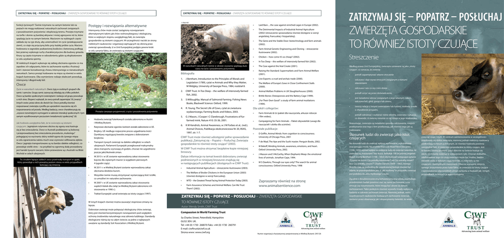 ZATRZYMAJ SIĘ POPATRZ POSŁUCHAJ ZWIERZĘTA GOSPODARSKIE TO RÓWNIEŻ ISTOTY CZUJĄCE ZATRZYMAJ SIĘ POPATRZ POSŁUCHAJ ZWIERZĘTA GOSPODARSKIE TO RÓWNIEŻ ISTOTY CZUJĄCE © Rob Hill funkcji życiowych”. Świnie trzymane na samym betonie lub na prętach nie mogą realizować naturalnych zachowań związanych z poszukiwaniem pożywienia i eksploracją terenu. Prosięta trzymane na torfie i słomie są bardziej aktywne i mniej agresywne niż te, które spędzają życie na samym betonie. Maciorom na wybiegach często zakłada się na ryje druty, aby uniemożliwić im rycie (przekopywanie ziemi), co staje się przyczyną bólu przy każdej próbie rycia. Maciora hodowana w zagrodzie pozbawionej bodźców z betonową podłogą bez przerwy wykonuje ruchy charakterystyczne dla budowy gniazda. Knury są często trzymane w odosobnieniu gdzie są eksploatowane w celu uzyskania spermy. Postępy i rozwiązania alternatywne • Laid Bare ... the case against enriched cages in Europe (2002). Intensywny chów może zostać zastąpiony rozwiązaniami alternatywnymi takimi jak chów wolnowybiegowy i ekologiczny, które w większym stopniu uwzględniają fakt, że zwierzęta gospodarskie są istotami czującymi. W szczególności naciski ze strony niektórych naukowców i organizacji zajmujących się obroną praw zwierząt spowodowały, iż w Unii Europejskiej podjęto pewne kroki w celu uznania faktu, że zwierzęta są istotami czującymi: • The Detrimental Impacts of Industrial Animal Agriculture (2002) (streszczenie sprawozdania również dostępne w wersji angielskiej, francuskiej i hiszpańskiej). • The Gene and the Stable Door: biotechnology and farm animals (2002). • Farm Animal Genetic Engineering and Cloning – streszczenie ilustrowane (2002). • Chicken – how come it’s so cheap? (2002). • In Too Deep – the welfare of intensively farmed fish (2002). • The Case against the Veal Create (2001). • Raising the Standard: Supermarkets and Farm Animal Welfare (2001). © Colin Seddon W niektórych krajach wykonuje się zabieg obcinania ogonów co ma zapobiec ich odgryzaniu, które to zachowanie wynika z frustracji świń i stanowi konsekwencję chowu intensywnego w nienaturalnych warunkach. Samce prosiąt hodowane na mięso są również w wielu krajach kastrowane. Oba wymienione rodzaje okaleczeń powodują intensywny i długotrwały ból. W warunkach naturalnych świnie w okresie czuwania spędzają dużo czasu na ryciu i poszukiwaniu pożywienia. Bibliografia J Bentham, Introduction to the Principles of Morals and Legislation (1789), cytat w Animals and Why they Matter, M Midgley, University of Georgia Press, 1984, rozdział 8. • Live Exports: a cruel and archaic trade (2000). • The Welfare of Europe’s Sows in Close Confinement Stalls (2000). CIWF Trust. In Too Deep – the welfare of intensively farmed fish, 2002. • Animal Welfare Problems in UK Slaughterhouses (2000). • Brittle Bones: Osteoporosis and the Battery Cage (1999). 3. S Willoughby. Manual of Salmonid Farming. Fishing News Books, Blackwell Science: Oxford, 1999. • „For Their Own Good”: a study of farm animal mutilations (1994). 4. R. Young, The Secret Life of Cows, cytat ze zwiastuna wydawniczego, Farming Books and Videos, 2003. Dla szkół i college’ów: 5. G J Mason, J Cooper i C Clarebrough, Frustrations of furfarmed mink, Nature 410: 35-36, 2001. 1. Owce Życie w warunkach naturalnych. Owce żyją w osobnych grupach dla samic i samców. Grupy samic zazwyczaj składają się z kilku pokoleń. Owce są bardzo społecznymi zwierzętami i izolacja od grupy powoduje u nich stres. Eksperci wykazali, że owca potrafi zapamiętać 50 „twarzy” innych owiec przez okres do dwóch lat. Owce potrafią również rozpoznawać zwierzęta z profilu po uprzednim nauczeniu się ich rozpoznawania od przodu. Według badaczy, owce charakteryzują się „wysoce rozwiniętymi wymogami w zakresie interakcji społecznych i tym samym wyrafinowanym poczuciem świadomości społecznej”. (6) 2. Prosięta czerpiące przyjemność z rycia i poszukiwania pożywienia • Jak hodowla uwzględnia fakt, że te zwierzęta są istotami czującymi. Jagniętom rutynowo obcina się ogony oraz kastruje się je bez znieczulenia. Owce w Australii poddawane są bolesnej i przeprowadzanej bez znieczulenia procedurze „mulesingu” polegającej na wycinaniu skóry wokół ogona do żywego mięsa w celu ograniczenia nalotu much oraz czynności szlifowania zębów. Owce i jagnięta transportowane są na bardzo dalekie odległości, co powoduje wielki stres – na przykład na ogromną skalę prowadzony jest handel żywymi owcami, które przewożone są z Australii na Bliski Wschód w celach ubojowych. Hodowla zwierząt futerkowych została zabroniona w Austrii i Wielkiej Brytanii. • Rutynowe obcinanie ogonów świniom zostało zabronione w UE. • Brojlery. UE niedługo rozpocznie proces uzgadniania treści Dyrektywy regulującej kwestie związane z dobrostanem brojlerów. • Transport żywych zwierząt na dalekie odległości w celach ubojowych. Parlament Europejski przegłosował maksymalny okres transportu wynoszący 8 godzin, chociaż nie uzgodniono jeszcze jakichkolwiek zmian. 6. K M Kendrick, Animal Awareness, w J M Forbes et al., (red.), Animal Choices, Publikacja okolicznościowa Nr 20, BSAS, 1997, str. 1-7. CIWF Trust może również udostępnić pełne sprawozdanie publikacji „Zatrzymaj się – Popatrz – Posłuchaj: Zwierzęta gospodarskie to również istoty czujące” (2003). W CIWF Trust można otrzymać bezpłatne kopie niniejszej broszury. W 2013 r. w UE zostanie wprowadzony zakaz stosowania kojców dla ciężarnych macior (z wyjątkiem pierwszych 4 tygodni ciąży). Dalsze informacje na temat kwestii dobrostanu zwierząt podniesionych w niniejszej broszurze znajdują się w następujących publikacjach (dostępnych w CIWF Trust): • W 2011 r. w Wielkiej Brytanii zostanie wprowadzony zakaz obcinania dziobów