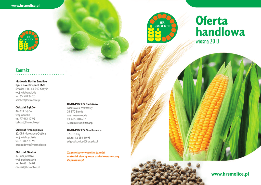 www.hrsmolice.pl Oferta handlowa wiosna 2013 Kontakt: Hodowla Roślin Smolice Sp. z o.o. Grupa IHAR Smolice 146, 63-740 Kobylin woj. wielkopolskie tel. 65 548 24 20 [email protected] Oddział Bąków 46-233 Bąków woj. opolskie tel. 77 413 17 92 [email protected] IHAR-PIB ZD Radzików Radzików k. Warszawy 05-870 Błonie woj. mazowieckie tel. 605 310 637 [email protected] Oddział Przebędowo 62-095 Murowana Goślina woj. wielkopolskie tel. 61 812 23 95 [email protected] IHAR-PIB ZD Grodkowice 32-015 Kłaj tel./fax 12 284 10 95 [email protected] Oddział Ożańsk 37-500 Jarosław woj. podkarpackie tel. 16 621 54 02 [email protected] Zapewniamy wysokiej jakości materiał siewny oraz umiarkowane ceny. Zapraszamy! www.hrsmolice.pl Przebędowo: Oferta handlowa wiosna 2013 jęczmień jary: Rubinek, Ryton, Eunova pszenica jara: Ostka Smolicka pszenżyto jare: Dublet owies: Zuch, Koneser proso: Jagna groch: Milwa, Muza, Medal, Model, Mentor, Mecenas Smolice kukurydza: Wilga, Cedro, Fido, Baca, Wiarus, Prosna, Dumka, Smok, Glejt, Boruta, Reduta, Bejm, Tur, Narew, Opoka, Lober, San, Bułat, Buran, Blask, Kozak, Wigo, Nimba, Jawor, Kresowiak, Smolik, Rataj, Rywal, Smolitop, Vitras, Lokata, Smolan, Ułan, Skarb pszenica jara: Ostka Smolicka łubin wąskolistny: Zeus, Boruta, Graf, Kalif, Bojar, Regent, Dalbor, Oskar łubin żółty: Parys, Lord, Perkoz łubin biały: Butan, Boros Radzików: jęczmień: Rubinek, Bryl pszenica jara: Raweta żyto jare: Bojko jęczmień jary: Rubinek, Rufus, Raskud gorczyca biała: Bamberka, Warta łubin wąskolistny: Kalif Bąków Grodkowice: jeczmień jary: Boss, Bryl, Blask, Basza, Bordo pszenica jara: Ostka Smolicka, Parabola pszenica jara: Ostka Smolicka Ożańsk: pszenica jara: Werbena kukurydza: San, Blask, Kresowiak, Reduta