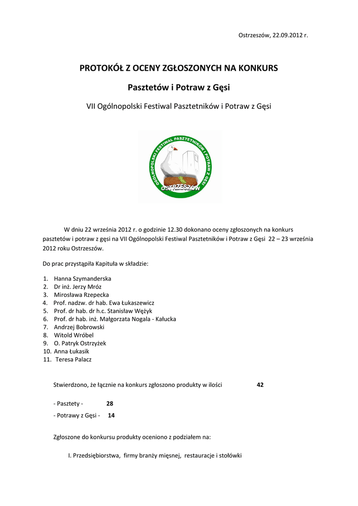 PROTOKÓŁ Z OCENY ZGŁOSZONYCH NA KONKURS Pasztetów i