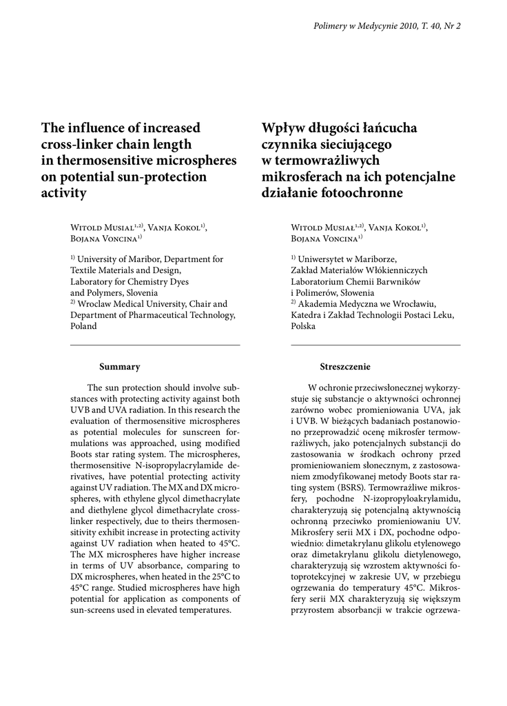 Polimery w Medycynie 2010, T. 40, Nr 2 The influence of increased cross-linker chain length in thermosensitive microspheres on potential sun-protection activity Wpływ długości łańcucha czynnika sieciującego w termowrażliwych mikrosferach na ich potencjalne działanie fotoochronne Witold Musial1,2), Vanja Kokol1), Bojana Voncina1) Witold Musiał1,2), Vanja Kokol1), Bojana Voncina1) University of Maribor, Department for Textile Materials and Design, Laboratory for Chemistry Dyes and Polymers, Slovenia 2) Wroclaw Medical University, Chair and Department of Pharmaceutical Technology, Poland Uniwersytet w Mariborze, Zakład Materiałów Włókienniczych Laboratorium Chemii Barwników i Polimerów, Słowenia 2) Akademia Medyczna we Wrocławiu, Katedra i Zakład Technologii Postaci Leku, Polska 1) Summary The sun protection should involve substances with protecting activity against both UVB and UVA radiation. In this research the evaluation of thermosensitive microspheres as potential molecules for sunscreen formulations was approached, using modified Boots star rating system. The microspheres, thermosensitive N-isopropylacrylamide derivatives, have potential protecting activity against UV radiation. The MX and DX microspheres, with ethylene glycol dimethacrylate and diethylene glycol dimethacrylate crosslinker respectively, due to theirs thermosensitivity exhibit increase in protecting activity against UV radiation when heated to 45°C. The MX microspheres have higher increase in terms of UV absorbance, comparing to DX microspheres, when heated in the 25°C to 45°C range. Studied microspheres have high potential for application as components of sun-screens used in elevated temperatures. 1) Streszczenie W ochronie przeciwsłonecznej wykorzystuje się substancje o aktywności ochronnej zarówno wobec promieniowania UVA, jak i UVB. W bieżących badaniach postanowiono przeprowadzić ocenę mikrosfer termowrażliwych, jako potencjalnych substancji do zastosowania w środkach ochrony przed promieniowaniem słonecznym, z zastosowaniem zmodyfikowanej metody Boots star rating system (BSRS). Termowrażliwe mikrosfery, pochodne N-izopropyloakrylamidu, charakteryzują się potencjalną aktywnością ochronną przeciwko promieniowaniu UV. Mikrosfery serii MX i DX, pochodne odpowiednio: dimetakrylanu glikolu etylenowego oraz dimetakrylanu glikolu dietylenowego, charakteryzują się wzrostem aktywności fotoprotekcyjnej w zakresie UV, w przebiegu ogrzewania do temperatury 45°C. Mikrosfery serii MX charakteryzują się większym przyrostem absorbancji w trakcie ogrzewa- 48 Witold Musial et al. Key words: thermosensitive microspheres, ethylene glycol dimethacrylate, diethylene glycol dimethacrylate, ultraviolet radiation, sun-screen INTRODUCTION The ultraviolet radiation (UV) presents specific activity, when directed on the skin. When the skin is overexposed to this factor, the sunburns, increased risk of skin cancers, and premature aging of the skin are noted [1]. The UV radiation is divided into two sections: UVA radiation; wavelength 320–400 nm, and UVB radiation; wavelength 290–320 nm. Photobiological activity seems to be more intense in the case of shorter wavelength, i.e. at 330–340 nm, so the UVA was subdivided in UVAI and UVAII sections, with ranges respectively: 340–400 nm and 320– 340 nm. On the ground level the living cells are radiated in ca. 95% by UVA and only in ca. 5% by UVB, due to the photoprotecting activity of stratospheric ozone layer [2]. The subsection UVC with wavelength between 200 and 290 nm is observed only on very high attitudes [3]. Overexposure to UVB radiation results in good known erythema – sunburns. Also some of basal and squamous cell carcinomas are connected with direct damage of genetic material by UVB, as this kind of radiation is highly mutagenic according to the fact that nucleic acid is a chromophore for the 290–320 nm range [4]. The UVA radiation does not give directly observed effects – however due to numerous data, it may contribute to DNA damage, through the initiation of production of free radicals and reactive oxygen species. This changes may lead to increased rate of melanoma [5,6]. On the molecular level numerous factors are engaged in the biological answer to the UV radiation applied on the skin. The mitogen-activated protein kinase pathways have its role in defending the epidermis and epidermal keratinocytes from ultraviolet radiation considered to be one of the the most common and highly carcinogenic environmental stress [7]. Interestingly, the UVA and UVB radiation stimulates the expression of cyclooxygenase-2 in epidermal cells [8]. The sun protection should involve substances with protecting activity against both UVB and UVA radiation. Also the preliminary tests should reflect this aspect of characteristics of potential protective nia od 25oC do 45°C, w porównaniu z mikrosferami serii DX. Badane mikrosfery mogą znależć zastosowanie jako preparaty światłoochronne, stosowane w podwyższonych temperaturach. Słowa kluczowe: mikrosfery termowrażliwe, dimetakrylanu glikolu etylenowego, dimetakrylanu glikolu dietylenowego, promieniowanie ultrafioletowe, preparaty przeciwsłoneczne WPROWADZENIE Promieniowanie ultrafioletowe (UV) charakteryzuje się specyficzną aktywnością wobec skóry. Nadmierna ekspozycja skóry na ten czynnik środowiskowy może powodować oparzenia słoneczne, podwyższone ryzyko zachorowania na raka skóry, oraz przedwczesne starzenie skóry [1]. Promieniowanie UV dzieli się na dwa zakresy: promieniowanie UVA o długości fali 320–400 nm, oraz promieniowanie UVB o długości fali 290–320 nm. Aktywność fotobiologiczna jest prawdopodobnie bardziej intensywna przy krótszych długościach fali, tj. w zakresie 330–340 nm, stąd zakres UVA podzielono na podzakresy UVAI, oraz UVAII, odpowiednio: 330–400 nm i 320–340 nm. Na powierzchni ziemi komórki żywych organizmów naświetlane są w ok. 95% prz
