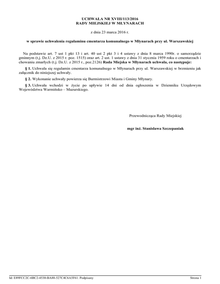 UCHWAŁA NR XVIII/113/2016 RADY MIEJSKIEJ W MŁYNARACH z dnia 23 marca 2016 r. w sprawie uchwalenia regulaminu cmentarza komunalnego w Młynarach przy ul. Warszawskiej Na podstawie art. 7 ust 1 pkt 13 i art. 40 ust 2 pkt 3 i 4 ustawy z dnia 8 marca 1990r. o samorządzie gminnym (t.j. Dz.U. z 2015 r. poz. 1515) oraz art. 2 ust. 1 ustawy z dnia 31 stycznia 1959 roku o cmentarzach i chowaniu zmarłych (t.j. Dz.U. z 2015 r., poz.2126) Rada Miejska w Młynarach uchwala, co następuje: § 1. Uchwala się regulamin cmentarza komunalnego w Młynarach przy ul. Warszawskiej w brzmieniu jak załącznik do niniejszej uchwały. § 2. Wykonanie uchwały powierza się Burmistrzowi Miasta i Gminy Młynary. § 3. Uchwała wchodzi w życie po upływie 14 dni od dnia ogłoszenia w Dzienniku Urzędowym Województwa Warmińsko – Mazurskiego. Przewodnicząca Rady Miejskiej mgr inż. Stanisława Szczepaniak Id: E89FCC2C-6BC2-4530-BA88-527C4C6A5F61. Podpisany Strona 1 XVIII/113/2016 z dnia 23 marca 2016 roku REGULAMIN CMENTARZA KOMUNALNEGO . komunalny. Burmistrz Miasta i Gminy 3. przy ul. Dworcowej 29, 14godz.15:30. wania terenu . 1 Cmentarz otwarty jest: - ia, w godzinach od 8:00 do 22:00, - od godz. 8:00 do 18:00 - od godz. 8:00 do 15:00 w dni powszednie. . ii . 1) wymiary grobu ziemnego: 0,4 m, nad . 4. Nad grobami m powierzchni grobu. Id: E89FCC2C-6BC2-4530-BA88-527C4C6A5F61. Podpisany Strona 1 5. Miejsce zarezerwowane (wykupione) . -tu lat od daty miejsce na cmentarzu. 6. Groby nie do owanych i rodzinny . 2. Domem przedpogrzebowym jest kaplica przycmentarna. . 3. Kart przez co najmniej 50 lat. . . Id: E89FCC2C-6BC2-4530-BA88-527C4C6A5F61. Podpisany Strona 2 . , em. wymienionych w ust. 1 i 2. s . al rzewostanu, ogrodzenia cmentarza, punktu czerpalnego wody oraz systematyczne . wyznaczonych. zlokalizowanych na terenie cmentarza. .Z 1) przebywania poza godzinami otwarcia, niszczenia zieleni cmentarnej i : , 6) prowadzenia handlu i reklamy, 9) jazdy na rowerach i i 10) . - 2. Id: E89FCC2C-6BC2-4530-BA88-527C4C6A5F61. Podpisany Strona 3 . 3. W przypadku stwierdzenia przez wiono nagrobek lub . 1. Wszystkie miejsca zarezerwowane (wykupione - rawienie pogrzebu . nym miejscu na terenie cmentarza. . e . aminu. Po tym terminie nie miejsca idowane. . . Id: E89FCC2C-6BC2-4530-BA88-527C4C6A5F61. Podpisany Strona 4