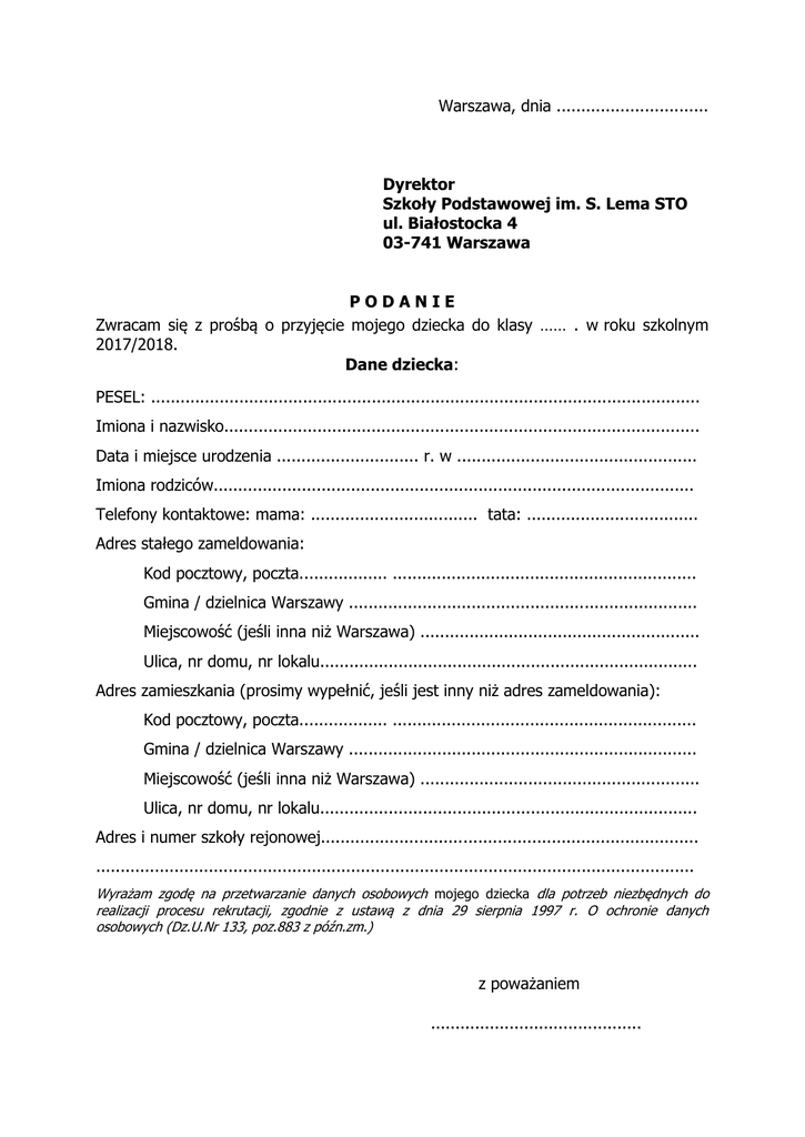 Warszawa, dnia ............................... Dyrektor Szkoły Podstawowej im. S. Lema STO ul. Białostocka 4 03-741 Warszawa PODANIE Zwracam się z prośbą o przyjęcie mojego dziecka do klasy …… . w roku szkolnym 2017/2018. Dane dziecka: PESEL: ................................................................................................................ Imiona i nazwisko................................................................................................. Data i miejsce urodzenia ............................. r. w ................................................. Imiona rodziców.................................................................................................. Telefony kontaktowe: mama: .................................. tata: ................................... Adres stałego zameldowania: Kod pocztowy, poczta.................. .............................................................. Gmina / dzielnica Warszawy ....................................................................... Miejscowość (jeśli inna niż Warszawa) ......................................................... Ulica, nr domu, nr lokalu............................................................................. Adres zamieszkania (prosimy wypełnić, jeśli jest inny niż adres zameldowania): Kod pocztowy, poczta.................. .............................................................. Gmina / dzielnica Warszawy ....................................................................... Miejscowość (jeśli inna niż Warszawa) ......................................................... Ulica, nr domu, nr lokalu............................................................................. Adres i numer szkoły rejonowej............................................................................. .......................................................................................................................... Wyrażam zgodę na przetwarzanie danych osobowych mojego dziecka dla potrzeb niezbędnych do realizacji procesu rekrutacji, zgodnie z ustawą z dnia 29 sierpnia 1997 r. O ochronie danych osobowych (Dz.U.Nr 133, poz.883 z późn.zm.) z poważaniem ...........................................