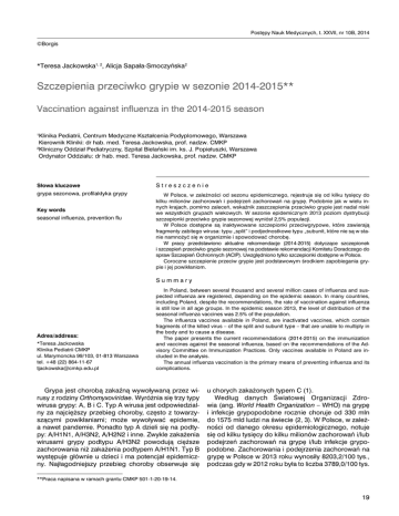 Postępy Nauk Medycznych, t. XXVII, nr 10B, 2014 ©Borgis *Teresa Jackowska1, 2, Alicja Sapała-Smoczyńska2 Szczepienia przeciwko grypie w sezonie 2014-2015** Vaccination against influenza in the 2014-2015 season 1 Klinika Pediatrii, Centrum Medyczne Kształcenia Podyplomowego, Warszawa Kierownik Kliniki: dr hab. med. Teresa Jackowska, prof. nadzw. CMKP 2 Kliniczny Oddział Pediatryczny, Szpital Bielański im. ks. J. Popiełuszki, Warszawa Ordynator Oddziału: dr hab. med. Teresa Jackowska, prof. nadzw. CMKP Słowa kluczowe Streszczenie grypa sezonowa, profilaktyka grypy W Polsce, w zależności od sezonu epidemicznego, rejestruje się od kilku tysięcy do kilku milionów zachorowań i podejrzeń zachorowań na grypę. Podobnie jak w wielu innych krajach, pomimo zaleceń, wskaźnik zaszczepienia przeciwko grypie jest nadal niski we wszystkich grupach wiekowych. W sezonie epidemicznym 2013 poziom dystrybucji szczepionki przeciwko grypie sezonowej wyniósł 2,5% populacji. W Polsce dostępne są inaktywowane szczepionki przeciwgrypowe, które zawierają fragmenty zabitego wirusa: typu „split” i podjednostkowe typu „subunit, które nie są w stanie namnożyć się w organizmie i spowodować chorobę. W pracy przedstawiono aktualne rekomendacje (2014-2015) dotyczące szczepionek i szczepień przeciwko grypie sezonowej na podstawie rekomendacji Komitetu Doradczego do spraw Szczepień Ochronnych (ACIP). Uwzględniono tylko szczepionki dostępne w Polsce. Coroczne szczepienie przeciw grypie jest podstawowym środkiem zapobiegania grypie i jej powikłaniom. Key words seasonal influenza, prevention flu Summary Adres/address: *Teresa Jackowska Klinika Pediatrii CMKP ul. Marymoncka 99/103, 01-813 Warszawa tel. +48 (22) 864-11-67 [email protected] In Poland, between several thousand and several million cases of influenza and suspected influenza are registered, depending on the epidemic season. In many countries, including Poland, despite the recommendations, the rate of vaccination against influenza is still low in all age groups. In the epidemic season 2013, the level of distribution of the seasonal influenza vaccines was 2.5% of the population. The influenza vaccines available in Poland, are inactivated vaccines, which contain fragments of the killed virus – of the split and subunit type – that are unable to multiply in the body and to cause a disease. The paper presents the current recommendations (2014-2015) on the immunization and vaccines against the seasonal influenza, based on the recommendations of the Advisory Committee on Immunization Practices. Only vaccines available in Poland are included in the analysis. The annual influenza vaccination is the primary means of preventing influenza and its complications. Grypa jest chorobą zakaźną wywoływaną przez wirusy z rodziny Orthomyxoviridae. Wyróżnia się trzy typy wirusa grypy: A, B i C. Typ A wirusa jest odpowiedzialny za najcięższy przebieg choroby, często z towarzyszącymi powikłaniami; może wywoływać epidemie, a nawet pandemie. Ponadto typ A dzieli się na podtypy: A/H1N1, A/H3N2, A/H2N2 i inne. Zwykle zakażenia wirusami grypy podtypu A/H3N2 powodują cięższe zachorowania niż zakażenia podtypem A/H1N1. Typ B występuje głównie u dzieci i ma potencjał epidemiczny. Najłagodniejszy przebieg choroby obserwuje się u chorych zakażonych typem C (1). Według danych Światowej Organizacji Zdrowia (ang. World Health Organization – WHO) na grypę i infekcje grypopodobne rocznie choruje od 330 mln do 1575 mld ludzi na świecie (2, 3). W Polsce, w zależności od danego okresu epidemiologicznego, notuje się od kilku tysięcy do kilku milionów zachorowań i/lub podejrzeń zachorowań na grypę i/lub infekcje grypopodobne. Zachorowania i podejrzenia zachorowań na grypę w Polsce w 2013 roku wynosiły 8203,2/100 tys., podczas gdy w 2012 roku była to liczba 3789,0/100 tys. **Praca napisana w ramach grantu CMKP 501-1-20-19-14. 19 Teresa Jackowska, Alicja Sapała-Smoczyńska Najwyższe zachorowania odnotowano u dzieci w wieku od 0-14 lat – 24172,0/100 tys. w 2013 roku (4). Coroczne szczepienie przeciwko grypie stanowi najlepszą profilaktykę. Inaktywowane szczepionki zapobiegają zachorowaniu na grypę u 70-90% dzieci i dorosłych poniżej 65. roku życia. W Polsce w 2013 roku zaszczepiło się przeciw grypie 2,5% osób – najwięcej powyżej 65. roku życia (ok. 7,5%), najmniej dzieci w wieku od 0-4 lata (ok. 0,6%) (4). Skuteczność szczepienia zależy od odporności szczepionej osoby, dopasowania szczepów wirusa grypy, będących składnikami szczepionki do szczepów krążących w populacji i wywołujących zachorowania w danym sezonie epidemicznym, oraz czasu, który minął od szczepienia przeciwko grypie do kontaktu szczepionej osoby z wirusem (5). Rekomendacje dotyczące szczepionek i szczepień przeciwko grypie są aktualizowane każdego roku. Obecny, opublikowany 15 sierpnia 2014 roku raport Komitetu Doradczego do spraw Szczepień Ochronnych (ACIP), dotyczący stosowania szczepionek przeciwko grypie sezonowej, aktualizuje zalecenia z poprzedniego roku (6). Uaktualnienia dotyczą: 1) składu antygenowego szczepionek, 2) dawki szczepień dla dzieci od 6. miesiąca do 8. roku życia, 3) zastosowania „żywych” donosowych szczepionek (LAIV) u zdrowych dzieci od 2. do 8. roku życia (szczepionki te nie są dostępne w Polsce). Grupy populacyjne i terminarz szczepień Rutynowe coroczne szczepienie przeciwko grypie jest zalecane dla wszystkich osób od 6. miesiąca życia, którzy nie mają przeciwwskazań do szczepień. Optymalny termin szczepienia powinien poprzedzać aktywność wirusa grypy w danej populacji. Rolą służb epidemiologicznych w danym kraju jest zapewnienie możliwości jak najszybszego szczepienia (najlepiej do października danego roku). Ważne, aby możliwość szczepienia była dostępna przez cały okres występowania wirusa grypy w danej populacji. Dzieci od 6. miesiąca życia do 8