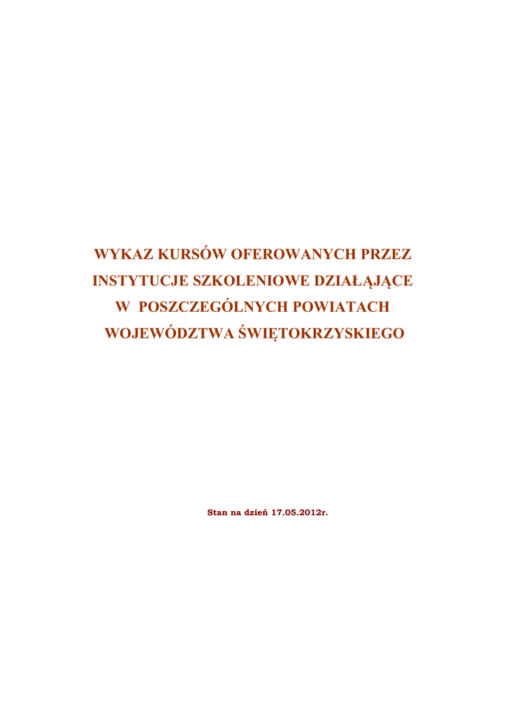 WYKAZ KURSÓW OFEROWANYCH PRZEZ INSTYTUCJE SZKOLENIOWE DZIAŁĄJĄCE W POSZCZEGÓLNYCH POWIATACH WOJEWÓDZTWA ŚWIĘTOKRZYSKIEGO Stan na dzień 17.05.2012r. POWIAT BUSKI Lp. 1. Nazwa jednostki szkolącej Ośrodek Szkolenia Tadeusz Trela 2. POLKONECT 3. Szkoła Języków Obcych „LANGUAGE STUDY CENTRE” Bartosz Bugaj Adres i nr telefonu 28-100 Busko-Zdrój ul. Langiewicza 47 tel. 609 601 304 606 228 373 28-100 Busko-Zdrój ul. Bohaterów Warszawy 7 tel. 041/ 378 14 04 28-100 Busko-Zdrój ul. Piłsudskiego 11/9 tel. 533 617 777 2 Informacja o realizowanych kursach - Kurs prawa jazdy kat. A, B - Kurs prawa jazdy kat. C - Kurs prawa jazdy kat. CE - Kurs prawa jazdy kat. BE - Kurs kwalifikacji wstępnej - Kurs kwalifikacji wstępnej przyspieszonej w zakresie Kat. C1, C1+E, C, C+E prawa jazdy - Kurs kwalifikacji wstępnej przyspieszonej w zakresie kat. D1, D1+E, D, D+E prawa jazdy - Kurs operatorów wózków jezdniowych - Kurs szkolenie okresowe kierowców zawodowych w zakresie kat. C1, C1+E, C, C+E prawa jazdy - Kurs szkolenie okresowe kierowców zawodowych w zakresie kat. D1, D1+E, D, D+E prawa jazdy - Zasada równości szans kobiet i mężczyzn - Język francuski - Kursy języka angielskiego dla dzieci i młodzieży POWIAT JĘDRZEJOWSKI Lp. 1. 2. Nazwa jednostki szkolącej „Automix” s.c. Barański Wiesław, Bąk Krzysztof, Marcinkowski Karol Centrum Kształcenia Praktycznego w Jędrzejowie Adres i nr telefonu 28-300 Jędrzejów Sudół 103 A tel. 041/ 360 06 35 28-300 Jędrzejów ul. Okrzei 63 tel. 041/ 386 17 97 3 Informacja o realizowanych kursach - Szkolenie uprawnionych diagnostów do przeprowadzania badań technicznych pojazdów pełny zakres - Kursy początkowe dla kandydatów na doradców i kursy doskonalące dla doradców do spraw bezpieczeństwa w zakresie transportu drogowego towarów niebezpiecznych - Kursy dla przewoźników w zakresie uzyskania certyfikatu kompetencji zawodowych w transporcie drogowym (krajowy i międzynarodowy przewóz osób i rzeczy) - Kurs specjalistyczny w zakresie przewozu drogowego towarów niebezpiecznych w cysternach dla kierowców przewożących materiały niebezp. - Kurs specjalistyczny w zakresie przewozu drogowego towarów niebezpiecznych klasy 7 (materiały promieniotwórcze) dla kierowców przewożących materiały niebezpieczne - Kurs specjalistyczny w zakresie przewozu drogowego towarów niebezpiecznych klasy 1 (materiały wybuchowe) dla kierowców przewożących materiały niebezpieczne - Kurs podstawowy w zakresie przewozu drogowego towarów niebezpiecznych wszystkich klas dla kierowców przewożących materiały niebezpieczne - Kurs podstawowy dla pracowników w zakresie BHP - Kurs podstawowy dla pracodawców w zakresie BHP - Stolarz meblowy - Spawanie podstawowe metodą MAG - Spawanie podstawowe metodą TIG 3. 4. Centrum Szkoleń Wielozawodowych DELTA Pracownia Badań Psychologicznych DELTA Ośrodek Kształcenia Wielozawodowego „Alfa” Kokoszka J., Kokoszka D. Spółka jawna 28-300 Jędrzejów ul. Kopernika 17 tel. 509 450 596 28-300 Jędrzejów ul. 11 Listopada 73 tel. 041/ 386 33 54 5. 28-300 Jędrzejów Ośrodek ul. Reymonta 20 Kształcenia Zawodowego Maciej tel. 041/ 386 51 28 Kamiński 6. Wielozawodowe Centrum Szkolenia „u Sławka” Sławomir Klamka Wiesław Barański Centrum Szkolenia Wielozawodowego „Automix” 7. 28-300 Jędrzejów Plac T. Kościuszki 19 tel. 602 752 690 28-300 Jędrzejów Sudół 103 A tel. 041/ 386 55 04, 602 177 758 4 - Spawacz metody MAG - Nowoczesny sprzedawca - SEP1 kw - Obsługa komputera - Kurs BHP - Kurs prawa jazdy kategorii B i T - Kur operatorów wózków widłowych - Kwalifikacja wstępna kierowców kat. C, D - Kurs nauki jazdy kat. B, C, C+E - BHP - Minimum sanitarne - Eksploatacja suwnic i żurawi - Cięcie plazmą i gazem - Spawacz - SEP uprawnienia elektryczne - Pilarz –drwal - Palacz kotłów co - Obsługa stacji paliw - Obsługa administracyjno-biurowa firmy - Nowoczesny sprzedawca - Kierowca wózków jezdniowych - Operator żurawi przeładunkowych - Operator burt samowyładowczych - Kurs- kierowca wózka jezdniowego - Kurs na przewóz osób i rzeczy - Kurs na prawo jazdy kat. B, BE, C, CE i T - Kwalifikacja wstępna przyspieszona - Kwalifikacja uzupełniająca przyspieszona - Szkolenie okresowe - Kurs prawa jazdy kat. B, BE, C, CE, D (po B) i D (po C) - Szkolenie kandydatów na kierowców kat. T -ciągnik rolniczy - Szkolenie kandydatów na kierowców kat. E/C - samochód ciężarowy - Szkolenie kandydatów na kierowców kat. D na autobusy - Szkolenie kandydatów na kierowców kat. C- samochód ciężarowy. - Szkolenie kandydatów na kierowców kat. B - samochód osobowy - Szkolenie kandydatów na kierowców kat. A-motocykl - Kurs operatorów koparek i koparkoładowarek kl. III - Kurs dokształcający kierowców w przewozie rzeczy i osób (zakres ogólny i uzupełniający) 5 POWIAT KAZIMIERSKI Lp. 1. 2. Nazwa jednostki szkolącej Biuro Usług Technicznych BEZPIECZEŃSTWO Dorota Bochenek Adres i nr telefonu Centrum Edukacji Ustawicznej Elżbieta Męcina Bednarek 28-350 Skalbmierz ul. Kanonijska 7 tel. 041/ 352 00 39 28-500 Kazimierza Wielka ul. Przemysłowa 9 tel. 041/ 352 18 77 693 537 669 6 Informacja o realizowanych kursach - Kierowca – operator wózków jezdniowych napędzanych (wszystkie typy) - Obsługa stacji paliw płynnych i napełnianie zbiorników gazem LPG - Obsługa UTB (urządzeń transportu bliskiego: żurawie, dźwigi, suwnice itp.) - Szkolenia w zakresie BHP i Ppoż dla osób kierujących pracownikami - Szkolenia w zakresie BHP i Ppoż dla pracodawców - Szkolenia w zakresie BHP i Ppoż dla pracowników na stanowiskach robotniczych - Kurs obsługi komputera - Kurs BHP (okresowe) - Kurs Przedstawiciel handlowy - Kurs Obsługa sekretariatusekretarka-asystentka dyrektora - Kurs Malarz - tapeciarz - Kurs Kierownik wycieczek szkolnych - Kurs Agroturystyka/Turystyka wiejska - Kurs Agent ubezpieczeniowy - Księgowość komputerowa POWIAT KIELECKI Lp. 1. 2. 3. 4. 5. 6. Na