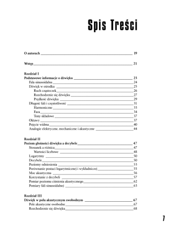 Spis Treści O autorach___________________________________________________ 19 Wstęp_______________________________________________________ 21 Rozdział I Podstawowe informacje o dźwięku_________________________________ 23 Fala sinusoidalna______________________________________________24 Dźwięk w ośrodku_ ___________________________________________25 Ruch cząsteczek____________________________________________26 Rozchodzenie się dźwięku____________________________________27 Prędkość dźwięku_ _________________________________________29 Długość fali i częstotliwość______________________________________31 Harmoniczne______________________________________________33 Faza_____________________________________________________34 Tony składowe_____________________________________________37 Oktawy_____________________________________________________37 Pojęcie widma________________________________________________40 Analogie elektryczne, mechaniczne i akustyczne_ _____________________44 Rozdział II Poziom głośności dźwięku a decybele_______________________________ 47 Stosunek a różnica_____________________________________________47 Wartości liczbowe_ _________________________________________48 Logarytmy_ _________________________________________________50 Decybele____________________________________________________50 Poziomy odniesienia___________________________________________53 Porównanie postaci logarytmicznej i wykładniczej_____________________55 Moc akustyczna_ _____________________________________________56 Korzystanie z decybeli_ ________________________________________57 Pomiar poziomu ciśnienia akustycznego_____________________________62 Pomiary fali sinusoidalnej_ ______________________________________63 Rozdział III Dźwięk w polu akustycznym swobodnym_ __________________________ 67 Pole akustyczne swobodne_______________________________________67 Rozchodzenie się dźwięku_______________________________________68 7 Natężenie akustyczne w polu akustycznym swobodnym_ _______________69 Ciśnienie akustyczne w polu akustycznym swobodnym_________________70 Pola akustyczne w przestrzeniach zamkniętych_ ______________________73 Półkolista propagacja fal_ _______________________________________74 Rozdział IV Odbieranie dźwięków___________________________________________ 77 Czułość ucha_________________________________________________78 Budowa ucha ludzkiego_________________________________________79 Ucho zewnętrzne _ _________________________________________80 Kierunkowość odbioru dźwięku — ćwiczenie______________________80 Przewód słuchowy__________________________________________81 Ucho środkowe_ ___________________________________________82 Ucho wewnętrzne_ _________________________________________85 Stereocilia________________________________________________86 Głośność a częstotliwość________________________________________87 Regulacja głośności_________________________________________90 Obszar słyszalności_________________________________________90 Głośność a poziom ciśnienia akustycznego_ _________________________92 Głośność i szerokość pasma______________________________________94 Głośność impulsów____________________________________________97 Zmiany głośności_ ____________________________________________99 Wysokość dźwięku a częstotliwość_ _______________________________99 Doświadczenie z wysokością dźwięku_ _________________________101 Brakująca składowa podstawowa_ _____________________________101 Barwa dźwięku a widmo_______________________________________101 Lokalizacja źródeł dźwięku_____________________________________102 Lokalizacja za pomocą pary uszu_________________________________105 Prawo dźwięku bezpośredniego__________________________________106 Efekt Franssena___________________________________________106 Efekt pierwszeństwa_ ______________________________________107 Percepcja dźwięku odbitego_____________________________________109 Efekt cocktail party___________________________________________ 112 Nieliniowość słuchowa_ _______________________________________ 112 Subiektywność i obiektywność_ _________________________________ 114 Głuchota zawodowa i wynikająca ze sposobu spędzania wolnego czasu_____ 114 Podsumowanie_ _____________________________________________ 116 Rozdział V Sygnały, mowa, muzyka i szum___________________________________ 119 Spektrograf akustyczny________________________________________ 119 Mowa_____________________________________________________ 122 Narząd głosu_____________________________________________ 124 Powstawanie głosek dźwięcznych______________________________ 124 8 Powstawanie głosek bezdźwięcznych___________________________ 125 Zakres częstotliwości mowy__________________________________ 126 Kierunkowość mowy_______________________________________ 127 Muzyka____________________________________________________ 128 Instrumenty strunowe_ _____________________________________ 128 Instrumenty dęte__________________________________________ 129 Nieharmoniczne tony składowe górne_ _________________________ 130 Zakres dynamiczny mowy i muzyki_______________________________ 131 Moc mowy i muzyki__________________________________________ 132 Zakres częstotliwości mowy i muzyki_ ____________________________ 133 Obszar słyszalności mowy i muzyki_______________________________ 133 Szum_ ____________________________________________________ 136 Pomiary szumu_ __________________________________________ 137 Szum losowy_____________________________________________ 138 Szum biały i różowy_ ______________________________________ 139 Zniekształcenia sygnału_______________________________________142 Zniekształcenia harmoniczne_________________________________143 Rezonans_ _________________________________________________146 Filtry______________________________________________________148 Rozdział VI Odbicia 