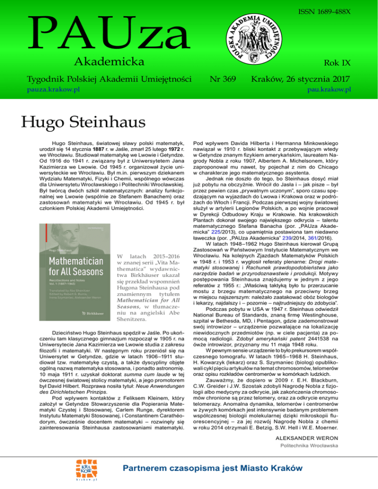 PAUza ISSN 1689-488X Akademicka Tygodnik Polskiej Akademii Umiejętności Rok IX Nr 369 Kraków, 26 stycznia 2017 pau.krakow.pl pauza.krakow.pl Hugo Steinhaus Hugo Steinhaus, światowej sławy polski matematyk, urodził się 14 stycznia 1887 r. w Jaśle, zmarł 25 lutego 1972 r. we Wrocławiu. Studiował matematykę we Lwowie i Getyndze. Od 1916 do 1941 r. związany był z Uniwersytetem Jana Kazimierza we Lwowie. Od 1945 r. organizował życie uniwersyteckie we Wrocławiu. Był m.in. pierwszym dziekanem Wydziału Matematyki, Fizyki i Chemii, wspólnego wówczas dla Uniwersytetu Wrocławskiego i Politechniki Wrocławskiej. Był twórcą dwóch szkół matematycznych: analizy funkcjonalnej we Lwowie (wspólnie ze Stefanem Banachem) oraz zastosowań matematyki we Wrocławiu. Od 1945 r. był członkiem Polskiej Akademii Umiejętności. W latach 2015–2016 w znanej serii „Vita Mathematica” wydawnictwa Birkhäuser ukazał się przekład wspomnień Hugona Steinhausa pod znamiennym tytułem Mathematician for All Seasons, w tłumaczeniu na angielski Abe Shenitzera. Dzieciństwo Hugo Steinhaus spędził w Jaśle. Po ukończeniu tam klasycznego gimnazjum rozpoczął w 1905 r. na Uniwersytecie Jana Kazimierza we Lwowie studia z zakresu filozofii i matematyki. W następnym roku przeniósł się na Uniwersytet w Getyndze, gdzie w latach 1906–1911 studiował tzw. matematykę czystą, a także dyscypliny objęte ogólną nazwą matematyka stosowana, i ponadto astronomię. 10 maja 1911 r. uzyskał doktorat summa cum laude w tej ówczesnej światowej stolicy matematyki, a jego promotorem był David Hilbert. Rozprawa nosiła tytuł: Neue Anwendungen des Dirichletschen Prinzips. Pod wpływem kontaktów z Feliksem Kleinem, który założył w Getyndze Stowarzyszenie dla Popierania Matematyki Czystej i Stosowanej, Carlem Runge, dyrektorem Instytutu Matematyki Stosowanej, i Constantinem Carathéodorym, ówcześnie docentem matematyki – rozwinęły się zainteresowania Steinhausa zastosowaniami matematyki. Pod wpływem Davida Hilberta i Hermanna Minkowskiego nawiązał w 1910 r. bliski kontakt z przebywającym wtedy w Getyndze znanym fizykiem amerykańskim, laureatem Nagrody Nobla z roku 1907, Albertem A. Michelsonem, który zaproponował mu nawet, by pojechał z nim do Chicago w charakterze jego matematycznego asystenta. Jednak nie doszło do tego, bo Steinhaus dosyć miał już pobytu na obczyźnie. Wrócił do Jasła i – jak pisze – był przez pewien czas „prywatnym uczonym”, sporo czasu spędzającym na wyjazdach do Lwowa i Krakowa oraz w podróżach do Włoch i Francji. Podczas pierwszej wojny światowej służył w artylerii Legionów Polskich, a po wojnie pracował w Dyrekcji Odbudowy Kraju w Krakowie. Na krakowskich Plantach dokonał swojego największego odkrycia – talentu matematycznego Stefana Banacha (por. „PAUza Akademicka” 225/2013), co upamiętnia postawiona tam niedawno ławeczka (por. „PAUza Akademicka” 239/2014, 361/2016). W latach 1948–1962 Hugo Steinhaus kierował Grupą Zastosowań w Państwowym Instytucie Matematycznym we Wrocławiu. Na kolejnych Zjazdach Matematyków Polskich w 1948 r. i 1953 r. wygłosił referaty plenarne: Drogi matematyki stosowanej i Rachunek prawdopodobieństwa jako narzędzie badań w przyrodoznawstwie i produkcji. Motywy postępowania Steinhausa znajdujemy w jednym z jego referatów z 1955 r.: „Właściwą taktyką było tu przerzucanie mostu z brzegu matematycznego na przeciwny brzeg w miejscu najszerszym: należało zaatakować obóz biologów i lekarzy, najdalszy i – pozornie – najtrudniejszy do zdobycia”. Podczas pobytu w USA w 1947 r. Steinhaus odwiedził National Bureau of Standards, znaną firmę Westinghouse, szpital w Bethesda, MD, i Pentagon, gdzie zademonstrował swój introwizor – urządzenie pozwalające na lokalizację niewidocznych przedmiotów (np. w ciele pacjenta) za pomocą radiologii. Zdobył amerykański patent 2441538 na ówże introwizor, przyznany mu 11 maja 1948 roku. W pewnym sensie urządzenie to było prekursorem współczesnego tomografu. W latach 1965–1968 H. Steinhaus, H. Kowarzyk (lekarz) oraz S. Szymaniec (biolog) opublikowali cykl pięciu artykułów na temat chromosomów, telomerów oraz opisu rozkładów centromerów w komórkach ludzkich. Zauważmy, że dopiero w 2009 r. E.H. Blackburn, C.W. Greider i J.W. Szostak zdobyli Nagrodę Nobla z fizjologii albo medycyny za odkrycie, jak zakończenia chromosomów chronione są przez telomery, oraz za odkrycie enzymu telomerazy. Anomalna dynamika, telomerów i centromerów w żywych komórkach jest intensywnie badanym problemem współczesnej biologii molekularnej dzięki mikroskopii fluorescencyjnej – za jej rozwój Nagrodę Nobla z chemii w roku 2014 otrzymali E. Betzig, S.W. Hell i W.E. Moerner. ALEKSANDER WERON Politechnika Wrocławska Partnerem czasopisma jest Miasto Kraków Numer 369 26 stycznia 2017 2 www.pauza.krakow.pl Nie tylko ławeczka Legenda Lwowskiej Szkoły Matematycznej trwa. Po ławeczce na krakowskich Plantach („PAUza” 361/2016), przy której Hugo Steinhaus „odkrył” Stefana Banacha (co stało się symbolicznym początkiem tej szkoły), we Wrocławiu zostało pokazane widowisko muzyczne Opera matematyczna. Paradoksalny rozkład sfery, poświęcone dramatycznym losom jej członków na tle wielokulturowego Lwowa, ukazujące atmosferę ich fascynacji nauką, która była sensem ich życia i w której szukali ucieczki przed straszną historią, jaka ich osaczyła. Stało się to we wtorek, 18 października 2016 roku, w sali wrocławskiego Impartu, okazją zaś był przysługujący miastu tytuł Europejskiej Stolicy Kultury, którego budżet pozwolił na sfinansowanie przedsięwzięcia. Była to prapremiera, doskonale przez publiczność przyjęta. Tekst i muzykę napisał znany artysta i poeta Roman Kołakowski, który jednocześnie wyreżyserował spektakl, udział zaś wzięli głównie warszawscy aktorzy, muzycy i tance