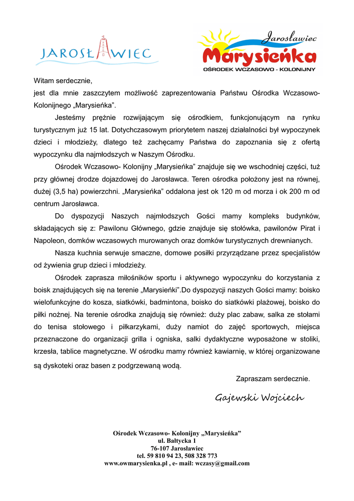 Witam serdecznie, jest dla mnie zaszczytem możliwość zaprezentowania Państwu Ośrodka WczasowoKolonijnego „Marysieńka”. Jesteśmy prężnie rozwijającym się ośrodkiem, funkcjonującym na rynku turystycznym już 15 lat. Dotychczasowym priorytetem naszej działalności był wypoczynek dzieci i młodzieży, dlatego też zachęcamy Państwa do zapoznania się z ofertą wypoczynku dla najmłodszych w Naszym Ośrodku. Ośrodek Wczasowo- Kolonijny „Marysieńka” znajduje się we wschodniej części, tuż przy głównej drodze dojazdowej do Jarosławca. Teren ośrodka położony jest na równej, dużej (3,5 ha) powierzchni. „Marysieńka” oddalona jest ok 120 m od morza i ok 200 m od centrum Jarosławca. Do dyspozycji Naszych najmłodszych Gości mamy kompleks budynków, składających się z: Pawilonu Głównego, gdzie znajduje się stołówka, pawilonów Pirat i Napoleon, domków wczasowych murowanych oraz domków turystycznych drewnianych. Nasza kuchnia serwuje smaczne, domowe posiłki przyrządzane przez specjalistów od żywienia grup dzieci i młodzieży. Ośrodek zaprasza miłośników sportu i aktywnego wypoczynku do korzystania z boisk znajdujących się na terenie „Marysieńki”.Do dyspozycji naszych Gości mamy: boisko wielofunkcyjne do kosza, siatkówki, badmintona, boisko do siatkówki plażowej, boisko do piłki nożnej. Na terenie ośrodka znajdują się również: duży plac zabaw, salka ze stołami do tenisa stołowego i piłkarzykami, duży namiot do zajęć sportowych, miejsca przeznaczone do organizacji grilla i ogniska, salki dydaktyczne wyposażone w stoliki, krzesła, tablice magnetyczne. W ośrodku mamy również kawiarnię, w której organizowane są dyskoteki oraz basen z podgrzewaną wodą. Zapraszam serdecznie. Gajewski Wojciech Ośrodek Wczasowo- Kolonijny „Marysieńka” ul. Bałtycka 1 76-107 Jarosławiec tel. 59 810 94 23, 508 328 773 www.owmarysienka.pl , e- mail: [email protected] OFERTA KOLONIE I OBOZY W OŚRODKU WCZASOWO- KOLONIJNYM „MARYSIEŃKA” RODZAJ BUDYNKU ILOŚĆ OSÓB CENA OSOBA/ DZIEŃ Napoleon Pokoje 4-6 osobowe z łazienką 69 zł (możliwość wstawienia łóżek piętrowych) Pirat Pokoje 3-6 osobowe z łazienką 66 zł (możliwość wstawienia łóżek piętrowych) Hotelowiec Pokoje 1-2 osobowe ze wspólną łaźnia na korytarzu (łóżka piętrowe) 47 zł Domki wczasowe murowane 4-5 osobowe z łazienką 55 zł Domki turystyczne drewniane 4-5 osobowe z łazienką 53 zł Domki turystyczne drewniane 4-5 osobowe ze wspólną łaźnią 40 zł KILKA SŁÓW O OŚRODKU: Ośrodek Wczasowo- Kolonijny „Marysieńka” położony jest w małej, malowniczej nadmorskiej miejscowości Jarosławiec. Ośrodek „Marysieńka” znajduje się we wschodniej części tuż przy głównej drodze dojazdowej do miejscowości. Teren ośrodka położony jest na równej, dużej (3,5 ha) powierzchni, jest ogrodzony, a w nocy oświetlony i dozorowany. „Marysieńka” oddalona jest ok 120 m od morza i 200 m od centrum Jarosławca. W ośrodku znajduje się stołówka o powierzchni 250 m 2, (miesząca 200 osób) w której kelnerki podają 3 posiłki dziennie + podwieczorek. Menu ustalamy z fachowcami od żywienia grup dzieci. Gwarantujemy, że smak i jakość posiłków przez nas podawanych jest godny nagrody, jaką zdobyliśmy „I Miejsce dla najlepszej stołówki” dla OW „Marysieńka”. Ośrodek Wczasowo- Kolonijny „Marysieńka” ul. Bałtycka 1 76-107 Jarosławiec tel. 59 810 94 23, 508 328 773 www.owmarysienka.pl , e- mail: [email protected] Na terenie ośrodka do dyspozycji grupy znajduje się: kawiarnią z pełnym nagłośnieniem (bezprzewodowe mikrofony, bum-box, laptop), 3 salki dydaktyczne o powierzchni 70 m 2, dwie salki- domki o powierzchni 25 m2 (wszystkie salki wyposażone w klimatyzację, tablice magnetyczne,stoliki i krzesła) , boisko wielofunkcyjne do kosza, siatkówki, badmintona, boisko do piłki nożnej, boisko siatkówki plażowej, basen z podgrzewaną wodą, oczko wodne, place zabaw, miejsce na organizację ogniska i grilla, biesiadnik mieszczący 70 osób, padok do przejażdżek konnych, namiot do zajęć sportowych. Gratis proponujemy: • • • • • • • • • • • Korzystanie z basenu z podgrzewaną wodą Opiekuna na każde 15 osób, Opiekę medyczną (pielęgniarka w obiekcie, lekarz doraźnie), Ratownik na plaży ok. 120 m wejściem na sektor kolonijny, Ognisko z muzyką i kiełbaskami, Dyskoteki (muz. Mechaniczna), Zajęcia animacyjne na terenie ośrodka prowadzone przez animatorów i opiekunów, Rowery, sprzęt plażowy, kijki Nordic Walking, Kompasy do surwiwalu lub spacerów Korzystanie z salek dydaktycznych Korzystanie z boisk na terenie Ośrodka Ośrodek Wczasowo- Kolonijny „Marysieńka” ul. Bałtycka 1 76-107 Jarosławiec tel. 59 810 94 23, 508 328 773 www.owmarysienka.pl , e- mail: [email protected] GALERIA : PIRAT: NAPOLEON: DOMKI: HOTELOWIEC: TEREN: SALKI: Ośrodek Wczasowo- Kolonijny „Marysieńka” ul. Bałtycka 1 76-107 Jarosławiec tel. 59 810 94 23, 508 328 773 www.owmarysienka.pl , e- mail: [email protected]