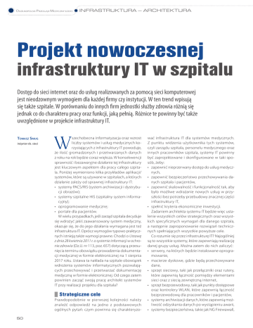 OGÓLNOPOLSKI PRZEGLĄD MEDYCZNY 9/2015 INFRASTRUKTURA – ARCHITEKTURA Projekt nowoczesnej infrastruktury IT w szpitalu Dostęp do sieci internet oraz do usług realizowanych za pomocą sieci komputerowej jest nieodzownym wymogiem dla każdej firmy czy instytucji. W ten trend wpisują się także szpitale. W porównaniu do innych firm jednostki służby zdrowia różnią się jednak co do charakteru pracy oraz funkcji, jaką pełnią. Różnice te powinny być także uwzględnione w projekcie infrastruktury IT. Tomasz Smug inżynier ds. sieci W szechobecna informatyzacja oraz wzrost liczby systemów i usług medycznych korzystających z infrastruktury IT powoduje, że ilość gromadzonych i przetwarzanych danych z roku na rok będzie coraz większa. W konsekwencji sprawność i bezawaryjne działanie tej infrastruktury jest kluczowym aspektem dla pracy całego szpitala. Poniżej wymieniono kilka przykładów aplikacji/ systemów, które są używane w szpitalach, a których działanie zależy od sprawnej infrastruktury IT: • systemy PACS/RIS (system archiwizacji i dystrybucji obrazów); • systemy szpitalne HIS (szpitalny system informacyjny); • oprogramowanie medyczne; • portale dla pacjentów. W wielu przypadkach, jeśli zarząd szpitala decyduje się wdrożyć jakiś zaawansowany system medyczny, okazuje się, że do jego działania wymagana jest też infrastruktura IT. Oprócz wymogów typowo praktycznych istnieją także wymogi prawne. Chodzi o Ustawę z dnia 28 kwietnia 2011 r. o systemie informacji w ochronie zdrowia (Dz.U. nr 113, poz. 657) dotyczącą przesunięcia terminu obowiązku prowadzenia dokumentacji medycznej w formie elektronicznej na 1 sierpnia 2017 roku. Ustawa ta nakłada na szpitale obowiązek wdrożenia systemów informatycznych pozwalających przechowywać i przetwarzać dokumentację medyczną w formie elektronicznej. Od czego zatem powinien zacząć swoją pracę architekt systemów IT przy realizacji projektu dla szpitala? Strategiczne cele Prawdopodobnie w pierwszej kolejności należy znaleźć odpowiedź na jedno z podstawowych ogólnych pytań: czym powinna się charakteryzo50 wać infrastruktura IT dla systemów medycznych. Z punktu widzenia użytkownika tych systemów, czyli zarządu szpitala, personelu medycznego oraz innych pracowników szpitala, systemy IT powinny być zaprojektowane i skonfigurowane w taki sposób, żeby: • zapewnić nieprzerwany dostęp do usług medycznych, • zapewnić bezpieczeństwo przechowywania danych szpitala i pacjentów, • zapewnić skalowalność i funkcjonalność tak, aby było możliwe wdrażanie nowych usług w przyszłości bez potrzeby przebudowy znacznej części infrastruktury IT, • spełnić kryteria ekonomiczne inwestycji. Zadaniem architekta systemu IT będzie więc ustalenie wszystkich celów strategicznych oraz wszystkich specyficznych wymagań dla danego szpitala, a następnie zaproponowanie rozwiązań technicznych spełniających wszystkie powyższe cele. Co rozumie się przez infrastrukturę IT? Najogólniej są to wszystkie systemy, które zapewniają realizację danej grupy usług. Można zatem do nich zaliczyć: • serwery, na których będzie instalowane oprogramowanie, • macierze dyskowe, gdzie będą przechowywane dane, • sprzęt sieciowy, taki jak przełączniki oraz rutery, które zapewnią łączność pomiędzy elementami sieci oraz z siecią zewnętrzną internet, • sprzęt bezprzewodowy, taki jak punkty dostępowe oraz kontrolery WLAN, które zapewnią łączność bezprzewodową dla pracowników i pacjentów, • systemy archiwizacji danych, które zapewnią możliwość odzyskania danych po wystąpieniu awarii, • systemy bezpieczeństwa, takie jak NG Firewawall, INFRASTRUKTURA – ARCHITEKTURA IPS, które zapewniają zwiększenie bezpieczeństwa przed zagrożeniami z sieci zewnętrznej, jak i przed intruzami, którzy mogą pojawić się w sieci lokalnej, • okablowanie, które zapewni połączenia fizyczne pomiędzy elementami sieci. Dlaczego wymienia się aż tyle systemów? Czy nie można byłoby każdego z nich kupować i wdrażać z osobna? Oczywiście można, jednak niesie to ze sobą pewne zagrożenia, np. ryzyko niedostatecznej koordynacji między systemami, co może szybko prowadzić do nieoptymalnego doboru elementów. W najlepszym przypadku nieoptymalny wybór będzie się wiązał z przeszacowaniem wartości inwestycji, w najgorszym z kolei, działanie systemów może nie być zadowalające dla użytkownika. Poszukiwanie i naprawa niedociągnięć w już działającym systemie jest często trudna, a prawie zawsze – bardzo kosztowna. Dochodzi się zatem do sytuacji, gdy należy zintegrować wiele bardzo różnych systemów IT w jeden sprawnie działający „organizm”. Od czego zacząć? Z pewnością nie od szczegółów technicznych, których są setki. Na to przyjdzie czas na samym końcu. Architekt powinien zacząć od rzeczy strategicznych dla użytkownika. Zazwyczaj jest to sporządzenie listy usług – aplikacji, które będą użytkowane przez szpital, oraz ustalenie, które z tych aplikacji są klu- OGÓLNOPOLSKI PRZEGLĄD MEDYCZNY 9/2015 czowe dla działania szpitala. Istotne jest określenie obecnych i przewidywalnych w przyszłości potrzeb odnośnie: • wydajności przetwarzania danych, • pojemności przestrzeni dyskowej, • wydajności sieci. Po skompletowaniu odpowiedzi na powyższe pytania należy ustalić minimalną ilość zasobów potrzebnych do wdrożenia wymaganych usług. W następnym kroku powinno się zidentyfikować wpływ każdego elementu infrastruktury IT na: • bezpieczeństwo działania aplikacji, • bezpieczeństwo przechowywania danych, • wydajność działania aplikacji, • wszystkie pozostałe wymagania specyficzne dla danego użytkownika. Po takiej analizie można zaproponować wstępną architekturę systemu IT, którą przedstawia się użytkownikowi. Dopiero od tego momentu można przystąpić do określan