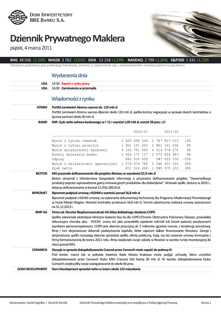 Dziennik Prywatnego Maklera piątek, 4 marca 2011 WIG 48 4 036 +1,50 50% WIG20 2 762 +2,01 01% DJIA 12 258 +1,59 59% NASDAQ 2 799 +1,,84% S&P500 1 331 +1 1,72% Niniejsza publikacja jest publikacją handlową handlową,, prosimy o zapoznanie się z oświadczeniem umieszczonym na jej końcu. Wydarzenia ydarzenia dnia USA USA 14:30 Raport z rynku pracy 16:00 Zamówienia w przemyśle Wiadomości z rynku ATERM BANKI BIOTON BIPROMET BMP AG COMARCH DOM DEVELOPMENT Portfel zamówień Atremu wynosi ok. 110 mln zł Portfel zamówień Atremu wynosi obecnie około 110 mln zł, spółka kończy negocjacje negocjacje w sprawie dwóch kontraktów o łącznej wartości około 30 mln zł. KNF: Zysk netto sektora bankowego w I '11 r wyniósł 1,09 mld zł, wzrost 28 proc. r/r 2010-01 2010 01 2011 2011-01 -------------------------------------------------------------------------------------------------------------------------------------Wynik z tytułu odsetek 2 425 498 344 2 767 827 015 14% Wynik z tytułu prowizji 1 061 151 203 1 061 161 656 0% Wynik działalności działalno ci bankowej 4 165 791 595 4 314 974 271 4% Koszty działania działania banku 1 924 171 137 2 072 854 887 8% Odpisy 882 916 509 587 433 530 -33% Wynik z działalności działalno ci operacyjnej 1 074 074 796 1 346 421 021 25% Zysk netto 851 516 268 1 089 970 233 28% MG przyznało dofinansowanie dla projektu Biotonu w wysokości 52,9 mln zł Bioton otrzymał z Ministerstwa Gospodarki informację o przyznaniu dofinansowania projektu "Dywersyfikacja produkcji poprzez wprowadzenie gamy innowacyjnych produktó produktów w dla diabetyków". Wniosek spółki, złożony w 2010 r., dotyczy dofinansowania w kwocie 51.916.189,50 zł. Bipromet podpisał umowę z KGHM o wartości ponad 56,8 mln zł Bipromet podpisał z KGHM umowę na wykonanie dokumentacji technicznej dla Programu Modernizacji Pirometalurgii w Hucie Miedzi Głogów. Wartość kontraktu przekracza 56,8 mln zł. Termin zakończenia realizacji umowy wyznaczono na 31.12.2013 r. Firma zal. Revotar Biopharmaceuticals AG bliżej dokładnego zbadania COPD Spółka zakończyła istotniejsze kliniczne badanie fazy IIa dla COPD (Chronic Obstructive Pulmonary Disease; przewlekła obturacyjna racyjna choroba płuc - POChP, znana też jako przewlekłe zapalenie oskrzeli lub kaszel palacza) pozytywnymi wynikami pierwszorzędowymi. COPD jest obecnie przyczyną ok. 5 milionów zgonów rocznie, z tendencją wzrostową. Bmp mp i inni akcjonariusze dokonali podwy podwyższenia ższenia kapitału, które zapewni dalsze finansowanie Revotara. Zarząd i akcjonariusze spółki rozważają obecnie sprzedaży spółki, ofertę publiczną, fuzję czy teżż zawarcie umowy licencyjnej z firmą farmaceutyczną do końca 2011 roku. Bmp mp zwiększyła swoje udziały udziały w Revotar w wyniku rundy inwestycyjnej do nieco ponad 40%. Decyzja w sprawie dokapitalizowania Cracovii przez Comarch może zapaść do połowy IV Pod koniec marca lub w połowie połowie kwietnia Rada Miasta Krakowa może podjąć uchwałę, która umożliwi dokapitalizowanie przez Comarch klubu MKS Cracovia SSA kwotą 30 mln zł. W wyniku dokapitalizowania klubu Comarch zwiększyłby swoje zaangażowanie do około 66 proc. Dom Development sprzedał netto w lutym około 123 mieszkania Opracowanie: Daniel Cegiełka | Dominik Murlak Dziennik Prywatnego Maklera powstaje przy współpracy z Polską Agencją Prasową Strona 1 Dziennik Prywatnego Maklera FERRO FERRO HIGENIKA HYGIENIKA IDMSA MIRBUD ORZEŁ BIAŁY POLIMEXMS POLNORD PPG PUŁAWY ROPCZYCE SYGNITY TELEKOMUNIKACJA TPSA piątek, 4 marca 2011 Ferro chce w '11 zwiększyć przychody i utrzymać dynamikę eksportu – prezes Ferro, producent i dystrybutor armatury oraz komponentów instalacji sanitarnych i grzewczych, ma zamiar w 2011 r. zwiększyć przychody, dzięki rozszerzeniu portfolio produktowego oraz podpisaniu umów z nowymi klientami. Grupa planuje utrzymać dynamikę sprzedaży eksportowej z ostatnich lat i zwiększyć jej udział w całkowitych przychodach. Ferro na przełomie III/IV otrzyma odpowiedź dot. oferty przejęcia NOVASERVIS Jeśli transakcja dojdzie do skutku, zarząd spółki nie będzie wnioskował o wypłatę dywidendy za 2010 r. Hygienika rozwija marki własne i myśli o konsolidacji z innymi podmiotami Hygienika zamierza rozwijać w tym roku produkty własnych marek, rozważa też możliwość konsolidacji z innymi podmiotami z branży higieniczno-kosmetycznej. Dodatkowym źródłem przychodów firmy ma być dystrybucja produktów obcych, typu kosmetyki czy chemia gospodarcza. Wiesław Włodarski blisko inwestycji w Hygienikę. Stracił Tigera weźmie pieluchy. Producent artykułów higieny ogłosił strategię, która spodobała się biznesmenowi, który stracił napój energetyczny. (Puls Biznesu, s. 10) Grupa IDM liczy na minimum kilkudziesięcioprocentowy wzrost wyników finansowych w 2011 roku - Grzegorz Leszczyński, prezes DM IDM SA. Mirbud prognozuje, że w tym roku wypracuje 43,7 mln zł zysku netto, czyli 63 proc. więcej niż w ubiegłym roku Prognoza zakłada też 68 mln zł EBIT (wzrost o 58,5 proc. rdr), EBITDA 81,8 mln zł (wzrost o 63,27 proc. rdr), a przychody na poziomie 520,7 mln zł, co oznacza wzrost o 72,9 proc. rdr. Spółka podpisała umowę sprzedaży ołowiu oraz stopów ołowiu o znacznej wartości Sprzedaż ołowiu oraz stopów ołowiu będzie realizowana w okresie od stycznia do grudnia 2011 roku. Umowa spełnia kryterium umowy znaczącej, tzn. wartość umowy przewyższa 10% przychodów ze sprzedaży Grupy Kapitałowej za okres ostatnich czterech kwartałów obrotowych. Konsorcjum spółki Polimeksu-Mostostal ma 2 kontrakty z PKP PLK warte 851 mln zł Konsorcjum z udziałem Torpolu, spółki zależnej Polimeksu-Mostostal, podpisało z PKP Polskie Linie Kolejowe dwie umowy na wykonanie robót budowlanych w obszarach LCS Gdańsk oraz LCS Gdynia w ramach modernizacji linii kolejowej na odcinku Warszawa – Gdynia, o łącznej wartoś
