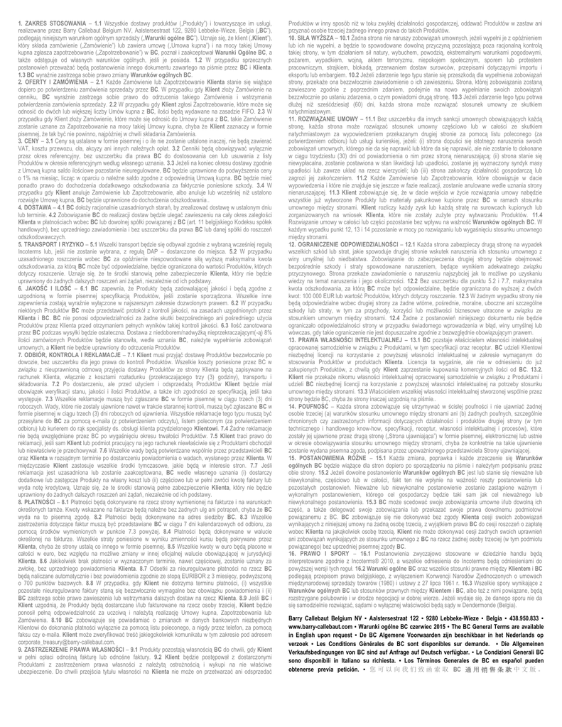 1. ZAKRES STOSOWANIA – 1.1 Wszystkie dostawy produktów („Produkty”) i towarzyszące im usługi, realizowane przez Barry Callebaut Belgium NV, Aalstersestraat 122, 9280 Lebbeke-Wieze, Belgia („BC”), podlegają niniejszym warunkom ogólnym sprzedaży („Warunki ogólne BC”). Uznaje się, że klient („Klient”), który składa zamówienie („Zamówienie”) lub zawiera umowę („Umowa kupna”) i na mocy takiej Umowy kupna zgłasza zapotrzebowanie („Zapotrzebowanie”) w BC, poznał i zaakceptował Warunki Ogólne BC, a także odstępuje od własnych warunków ogólnych, jeśli je posiada. 1.2 W przypadku sprzecznych postanowień przeważać będą postanowienia innego dokumentu zawartego na piśmie przez BC i Klienta. 1.3 BC wyraźnie zastrzega sobie prawo zmiany Warunków ogólnych BC. 2. OFERTY I ZAMÓWIENIA – 2.1 Każde Zamówienie lub Zapotrzebowanie Klienta stanie się wiążące dopiero po potwierdzeniu zamówienia sprzedaży przez BC. W przypadku gdy Klient złoży Zamówienie na cenniku, BC wyraźnie zastrzega sobie prawo do odrzucenia takiego Zamówienia i wstrzymania potwierdzenia zamówienia sprzedaży. 2.2 W przypadku gdy Klient zgłosi Zapotrzebowanie, które może się odnosić do dwóch lub większej liczby Umów kupna z BC, ilości będą wydawane na zasadzie FIFO. 2.3 W przypadku gdy Klient złoży Zamówienie, które może się odnosić do Umowy kupna z BC, takie Zamówienie zostanie uznane za Zapotrzebowanie na mocy takiej Umowy kupna, chyba że Klient zaznaczy w formie pisemnej, że tak być nie powinno, najpóźniej w chwili składania Zamówienia. 3. CENY – 3.1 Ceny są ustalane w formie pisemnej i o ile nie zostanie ustalone inaczej, nie będą zawierać VAT, kosztu przewozu, cła, akcyzy ani innych należnych opłat. 3.2 Cenniki będą obowiązywać wyłącznie przez okres referencyjny, bez uszczerbku dla prawa BC do dostosowania cen lub usuwania z listy Produktów w okresie referencyjnym według własnego uznania. 3.3 Jeżeli na koniec okresu dostawy zgodnie z Umową kupna saldo ilościowe pozostanie nieuregulowane, BC będzie uprawnione do podwyższenia ceny o 1% na miesiąc, licząc w oparciu o należne saldo zgodne z odpowiednią Umową kupna. BC będzie mieć ponadto prawo do dochodzenia dodatkowego odszkodowania za faktycznie poniesione szkody. 3.4 W przypadku gdy Klient anuluje Zamówienie lub Zapotrzebowanie, albo anuluje lub wcześniej niż ustalono rozwiąże Umowę kupna, BC będzie uprawnione do dochodzenia odszkodowania.. 4. DOSTAWA – 4.1 BC dołoży racjonalnie uzasadnionych starań, by zrealizować dostawę w ustalonym dniu lub terminie. 4.2 Zobowiązanie BC do realizacji dostaw będzie ulegać zawieszeniu na cały okres zaległości Klienta w płatnościach wobec BC lub dowolnej spółki powiązanej z BC (art. 11 belgijskiego Kodeksu spółek handlowych), bez uprzedniego zawiadomienia i bez uszczerbku dla prawa BC lub danej spółki do roszczeń odszkodowawczych. 5. TRANSPORT I RYZYKO – 5.1 Wszelki transport będzie się odbywał zgodnie z wybraną wcześniej regułą Incoterms lub, jeśli nie zostanie wybrana, z regułą DAP – dostarczone do miejsca. 5.2 W przypadku uzasadnionego roszczenia wobec BC za opóźnienie niespowodowane siłą wyższą maksymalna kwota odszkodowania, za którą BC może być odpowiedzialne, będzie ograniczona do wartości Produktów, których dotyczy roszczenie. Uznaje się, że te środki stanowią pełne zabezpieczenie Klienta, który nie będzie uprawniony do żadnych dalszych roszczeń ani żądań, niezależnie od ich podstawy. 6. JAKOŚĆ I ILOŚĆ – 6.1 BC zapewnia, że Produkty będą zadowalającej jakości i będą zgodne z uzgodnioną w formie pisemnej specyfikacją Produktów, jeśli zostanie sporządzona. Wszelkie inne zapewnienia zostają wyraźnie wyłączone w najszerszym zakresie dozwolonym prawem. 6.2 W przypadku niektórych Produktów BC może przedstawić protokół z kontroli jakości, na zasadach uzgodnionych przez Klienta i BC. BC nie ponosi odpowiedzialności za żadne skutki bezpośredniego ani pośredniego użycia Produktów przez Klienta przed otrzymaniem pełnych wyników takiej kontroli jakości. 6.3 Ilość zanotowana przez BC podczas wysyłki będzie ostateczna. Dostawa z niedoborem/nadwyżką nieprzekraczającym(-ą) 8% ilości zamówionych Produktów będzie stanowiła, wedle uznania BC, należyte wypełnienie zobowiązań umownych, a Klient nie będzie uprawniony do odrzucenia Produktów. 7. ODBIÓR, KONTROLA I REKLAMACJE – 7.1 Klient musi przyjąć dostawę Produktów bezzwłocznie po dowozie, bez uszczerbku dla jego prawa do kontroli Produktów. Wszelkie koszty poniesione przez BC w związku z nieuprawnioną odmową przyjęcia dostawy Produktów ze strony Klienta będą zapisywane na rachunek Klienta, włącznie z kosztami rozładunku (przekraczającego trzy (3) godziny), transportu i składowania. 7.2 Po dostarczeniu, ale przed użyciem i odsprzedażą Produktów Klient będzie miał obowiązek weryfikacji stanu, jakości i ilości Produktów, a także ich zgodności ze specyfikacją, jeśli taka występuje. 7.3 Wszelkie reklamacje muszą być zgłaszane BC w formie pisemnej w ciągu trzech (3) dni roboczych. Wady, które nie zostaly ujawnione nawet w trakcie starannej kontroli, muszą być zgłaszane BC w formie pisemnej w ciągu trzech (3) dni roboczych od ujawnienia. Wszystkie reklamacje tego typu muszą być przesyłane do BC za pomocą e-maila (z potwierdzeniem odczytu), listem poleconym (za potwierdzeniem odbioru) lub kurierem do rąk specjalisty ds. obsługi klienta przydzielonego Klientowi. 7.4 Żadne reklamacje nie będą uwzględniane przez BC po wygaśnięciu okresu trwałości Produktów. 7.5 Klient traci prawo do reklamacji, jeśli sam Klient lub podmiot pracujący na jego rachunek niewłaściwie się z Produktami obchodził lub niewłaściwie je przechowywał. 7.6 Wszelkie wady będą potwierdzane wspólnie przez przedstawicieli BC oraz 