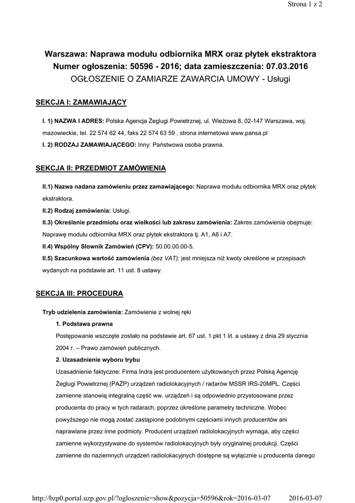 Strona 1 z 2 Warszawa: Naprawa modułu odbiornika MRX oraz płytek ekstraktora Numer ogłoszenia: 50596 - 2016; data zamieszczenia: 07.03.2016 OGŁOSZENIE O ZAMIARZE ZAWARCIA UMOWY - Usługi SEKCJA I: ZAMAWIAJĄCY I. 1) NAZWA I ADRES: Polska Agencja Żeglugi Powietrznej, ul. Wieżowa 8, 02-147 Warszawa, woj. mazowieckie, tel. 22 574 62 44, faks 22 574 63 59 , strona internetowa www.pansa.pl I. 2) RODZAJ ZAMAWIAJĄCEGO: Inny: Państwowa osoba prawna. SEKCJA II: PRZEDMIOT ZAMÓWIENIA II.1) Nazwa nadana zamówieniu przez zamawiającego: Naprawa modułu odbiornika MRX oraz płytek ekstraktora. II.2) Rodzaj zamówienia: Usługi. II.3) Określenie przedmiotu oraz wielkości lub zakresu zamówienia: Zakres zamówienia obejmuje: Naprawę modułu odbiornika MRX oraz płytek ekstraktora tj. A1, A6 i A7. II.4) Wspólny Słownik Zamówień (CPV): 50.00.00.00-5. II.5) Szacunkowa wartość zamówienia (bez VAT): jest mniejsza niż kwoty określone w przepisach wydanych na podstawie art. 11 ust. 8 ustawy. SEKCJA III: PROCEDURA Tryb udzielenia zamówienia: Zamówienie z wolnej ręki 1. Podstawa prawna Postępowanie wszczęte zostało na podstawie art. 67 ust. 1 pkt 1 lit. a ustawy z dnia 29 stycznia 2004 r. – Prawo zamówień publicznych. 2. Uzasadnienie wyboru trybu Uzasadnienie faktyczne: Firma Indra jest producentem użytkowanych przez Polską Agencję Żeglugi Powietrznej (PAŻP) urządzeń radiolokacyjnych / radarów MSSR IRS-20MPL. Części zamienne stanowią integralną część ww. urządzeń i są odpowiednio przystosowane przez producenta do pracy w tych radarach, poprzez określone parametry techniczne. Wobec powyższego nie mogą zostać zastąpione podobnymi częściami innych producentów ani naprawiane przez inne podmioty. Producent urządzeń radiolokacyjnych wymaga, aby części zamienne wykorzystywane do systemów radiolokacyjnych były oryginalnej produkcji. Części zamienne do naziemnych urządzeń radiolokacyjnych dostępne są wyłącznie u producenta danego http://bzp0.portal.uzp.gov.pl/?ogloszenie=show&pozycja=50596&rok=2016-03-07 2016-03-07 Strona 2 z 2 modelu radaru, ponieważ każda z firm na rynku produkuje unikatowy system wraz z unikatowymi podzespołami bazowymi. Oddanie takiej części do naprawy innej firmie w żadnym stopniu nie gwarantuje prawidłowego działania ani tej części ani radaru, ponieważ nie zna ona oddziaływania tej części na inne podzespoły radaru i odwrotnie. Włożenie do radaru części naprawianej przez inną firmę może skutkować nie tylko nieprawidłowym jej działaniem, ale może spowodować uszkodzenie już pracujących podzespołów radaru. Urządzenie bowiem składa się z paneli stanowiących jego integralną część. Podzespół więc nie może, ze względów bezpieczeństwa być wymieniany na zamienniki innych producentów, ponieważ: -nie będzie prawidłowo działać, -uszkodzić może inne pracujące podzespoły. W przypadku uszkodzenia urządzenia wystąpi konieczność jego wyłączenia z pracy operacyjnej. Na skutek podwyższonego działania uleganie obniżeniu bezpieczeństwo ruchu lotniczego w przestrzeni powietrznej obejmującej pracę tego radaru. Zgodnie z powyższym z przyczyn technicznych o obiektywnym charakterze wyłącznie wykonawca Indra Sistemas S.A. jest podmiotem mogącym zrealizować przedmiotowe zamówienie na rzecz PAŻP. Uzasadnienie prawne przyjęcia trybu z wolnej ręki wynikające z uzasadnienia faktycznego: Art. 67 ust. 1 pkt. 1 lit. a ustawy Pzp., tj. usługa może być świadczona tylko przez jednego Wykonawcę z przyczyn technicznych o obiektywnym charakterze SEKCJA IV: UDZIELENIE ZAMÓWIENIA NAZWA I ADRES WYKONAWCY KTÓREMU ZAMAWIAJĄCY ZAMIERZA UDZIELIĆ ZAMÓWIENIA Indra Sistemas S.A., Avda.Bruselas, 35, Alcobendas, Madryt, kraj/woj. Hiszpania. http://bzp0.portal.uzp.gov.pl/?ogloszenie=show&pozycja=50596&rok=2016-03-07 2016-03-07