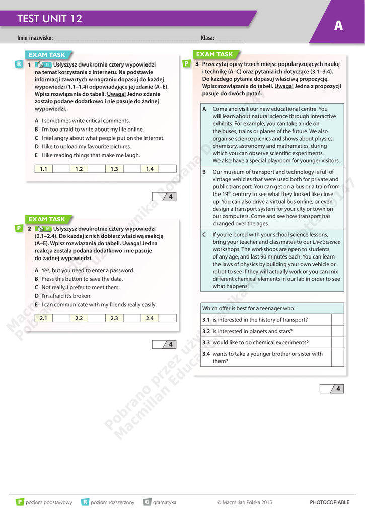 TEST UNIT 12 A Imię i nazwisko: Klasa: EXAM TASK EXAM TASK Usłyszysz dwukrotnie cztery wypowiedzi na temat korzystania z Internetu. Na podstawie informacji zawartych w nagraniu dopasuj do każdej wypowiedzi (1.1–1.4) odpowiadające jej zdanie (A–E). Wpisz rozwiązania do tabeli. Uwaga! Jedno zdanie zostało podane dodatkowo i nie pasuje do żadnej wypowiedzi. 14 7 i technikę (A–C) oraz pytania ich dotyczące (3.1–3.4). Do każdego pytania dopasuj właściwą propozycję. Wpisz rozwiązania do tabeli. Uwaga! Jedna z propozycji pasuje do dwóch pytań. 19 I sometimes write critical comments. I’m too afraid to write about my life online. I feel angry about what people put on the Internet. I like to upload my favourite pictures. I like reading things that make me laugh. 1.3 1.4 Ro M Po ac br m an illa o n pr Ed ze u z ca uż ti yt on ko w Usłyszysz dwukrotnie cztery wypowiedzi (2.1–2.4). Do każdej z nich dobierz właściwą reakcję (A–E). Wpisz rozwiązania do tabeli. Uwaga! Jedna reakcja została podana dodatkowo i nie pasuje do żadnej wypowiedzi. an a D C If you’re bored with your school science lessons, bring your teacher and classmates to our Live Science workshops. The workshops are open to students of any age, and last 90 minutes each. You can learn the laws of physics by building your own vehicle or robot to see if they will actually work or you can mix different chemical elements in our lab in order to see what happens! 2.1 2.2 ka Ro m Yes, but you need to enter a password. Press this button to save the data. Not really, I prefer to meet them. I’m afraid it’s broken. I can communicate with my friends really easily. ni A B C D E at 16 Which offer is best for a teenager who: Po M b ac ra m no ill p an r ze Ed z uc uż at yt io ko n w 2 ta ni ka EXAM TASK P Our museum of transport and technology is full of vintage vehicles that were used both for private and public transport. You can get on a bus or a train from the 19th century to see what they looked like close up. You can also drive a virtual bus online, or even design a transport system for your city or town on our computers. Come and see how transport has changed over the ages. 19 4 B 14 7 1.2 m 1.1 A Come and visit our new educational centre. You will learn about natural science through interactive exhibits. For example, you can take a ride on the buses, trains or planes of the future. We also organise science picnics and shows about physics, chemistry, astronomy and mathematics, during which you can observe scientific experiments. We also have a special playroom for younger visitors. D at ta A B C D E 3 Przeczytaj opisy trzech miejsc popularyzujących naukę a 1 P 15 an R 2.3 2.4 3.1 is interested in the history of transport? 3.2 is interested in planets and stars? 4 3.3 would like to do chemical experiments? 3.4 wants to take a younger brother or sister with them? P poziom podstawowy R poziom rozszerzony G gramatyka © Macmillan Polska 2015 4 PHOTOCOPIABLE TEST UNIT 12 4 W każdej grupie słów podkreśl wyrazy lub wyrażenia, EXAM TASK które nie pasują do pozostałych. P 1 vacuum cleaner mouse 2 coffee maker dishwasher hairdryer 3 mobile phone remote control smartphone tablet 4 keyboard memory card Memory Stick 5 click on break down save (7.1–7.3). Zakreśl literę A, B albo C. screen MP4 player an a delete Joey 14 7 m 5 5 Uzupełnij zdania wyrazami utworzonymi od wyrazów ni ka at D 7.2A is B will be C has been an ka Ro m 7.3A was installed B had been installed C has been installed 5 3 EXAM TASK Po M b ac ra m no ill p an r ze Ed z uc uż at yt io ko n w G 6 Uzupełnij zdania, wykorzystując podane w nawiasach ta 7.1A hadn’t worked B wasn’t working C isn’t working ni M Po ac br m an illa o n pr Ed ze u z ca uż ti yt on ko w 1 Alexander Fleming is the of penicillin. (DISCOVER) 2 Mark is a good – he just loves numbers and solving mathematical problems. (MATHEMATICS) 3 Do you think people should spend money on space ? (EXPLORE) 4 What’s your favourite ? Mine is the laptop, of course. (INVENT) 5 Is there a Internet connection in this restaurant? I’d like to check my emails. (WIRE) a w nawiasach. 19 Ro R Hi Mum, Can you ask Dad to check the wi-fi when he comes back home? I tried to use it late at night, but it 7.1 , so I couldn’t finish my school presentation. I’m sure my German teacher 7.2 angry with me today. This modem 7.3 for two weeks now, but it is still not working too well. Thanks, Mum! 14 7 microwave oven 19 printer 7 Przeczytaj tekst. Wybierz poprawne uzupełnienie luk D at ta P A wyrazy w odpowiedniej formie. Użyj strony czynnej lub biernej. 1 He (study) chemistry before he started working in one of the biggest chemical laboratories in Poland. 2 The telephone (invent) by Alexander Graham Bell. 3 I found some really cheap games yesterday while (I/surf ) the Internet. 4 You won’t be able to download the photos because your computer (not/connect) to the Internet. 5 Our dishwasher (be) out of order for only two weeks, but we aready hate washing up by hand. R 8 Przetłumacz na język angielski podane w nawiasach fragmenty zdań (8.1–8.5). W każdym zdaniu brakuje maksymalnie czterech wyrazów. 8.1 When (został wynaleziony komputer) ? 8.2 Our new dishwasher (zostanie dostarczona) tomorrow morning. 8.3 Our car (nie został naprawiony) yet. 8.4 The printer broke down yesterday when I (pisałam) my essay, so I couldn’t print it. 8.5 Mobile phones (są używane) all over the world. 5 5 RAZEM: P poziom podstawowy R poziom rozszerzony G gramatyka © Macmillan Polska 2015 35 PHOTOCOPIABLE