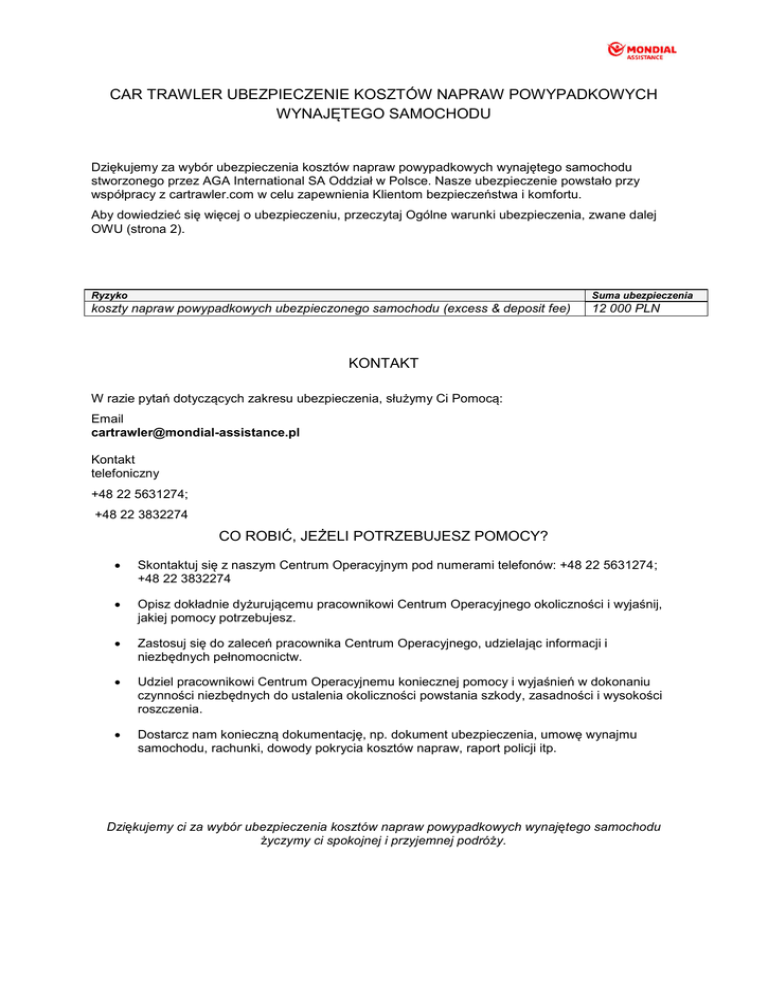 CAR TRAWLER UBEZPIECZENIE KOSZTÓW NAPRAW POWYPADKOWYCH WYNAJĘTEGO SAMOCHODU Dziękujemy za wybór ubezpieczenia kosztów napraw powypadkowych wynajętego samochodu stworzonego przez AGA International SA Oddział w Polsce. Nasze ubezpieczenie powstało przy współpracy z cartrawler.com w celu zapewnienia Klientom bezpieczeństwa i komfortu. Aby dowiedzieć się więcej o ubezpieczeniu, przeczytaj Ogólne warunki ubezpieczenia, zwane dalej OWU (strona 2). Ryzyko Suma ubezpieczenia koszty napraw powypadkowych ubezpieczonego samochodu (excess & deposit fee) 12 000 PLN KONTAKT W razie pytań dotyczących zakresu ubezpieczenia, służymy Ci Pomocą: Email [email protected] Kontakt telefoniczny +48 22 5631274; +48 22 3832274 CO ROBIĆ, JEŻELI POTRZEBUJESZ POMOCY? Skontaktuj się z naszym Centrum Operacyjnym pod numerami telefonów: +48 22 5631274; +48 22 3832274 Opisz dokładnie dyżurującemu pracownikowi Centrum Operacyjnego okoliczności i wyjaśnij, jakiej pomocy potrzebujesz. Zastosuj się do zaleceń pracownika Centrum Operacyjnego, udzielając informacji i niezbędnych pełnomocnictw. Udziel pracownikowi Centrum Operacyjnemu koniecznej pomocy i wyjaśnień w dokonaniu czynności niezbędnych do ustalenia okoliczności powstania szkody, zasadności i wysokości roszczenia. Dostarcz nam konieczną dokumentację, np. dokument ubezpieczenia, umowę wynajmu samochodu, rachunki, dowody pokrycia kosztów napraw, raport policji itp. Dziękujemy ci za wybór ubezpieczenia kosztów napraw powypadkowych wynajętego samochodu życzymy ci spokojnej i przyjemnej podróży. OGÓLNE WARUNKI UBEZPIECZENIA KOSZTÓW NAPRAW POWYPADKOWYCH WYNAJĘTEGO SAMOCHODU 1 2 3 4 5 POSTANOWIENIA OGÓLNE §1 Na podstawie niniejszych OWU AGA International SA Oddział w Polsce zwana dalej Ubezpieczycielem, udziela ochrony ubezpieczeniowej osobom fizycznym w zakresie pokrycia kosztów napraw powypadkowych wynajętego (ubezpieczonego) samochodu. OWU kosztów napraw powypadkowych ubezpieczonego samochodu mają zastosowanie do umów ubezpieczenia zawieranych za pośrednictwem strony internetowej www.arguscarhire.com z osobami fizycznymi lub prawnymi albo jednostkami organizacyjnymi nie posiadającymi osobowości prawnej, które mają miejsce zamieszkania lub siedzibę na terenie Rzeczypospolitej Polskiej (RP). OWU kosztów napraw powypadkowych ubezpieczonego samochodu mają zastosowanie do umów ubezpieczenia zawieranych na rzecz Klientów (ubezpieczonych) cartrawler.com. Warunkiem ważności polisy jest zawarcie umowy wynajmu samochodu za pośrednictwem cartrawler.com na stronie www.arguscarhire.com. Zakup polisy musi nastąpić przed datą i godziną rozpoczęcia wynajmu samochodu określoną w umowie wynajmu samochodu. Ubezpieczenie kosztów napraw powypadkowych ubezpieczonego samochodu ważne jest na terenie RP i terenie państw świata. §2 W sprawach nieuregulowanych w niniejszych OWU mają zastosowanie przepisy kodeksu cywilnego, ustawy o działalności ubezpieczeniowej oraz innych obowiązujących stosownych aktów prawnych. §3 Przez użyte w niniejszych OWU określenia rozumie się: 1 Ubezpieczony – każda osoba fizyczna wskazana w dokumencie ubezpieczenia za którą opłacono składkę, upoważniona do kierowania wynajętym samochodem, posiadająca stałe lub czasowe miejsce pobytu na terenie RP; 2 Ubezpieczający – osoba fizyczna, osoba prawna albo jednostka organizacyjna nie posiadająca osobowości prawnej, która zapłaciła składkę i zawarła z Ubezpieczycielem umowę ubezpieczenia; 3 Ubezpieczyciel – AGA International SA Oddział w Polsce, ul. Domaniewska 50B, 02-672 Warszawa; 4 koszty napraw - koszty napraw ubezpieczonego samochodu w związku z wypadkiem do którego doszło w okresie ubezpieczenia, które Ubezpieczony pokrył w związku z udziałem własnym określonym w umowie wynajmu lub którymi firma/agencja wynajmu obciążyła kwotę depozytu zgodnie z umową wynajmu; 5 kwota depozytu (deposit fee) – kwota będąca zabezpieczeniem pokrycia kosztów napraw, do wysokości której firma/agencja wynajmu może obciążyć Ubezpieczonego w związku z wypadkiem ubezpieczonego samochodu zgodnie z umową wynajmu; 6 okres ubezpieczenia - okres ograniczony datami początku i końca wynajmu samochodu określonymi w umowie wynajmu samochodu, nie dłuższy niż 62 dni; 7 okres wynajmu – okres na jaki została zawarta umowa wynajmu samochodu nie dłuższy niż 62 dni; 8 suma ubezpieczenia - górna granica odpowiedzialności Ubezpieczyciela ustalona dla ryzyka objętego umową ubezpieczenia; 9 Centrum Operacyjne – Mondial Assistance Sp. z o.o. - przedstawiciel Ubezpieczyciela, któremu Ubezpieczony (lub w jego imieniu inna osoba) zobowiązany jest zgłosić zaistniałe zdarzenie objęte ochroną ubezpieczeniową. Adres Centrum Operacyjnego: ul. Domaniewska 50B, 02-672 Warszawa, telefon: + 48 22 563 11 56 + 48 22 383 21 56; 10 teren państw świata – teren państw świata z wyłączeniem: Afganistanu, Białorusi, Kuby, Konga, Iranu, Irak, Wybrzeża Kości Słoniowej, Liberii, Korei Północnej, Myanmar, Sudanu i Zimbabwe; 11 ubezpieczony samochód – samochód będący własnością firmy/agencji wynajmu samochodów, który zgodnie z umową Ubezpieczony zgodził się wynająć. Wynajęty samochód to: 1) samochód osobowy lub osobowo-ciężarowy o ładowności do 3,5 tony i liczbie miejsc pasażerskich nie większej niż 9 (wraz z kierowcą), nie starszy niż dziesięć lat, licząc od daty produkcji pojazdu; 2) który nie będzie użytkowany poza drogami publicznymi; 3) nie jest autem użytkowym, kamperem, motocyklem, motorowerem, skuterem; 12 wypadek - zdarzenie, w wyniku którego ubezpieczony samochód uległ uszkodzeniu lub zniszczeniu: 1) wypadek drogowy przy współudziale innych samochodów lub uczestników ruchu drogowego; 2) pozostałe wypadki powstałe wskutek nagłego działania siły mechanicznej w momencie, zetknięcia się samochodu z innymi pojazdami, osobami, przedmiotami lub zwierz