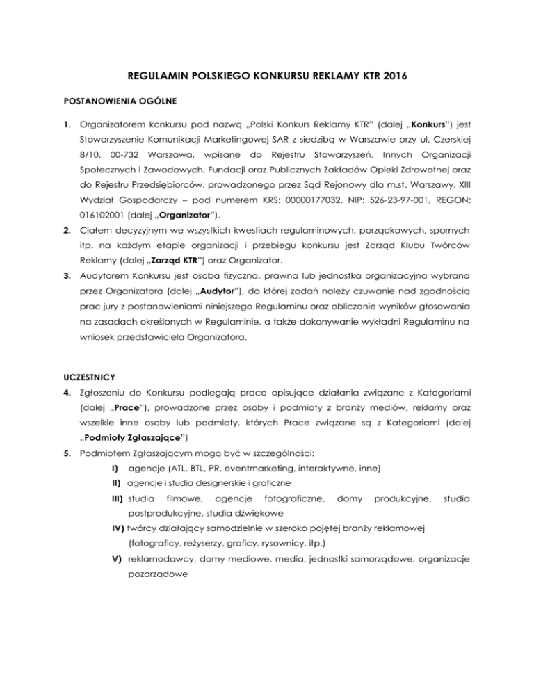 REGULAMIN POLSKIEGO KONKURSU REKLAMY KTR 2016 POSTANOWIENIA OGÓLNE 1. Organizatorem konkursu pod nazwą „Polski Konkurs Reklamy KTR” (dalej „Konkurs”) jest Stowarzyszenie Komunikacji Marketingowej SAR z siedzibą w Warszawie przy ul. Czerskiej 8/10, 00-732 Warszawa, wpisane do Rejestru Stowarzyszeń, Innych Organizacji Społecznych i Zawodowych, Fundacji oraz Publicznych Zakładów Opieki Zdrowotnej oraz do Rejestru Przedsiębiorców, prowadzonego przez Sąd Rejonowy dla m.st. Warszawy, XIII Wydział Gospodarczy – pod numerem KRS: 00000177032, NIP: 526-23-97-001, REGON: 016102001 (dalej „Organizator”). 2. Ciałem decyzyjnym we wszystkich kwestiach regulaminowych, porządkowych, spornych itp. na każdym etapie organizacji i przebiegu konkursu jest Zarząd Klubu Twórców Reklamy (dalej „Zarząd KTR”) oraz Organizator. 3. Audytorem Konkursu jest osoba fizyczna, prawna lub jednostka organizacyjna wybrana przez Organizatora (dalej „Audytor”), do której zadań należy czuwanie nad zgodnością prac jury z postanowieniami niniejszego Regulaminu oraz obliczanie wyników głosowania na zasadach określonych w Regulaminie, a także dokonywanie wykładni Regulaminu na wniosek przedstawiciela Organizatora. UCZESTNICY 4. Zgłoszeniu do Konkursu podlegają prace opisujące działania związane z Kategoriami (dalej „Prace”), prowadzone przez osoby i podmioty z branży mediów, reklamy oraz wszelkie inne osoby lub podmioty, których Prace związane są z Kategoriami (dalej „Podmioty Zgłaszające”) 5. Podmiotem Zgłaszającym mogą być w szczególności: I) agencje (ATL, BTL, PR, eventmarketing, interaktywne, inne) II) agencje i studia designerskie i graficzne III) studia filmowe, agencje fotograficzne, domy produkcyjne, studia postprodukcyjne, studia dźwiękowe IV) twórcy działający samodzielnie w szeroko pojętej branży reklamowej (fotograficy, reżyserzy, graficy, rysownicy, itp.) V) reklamodawcy, domy mediowe, media, jednostki samorządowe, organizacje pozarządowe ZGŁOSZENIA 6. W konkursie mogą brać udział jedynie prace, które ukazały się w mediach, bądź zostały kupione przez reklamodawcę. a. Wyjątkiem są podkategorie specjalne, które dopuszczają prace niepublikowane w mediach, do których należą następujące podkategorie: I) Podkategoria projekty autorskie w kategorii Fotografia b. W konkursie mogą brać udział wyłącznie prace rozpowszechniane lub zakupione przez reklamodawcę pomiędzy 16.03.2015 r. a 29.02.2016 r. 7. Warunkiem uczestnictwa w Konkursie jest dokonanie najpóźniej do 29.02.2016 („Termin”) zgłoszenia (dalej „Zgłoszenie”). a. Zgłoszeń dokonuje się poprzez zarejestrowanie, wypełnienie formularza on-line na platformie http://platforma.sar.org.pl/ (dalej „Platforma”) i wgranie plików na Platformie oraz wydrukowanie, podpisanie i dostarczenie formularza Zbiorczego ( dalej „Formularz”) wraz z dołączonym oświadczeniem oraz powiedzeniem dokonania opłaty za i zgłoszenie zgodnie z instrukcjami i wskazówkami zamieszczonymi na Platformie oraz Formularzu. Formularz Zbiorczy generuje sie automatycznie na platformie po zamknięciu wszystkich zgłoszeń. Podpisane dokumenty zgłoszeniowe wraz z potwierdzeniem dokonania opłaty należy dostarczyć na adres Organizatora tj.: Stowarzyszenie Komunikacji Marketingowej SAR, ul. Czerska 8/10, 00-732 Warszawa. b. Za moment dokonania Zgłoszenia uważa się chwilę doręczenia Organizatorowi podpisanego Formularza wraz z potwierdzeniem dokonania Opłaty, w wysokości określonej w Regulaminie. c. W przypadku przekroczenia Terminu w dokonaniu Zgłoszenia – Organizator może przyjąć Zgłoszenie, które dostanie doręczone Organizatorowi do daty ustalonej z organizatorem (dalej „Ostateczny termin”) po uprzednim zobowiązaniu się Podmiotu Zgłaszającego do zapłaty kary za opóźnienie w wysokości 500 zł + 23% VAT za każdy dzień po przekroczonym terminie. Opłata jest naliczana dla każdego zgłoszenia. 8. Podmiot Zgłaszający oraz osoby podpisane pod Zgłoszeniem oświadczają, że: a. Zapoznały się z regulaminem Konkursu oraz akceptują wszelkie jego postanowienia; b. Dane podane w zgłoszeniu do Konkursu są zgodne z prawdą, a ich przetwarzanie przez organizatora będzie zgodne z prawem i nie naruszy prawa ani jakichkolwiek praw osób trzecich; c. Podmiotowi Zgłaszającemu przysługują prawa do zgłaszanej pracy (dalej „Praca”) oraz wszystkich przesyłanych, załączanych lub zamieszczanych w ramach Zgłoszenia lub Pracy materiałów (dalej łącznie „Materiały”), w zakresie niezbędnym do ich wykorzystania w Konkursie oraz w sposób określony w Regulaminie a ponadto, że w powyższym zakresie prawa te nie są w żaden sposób ograniczone ani obciążone, a korzystanie z nich w zakresie przewidzianym w Regulaminie nie naruszy prawa ani jakichkolwiek praw osób trzecich; d. Podmiot Zgłaszający udziela Organizatorowi nieograniczonej czasowo i terytorialnie licencji (dalej „Licencji”) na przechowywanie Prac oraz Materiałów oraz korzystanie z nich i rozporządzanie nimi w następujących celach: x we wszelkich związanych z Konkursem działaniach informacyjnych, promocyjnych i reklamowych, które obejmować mogą w szczególności wyprodukowane i rozpowszechnianie wydawnictw papierowych (w tym katalogów) oraz płyt CD zawierających Prace/Materiały, publiczne wystawy, pokazy i prezentacje publiczne, publiczne udostępnianie na stronach internetowych oraz w innych sieciach, w tym telefonii mobilnej, publiczne wyświetlanie, odtwarzanie i nadawanie i remitowanie audycji, filmów i prezentacji o Konkursie, publikowanie w Prasie w związku z informowaniem o Konkursie; x w celach szkoleniowych i muzealnych, obejmujących m. in. Prezentację w ramach szkoleń i prelekcji oraz publiczne wystawienie i prezentowanie w salach ekspozycyjnych, udostępnianie w katalogach i archiwach, wraz z prawem do korzystania z dowolnych fragmentów Prac/Mate