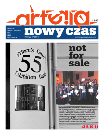 13-20 LONDON 15 maja – 14 czerwca 2012 5 (182) FREE ISSN 1752-0339 not for sale Walne zebranie członków Ogniska Polskiego ma przegłosować 27 maja propozycję sprzedaży posesji w Kensington (wycenianej na 20 mln funtów). Klub jest nierentowny. Czy wszyscy o tym słyszeli? Tymczasem nieoczekiwanie 27 podań członkowskich zostało złożone na ręce prezesa Andrzeja Morawicza. Czy z prawem głosu? Powyżej niedoszli członkowie na pamiątkowym zdjęciu w Ognisku. »3-5,10-11 2| 15 maja – 14 czerwca 2012 | nowy czas ” Czas jest zawsze aktualny Sławomir Mrożek [email protected] 24 kwietnia 2012 roku zmarła Szanowni Państwo Otrzymany wraz z numerem z 12 kwietnia-14 maja liścik, w którym znalazły się słowa „ostatnie wydanie”, w pierwszej chwili zrozumiałam jako zapowiedź końca „Nowego Czasu”, a co najmniej jego przesyłek do mnie. Po namyśle, interpretuję go jako kurtuazyjny gest (przeprosin/usprawiedliwienia) w odniesieniu do nieregularnego pojawiania się pisma, do czego chyba wszyscy już są przyzwyczajeni. Byłoby naturalnie pięknie, gdyby pismo ukazywało się regularnie, i gdyby zdołało sobie zapewnić wsparcie finansowe, także od czytelników (zgłaszam gotowość staropanieńskiego grosza), gotowych zapłacić za to, czego gdzie indziej nie ma. Ślę dobre życzenia i wyrazy poważania. tereSa MYśkow Luxembourg Imię i Nazwisko........................................................................................ Adres............................................................................................................ ........................................................................................................................ Kod pocztowy............................................................................................ Tel................................................................................................................. Liczba wydań............................................................................................ Prenumerata od numeru....................................................(włącznie) Prenumeratę zamówić można na dowolny adres w UK bądź też w krajach Unii. Aby dokonosć zamówienia należy wypełnić i odesłać formularz na adres wydawcy wraz z załączonym czekiem lub postal order Gazeta wysyłana jest w dniu wydania. Czeki prosimy wystawiać na: CZAS PUBLISHERS LTD. 63 Kings Grove London SE15 2NA 63 King’s Grove, London SE15 2NA Tel.: 0207 639 8507, [email protected], [email protected] redaktor naczeLnY: Grzegorz Małkiewicz ([email protected]); redakcja: Teresa Bazarnik ([email protected]), Jacek Ozaist, Daniel Kowalski ([email protected]); WSPÓŁPRACA REDAKCYJNA: Lidia Aleksandrowicz, Krystyna Cywińska, Adam Dąbrowski, Włodzimierz Fenrych, Mikołaj Hęciak, Monika S. Jakubowska, Aleksandra Junga, Andrzej Krauze, Robert Małolepszy, Grażyna Maxwell, Wacław Lewandowski, Michał Opolski, Bartosz Rutkowski, Sławomir Orwat, Aleksandra Ptasińska, Michał Sędzikowski, Wojciech A. Sobczyński, Agnieszka Stando dział Marketingu: tel./fax: 0207 358 8406, mobile: 0779 158 2949 [email protected] Marcin Rogoziński ([email protected]), wYdawca: CZAS Publishers Ltd. © nowyczas Redakcja nie ponosi odpowiedzialności za treść zamieszczanych reklam i ogłoszeń oraz zastrzega sobie prawo niezamieszczenia ogłoszenia. PS. Mam nadzieję, że zechcą Państwo zamieścić poniższą informację, ponieważ najwyraźniej nie dotarła ona do tych czytelników, których może dotyczyć i interesować. W biuletynie dla byłych pracowników BBC, bbc-owski emeryt i były brytyjski lotnik przypomina, że Akcja HEROES RETURN II, finansowana przez Big Lottery Fund (tel. 0845 0000121) wobec niespodziewanie niskiego popytu w 2011 roku, została przedłużona do 31 grudnia 2012. Akcja HEROES RETURN II przewiduje pomoc finansową (w wysokości od £150 na wizytę na terenie Wielkiej Brytanii, £1300 w Europie, po £5500 na Dalekim Wschodzie dla weteranów II wojny światowej, którzy wraz małżonkiem/małżonką pragną odwiedzić teren wojenny, na którym walczyli. Dotyczy to również wdowców i wdów po żołnierzach walczących pod dowództwem brytyjskim. W razie potrzeby przewidziana jest pomoc finansowa na osobę towarzyszącą (opiekuna). O dofinansowanie ubiegać się mogą osoby zamieszkałe na trenie Zjednoczonego Królestwa i Wysp Normandzkich oraz w Republice Irlandii. Informacje można otrzymać z Big Lottery Fund, ale także od weterana, który sam z tej pomocy skorzystał i pragnie je udostępnić towarzyszom broni: Mr TED CACHARET Chairman The 49 Squadron Association 4 Cottage Close Heage, Belper, Derbyshire, DE56 2BS tel. 01773 853181 email: [email protected] Polish Hearth Sir, Not myself being Polish, but married to a Polish lady, I am most distressed by the proposal by Andrzej Morawicz and the Committee to sell the premises of the Polish Hearth Club which has stood as a standard for all free Poles through the dark ages of German and Soviet ocupation and is a living چP Maria Fenrych Naszemu współpracownikowi Włodzimierzowi Fenrychowi i ich Dzieciom Justynie, Łukaszowi i Mateuszowi składamy głębokie wyrazy współczucia Redakcja „Nowego Czasu” monument to the bravest nation in Europe. The Club has historic significance for Poles in the UK far beyond the pecuniary value of the property. Having myself been a member since 1986 I have noticed that, whilst being an important social centre for Poles and their families, it has never been properly run as I understand a Club should be. Mr Andrzej Morawicz has been a Chairman for all these years in good times and now in bad (or terminal). He is an excellent spoksman for the Club and his speeches are always concise and relevant. However it is now the opinion of many if not most people that he has served his time and should withdraw the motion for sale and allow a new Chairman and Committee to take over. Yours sincerely 