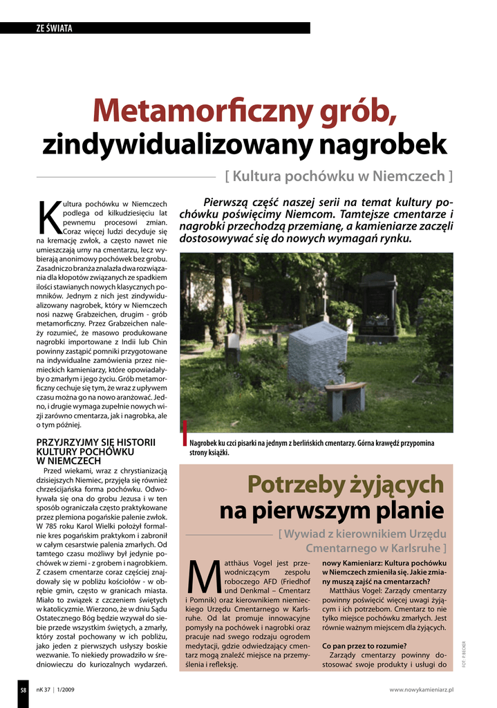 Ze świata Metamorficzny grób, zindywidualizowany nagrobek [ Kultura pochówku w Niemczech ] Przyjrzyjmy się historii kultury pochówku w Niemczech Przed wiekami, wraz z chrystianizacją dzisiejszych Niemiec, przyjęła się również chrześcijańska forma pochówku. Odwoływała się ona do grobu Jezusa i w ten sposób ograniczała często praktykowane przez plemiona pogańskie palenie zwłok. W 785 roku Karol Wielki położył formalnie kres pogańskim praktykom i zabronił w całym cesarstwie palenia zmarłych. Od tamtego czasu możliwy był jedynie pochówek w ziemi - z grobem i nagrobkiem. Z czasem cmentarze coraz częściej znajdowały się w pobliżu kościołów - w obrębie gmin, często w granicach miasta. Miało to związek z czczeniem świętych w katolicyzmie. Wierzono, że w dniu Sądu Ostatecznego Bóg będzie wzywał do siebie przede wszystkim świętych, a zmarły, który został pochowany w ich pobliżu, jako jeden z pierwszych usłyszy boskie wezwanie. To niekiedy prowadziło w średniowieczu do kuriozalnych wydarzeń. 58 nK 37 | 1/2009 Pierwszą część naszej serii na temat kultury pochówku poświęcimy Niemcom. Tamtejsze cmentarze i nagrobki przechodzą przemianę, a kamieniarze zaczęli dostosowywać się do nowych wymagań rynku. Nagrobek ku czci pisarki na jednym z berlińskich cmentarzy. Górna krawędź przypomina strony książki. Potrzeby żyjących na pierwszym planie M [ Wywiad z kierownikiem Urzędu Cmentarnego w Karlsruhe ] atthäus Vogel jest przewodniczącym zespołu roboczego AFD (Friedhof und Denkmal – Cmentarz i Pomnik) oraz kierownikiem niemieckiego Urzędu Cmentarnego w Karlsruhe. Od lat promuje innowacyjne pomysły na pochówek i nagrobki oraz pracuje nad swego rodzaju ogrodem medytacji, gdzie odwiedzający cmentarz mogą znaleźć miejsce na przemyślenia i refleksję. nowy Kamieniarz: Kultura pochówku w Niemczech zmieniła się. Jakie zmiany muszą zajść na cmentarzach? Matthäus Vogel: Zarządy cmentarzy powinny poświęcić więcej uwagi żyjącym i ich potrzebom. Cmentarz to nie tylko miejsce pochówku zmarłych. Jest równie ważnym miejscem dla żyjących. Co pan przez to rozumie? Zarządy cmentarzy powinny dostosować swoje produkty i usługi do www.nowykamieniarz.pl fot: p. becker K ultura pochówku w Niemczech podlega od kilkudziesięciu lat pewnemu procesowi zmian. Coraz więcej ludzi decyduje się na kremację zwłok, a często nawet nie umieszczają urny na cmentarzu, lecz wybierają anonimowy pochówek bez grobu. Zasadniczo branża znalazła dwa rozwiązania dla kłopotów związanych ze spadkiem ilości stawianych nowych klasycznych pomników. Jednym z nich jest zindywidualizowany nagrobek, który w Niemczech nosi nazwę Grabzeichen, drugim - grób metamorficzny. Przez Grabzeichen należy rozumieć, że masowo produkowane nagrobki importowane z Indii lub Chin powinny zastąpić pomniki przygotowane na indywidualne zamówienia przez niemieckich kamieniarzy, które opowiadałyby o zmarłym i jego życiu. Grób metamorficzny cechuje się tym, że wraz z upływem czasu można go na nowo aranżować. Jedno, i drugie wymaga zupełnie nowych wizji zarówno cmentarza, jak i nagrobka, ale o tym później. Ze świata Matthäus Vogel, przewodniczący zespołu roboczego AFD (Friedhof und Denkmal – Cmentarz i Pomnik) i kierownik Urzędu Cmentarnego w Karlsruhe: Zarządy cmentarzy powinny dostosować swoje produkty i usługi do życzeń członków rodziny i wszystkich odwiedzających cmentarz. fot: archiwum M. Vogel życzeń członków rodziny i wszystkich odwiedzających cmentarz. Rodzina powinna mieć możliwość decydowania i współdziałania, co między innymi oznacza, że regulaminy cmentarzy powinny być bardziej elastyczne, na przykład w kwestii aranżacji nagrobków, tudzież godzin odwiedzin. Poza tym rodzina w szerszym znaczeniu tego słowa jest dla mnie, obok najbliższej rodziny zmarłego, ważnym użytkownikiem cmentarza. Kto należy do „rodziny w szerszym znaczeniu”? Do rodziny zaliczam też sąsiadów, przyjaciół, kolegów z pracy, którzy należeli do otoczenia zmarłego. Z tego również powodu zarówno pogrzeby, jak i aranżacja grobu powinny być adresowane także do nich. Dlatego groby muszą być oznaczone nazwiskiem i ogólnie dostępne. Anonimowe pochówki nie spełniają tych warunków, prywatne cmentarze nie zapewniają swobodnego dostępu do grobów, a urna trzymana w domu wyklucza i jedno, i drugie. Poza tym bardzo mnie niepokoi coraz wyraźniejsza tendencja dyktująca traktowanie zmarłych i miejsce pochówku jak przedmiot, o którym można decydować, kierując się egoistycznymi pobudkami. Jaką funkcję spełnia grób? Członkowie rodziny potrzebują miejsca na przeżywanie smutku po www.nowykamieniarz.pl stracie bliskiej osoby. Tu sprawdza się bardzo dobrze grób zmarłego. To tam zmarły pozostaje integralną częścią życia, pozostaje jakby obecny. Smutek jest ważny dla żyjących, jest jednak jednym z najtrudniejszych doznań dla ludzkiej egzystencji. Dlatego cmentarz jest ważnym elementem kultury. Jak to? Cmentarz miejscem kultury? Tak. Jest miejscem historii i zdarzeń, gdzie można przyjrzeć się wspólnej przeszłości, którą dzieliło się ze zmarłym, albo zwyczajnie oddać się refleksji lub pomedytować. Jest również miejscem aktu komunikacyjnego, gdzie spotyka się innych cierpiących, których dotknęło nieszczęście. Poza tym zdobnictwo nagrobków odzwierciedla aktualnie panujące trendy i poczucie estetyki. Cmentarze zawsze były i będą zwierciadłem społeczeństwa. Co się zmieni, gdy zaczniemy postrzegać cmentarz jako miejsce kultury? Wówczas zaczniemy przełamywać niekorzystną tendencję nakazującą cmentarzom samofinansowanie, czyli opłacalność. W końcu dofinansowujemy inne miejsca kultury, jak teatry i muzea, ponieważ nie są w stanie z własnych środków pokryć wszystkich wydatków. Tak samo powinniśmy postępować w przypadku cmentarzy. Rozmawia