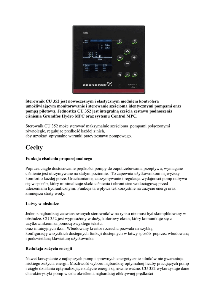 Sterownik CU 352 jest nowoczesnym i elastycznym modułem kontrolera umożliwiającym monitorowanie i sterowanie sześcioma identycznymi pompami oraz pompą pilotową. Jednostka CU 352 jest integralną cześcią zestawu podnoszenia ciśnienia Grundfos Hydro MPC oraz systemu Control MPC. Sterownik CU 352 może sterować maksymalnie sześcioma pompami połączonymi równolegle, regulując prędkość każdej z nich, aby uzyskać optymalne warunki pracy zestawu pompowego. Cechy Funkcja ciśnienia proporcjonalnego Poprzez ciągłe dostosowanie prędkości pompy do zapotrzebowania przepływu, wymagane ciśnienie jest utrzymywane na stałym poziomie. To zapewnia użytkownikom najwyższy komfort o każdej porze. Uruchamianie, zatrzymywanie i regulacja wydajnosci pomp odbywa się w sposób, który minimalizuje skoki ciśnienia i chroni siec wodociągową przed uderzeniami hydraulicznymi. Funkcja ta wpływa też korzystnie na zużycie energi oraz zmniejsza straty wody. Łatwy w obsłudze Jeden z najbardziej zaawansowanych sterowników na rynku nie musi być skomplikowany w obsłudze. CU 352 jest wyposażony w duży, kolorowy ekran, który komunikuje się z uzytkownikiem za pomocą zwykłego tekstu, oraz intuicyjnych ikon. Wbudowany kreator rozruchu pozwala na szybką konfigurację wszystkich dostępnych funkcji dostepnych w łatwy sposób poprzez wbudowaną i podswietlaną klawiaturę użytkownika. Redukcja zużycia energii Nawet korzystanie z najlepszych pomp i sprawnych energetycznie silników nie gwarantuje niskiego zużycia energii. Możliwość wyboru najbardziej optymalnej liczby pracujących pomp i ciągłe działania optymalizujące zużycie energii są równie ważne. CU 352 wykorzystuje dane charakterystyki pomp w celu określenia najbardziej efektywnej prędkości i liczby pomp aby uzyskać prace zestawu pompowego w punkcie najwyższej sprawnosci układu. Monitoring CU 352 zawiera funkcję logera, który umożliwia monitorowanie wydajności systemu. Zapisane dane mogą być wyświetlane na dużym kolorowym ekranie lub eksportowane do komputera w celu dalszej analizy. Monitorowanie wszystkich parametrów pracy umożliwia wcześniejsze reagowanie na awarie przed wystąpieniem istotnych uszkodzeń spowodowanych np. przez pęknięcie rury ... Komunikacja Sterownik CU 352 umożliwia komunikację w wielu standardowych protokołach za pośrednictwem opcjonalnych kart komunikacyjnych. Ale poza tym, posiada także wbudowany port Ethernet umożliwiający dostęp do opcji sterownika za pomocą przeglądarki internetowej. W ten sposób jest możliwe sprawdzenie statusu urządzeń oraz modyfikacje ustawień sterownika. Co więcej kontroler może być wyposażony w moduł komunikacji GRM do rejestrowania i monitorowania poprzez sieć komórkową. Podstawowe funkcje: • • • • • • • Regulacja kaskadowa do 6 pomp 22 różnych języków wyświetlania 3 wejścia analogowe (może być rozbudowane) 2 wyjścia cyfrowe (może być rozbudowane) 3 wejścia cyfrowe (może być rozbudowane) Magistrala GENIbus do komunikacji z pompami Kontrola systemów E, EC, F i S