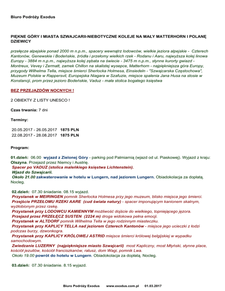 Biuro Podróży Exodus PIĘKNE GÓRY I MIASTA SZWAJCARII-NIEBOTYCZNE KOLEJE NA MAŁY MATTERHORN I POLANĘ DZIEWICY przełęcze alpejskie ponad 2000 m n.p.m., spacery wewnątrz lodowców, wielkie jeziora alpejskie - Czterech Kantonów, Genewskie i Bodeńskie, źródła i przełomy wielkich rzek - Rodanu i Aaru, najwyższa kolej linowa Europy - 3884 m n.p.m., najwyższa kolej zębata na świecie - 3475 m n.p.m., słynne kurorty gwiazd Montreux, Vevey i Zermatt, zamek Chillon na skalistej wysepce, Matterhorn - najpiękniejsza góra Europy, przygody Wilhelma Tella, miejsce śmierci Sherlocka Holmesa, Einsiedeln - "Szwajcarska Częstochowa", Muzeum Polskie w Rappersvil, Europejska Niagara w Szafuzie, miejsce spalenia Jana Husa na stosie w Konstancji, prom przez jezioro Bodeńskie, Vaduz - mała stolica bogatego księstwa BEZ PRZEJAZDÓW NOCNYCH ! 2 OBIEKTY Z LISTY UNESCO ! Czas trwania: 7 dni Terminy: 20.05.2017 - 26.05.2017 1875 PLN 22.08.2017 - 28.08.2017 1875 PLN Program: 01.dzień: 06.00 wyjazd z Zielonej Góry - parking pod Palmiarnią (wjazd od ul. Piaskowej). Wyjazd z kraju: Olszyna. Przejazd przez Niemcy i Austrię. Spacer po VADUZ (stolica maleńkiego księstwa Lichtenstein). Wjazd do Szwajcarii. Około 21.00 zakwaterowanie w hotelu w Lungern, nad jeziorem Lungern. Obiadokolacja za dopłatą. Nocleg. 02.dzień: 07.30 śniadanie. 08.15 wyjazd. Przystanek w MEIRINGEN pomnik Sherlocka Holmesa przy jego muzeum, blisko miejsca jego śmierci. Przejście PRZEŁOMU RZEKI AARE (cud świata natury) - spacer imponującym kanionem skalnym, wyżłobionym przez rzekę. Przystanek przy LODOWCU KAMIENNYM możliwość dojście do wielkiego, topniejącego jęzora. Przejazd przez PRZEŁĘCZ SUSTEN (2224 m) droga widokowa pełna emocji. Przystanek w ALTDORF pomnik Wilhelma Tella w jego rodzinnym miasteczku. Przystanek przy KAPLICY TELLA nad jeziorem Czterech Kantonów - miejsce jego ucieczki z łodzi podczas burzy, dzwonkogra. Przystanek przy KAPLICY KRÓLOWEJ ASTRID miejsce śmierci królowej belgijskiej w wypadku samochodowym. Zwiedzanie LUZERNY (najpiękniejsze miasto Szwajcarii) most Kapliczny, most Młyński, słynne place, kościół jezuitów, kościół franciszkanów, ratusz, dom Wagi, pomnik Lwa. Około 19.00 powrót do hotelu w Lungern. Obiadokolacja za dopłatą. Nocleg. 03.dzień: 07.30 śniadanie. 8.15 wyjazd. Biuro Podróży Exodus www.exodus.com.pl 01.03.2017 Zwiedzanie ZÜRICHU, największego i najbogatszego miasta Szwajcarii Grossmünster, Fraumünster, kościół Św.Piotra, pomnik Zwingliego, ratusz, najdroższa ulica Europy. Zwiedzanie MUZEUM POLSKIEGO w Rappersvil malowniczy średniowieczny zamek nad jeziorem Zürich ze słynnym muzeum oraz polską biblioteką. Zwiedzanie EINSIEDELN (Szwajcarska Częstochowa najważniejsze sanktuarium maryjne Szwajcarii) wspaniały pielgrzymkowy klasztor benedyktynów z cudowną figurą Czarnej Madonny. Czas wolny w LUZERNIE. Okolo 19.00 powrót do hotelu. Obiadokolacja za dopłatą. Nocleg. 04.dzień: 07.00 śniadanie. 07.45 wyjazd. Przystanek w INTERLAKEN spacer po pięknym ogrodzie kasyna, zegar kwiatowy. Przystanek w LAUTERBRUNNEN fakultatywny wyjazd na Jungfraujoch (3475 m !!!) pod Dziewicą (4158 m, lista UNESCO), najwyższą koleją szynową na świecie NAJWIĘKSZA GÓRSKA ATRAKCJA W EUROPIE !!! - możliwość wejścia do wnętrza lodowca, oraz spacerowania po śniegu. Przystanek na PRZEŁĘCZY GRIMSEL (2165 m) - źródła rzeki Aare, mini ogród zoologiczny, punkt widokowy. Przystanek przy LODOWCU RODANU pod przełęczą Furka - malownicze źródła rzeki Rodan, możliwość wejścia do wnętrza lodowca, wybitny punkt widokowy. Przystanek w BRIG imponujący renesansowy zamek Wielkiego Stockalpera. Przystanek w STALDEN wysoki most nad głębokim przełomem strumienia. Około 21.00 zakwaterowanie w hotelu w Täsch. Obiadokolacja za dopłatą. Nocleg. 05.dzień: 07.30 śniadanie. 08.15 wyjazd specjalnymi mikrobusami do Zermatt. Zwiedzanie ZERMATT (najsłynniejszy i najbardziej luksusowy górski kurort Szwajcarii pod MATTERHORNEM - najpiękniejszą górą Europy). Możliwość fakultatywnego wyjazdu na MAŁY MATTERHORN (3884 m !!!), najwyższą koleją linową w Europie !!! - możliwość wejścia do wnętrza lodowca i spacerowania po śniegu. Czas wolny w Zermatt. Około 19.00 powrót do hotelu. Obiadokolacja za dopłatą. Nocleg. 06.dzień: 07.00 śniadanie. 07.45 wyjazd. Zwiedzanie SION (dawna stolica księstwa biskupiego) stare miasto, katedra romańska, twierdza z bazyliką Valere. Zwiedzanie ZAMKU CHILLON (najsłynniejszy średniowieczny zabytek Szwajcarii) - malownicza twierdza na wysepce jeziora Genewskiego, połączonej groblą z lądem. Spacer po MONTREUX (najsłynniejszy kurort Szwajcarskiej Riwiery nad jeziorem Genewskim) promenada z pomnikami sławnych muzyków jazzowych i rockowych, Pałac Festiwalowy. Spacer po VEVEY (słynny kurort nad jeziorem Genewskim) promenada z pomnikiem Chaplina, pamiątki po Henryku Sienkiewiczu i Ignacym Paderewskim. Zwiedzanie BERNA (stolica Szwajcarii, lista UNESCO) przełom Aaru, stare miasto, Parlament, gotycka kolegiata ze słynnym portalem, bramy, zabytkowe fontanny, żywe niedźwiedzie-symbol miasta. Około 20.00 zakwaterowanie w hotelu w rejonie Zürichu. Obiadokolacja za dopłatą. Nocleg. 07.dzień: 07.00 - śniadanie. 07.45 wyjazd. Przystanek przy WODOSPADZIE RENU (Europejska Niagara - imponująca kaskada na rzece Ren w mieście Szafuzie). Spacer po starym bajkowym miasteczku STAIN-AM-RHEIN Wjazd do Niemiec. Przejazd przez KONSTANCJĘ Przeprawa promowa przez JEZIORO BODEŃSKIE (2. największe jezioro alpejskie). Spacer po starym bajkowym mieście MEERSBURG Przejazd przez Niemcy. Wjazd do kraju: Olszyna. Około 01.00 - rozwiązanie imprezy w Zielonej Górze parking pod Palmiarnią. Biuro Podróży Exodus www.exodus.com.pl 01.03.2017 W cenie: autokar: wysokopokładowy, klimatyzacja, WC, video, napoje zimne i gorące (płatne) ok. 3050 km noclegi: 6 x hotele**/***, pokoje 2,3-osobowe z łazienk