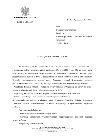 WOJEWODA ŁÓDZKI Łódź, 30 października 2015 r. PS-II.431.24.2015 Pani Bogusława Szymańska Dyrektor Rodzinnego Domu Dziecka w Tobiaszach Tobiasze 14 97-225 Ujazd WYSTĄPIENIE POKONTROLNE Na podstawie art. 122 w związku z art. 186 pkt 3 ustawy z dnia 9 czerwca 2011 r. o wspieraniu rodziny i systemie pieczy zastępczej (Dz. U. z 2015 r. poz. 332, ze zm.), zwanej dalej ustawą, w Rodzinnym Domu Dziecka w Tobiaszach, Tobiasze 14, 97-225 Ujazd, przeprowadzona została w dniu 13 października 2015 roku kontrola w trybie uproszczonym. Kontrola przeprowadzona została przez 3-osobowy zespół kontrolerów będących pracownikami Wydziału Polityki Społecznej Łódzkiego Urzędu Wojewódzkiego w Łodzi: - Magdalenę Łongwa-Kurosz – inspektora wojewódzkiego w Oddziale do Spraw Rodziny (osoba pełniąca funkcję kierownika zespołu kontrolerów), - Magdalenę Sobczyk-Wierzbicką– inspektora wojewódzkiego w ww. Oddziale, - Roberta Pipińskiego - inspektora wojewódzkiego w ww. Oddziale na podstawie upoważnień wydanych przez Dyrektora Wydziału Polityki Społecznej Łódzkiego Urzędu Wojewódzkiego w Łodzi działającego z upoważnienia Wojewody Łódzkiego. Zakres kontroli obejmował: - zapewnienie wychowankom bieżącej opieki, -tworzenie środowiska wychowawczego zapewniającego bezpieczeństwa, - organizacji czasu wolnego. ŁÓDZKI URZĄD WOJEWÓDZKI W ŁODZI 90-926 Łódź, ul. Piotrkowska 104, tel.: (+48) 42 664 10 00, fax: (+48) 42 664 10 40 Elektroniczna Skrzynka Podawcza ePUAP: /lodzuw/skrytka www.lodzkie.eu dzieciom poczucie Celem kontroli było również dokonanie oceny obszarów działalności Placówki, które pozostawały w zainteresowaniu Rzecznika Praw Dziecka. Dotyczyły one: - stosowania przez opiekunów przemocy fizycznej i psychicznej wobec wychowanków, - nierespektowania prawa dzieci do wolności wyznania, - stosowania wobec wychowanków poniżających kar (przetrzymywanie w piwnicy/szopie). Kwestie te były badane podczas kontroli działalności Placówki w zakresie realizacji standardu opieki i wychowania przeprowadzonej przez pracowników Wydziału Polityki Społecznej Łódzkiego Urzędu Wojewódzkiego w Łodzi w dniu 15 października 2014 roku, jednak zebrany podczas czynności kontrolnych materiał dowodowy nie pozwolił na potwierdzenie zasadności zarzutów. Z uwagi jednak na sposób wypowiadania się wychowanków, który sugerował brak swobody i spontaniczności, wygłaszanych przez dzieci stwierdzeń i opinii nie uznano wówczas za wiarygodne. Na stanowisku dyrektora jednostki kontrolowanej zatrudniona jest od 1 marca 2014 r. Pani Bogusława Szymańska. Ustaleń dokonano na podstawie rozmów z: - dziećmi obecnymi w Placówce – 3 dziewczynkami i 2 chłopcami w wieku 9-15 lat, - wychowawcami: Panią Agatą Szymańską i Panem Markiem Szymańskim, - dyrektorem Panią Bogusławą Szymańską oraz jej mężem - Panem Mieczysławem Szymańskim. Zapewnienie wychowankom bieżącej opieki W dniu kontroli w Rodzinnym Domu Dziecka w Tobiaszach umieszczonych było ośmioro wychowanków w wieku od 9 do 18 lat. Pięcioro z nich przebywało po zajęciach szkolnych na terenie Placówki, dwoje w Specjalnym Ośrodku Szkolno-Wychowawczym w Stemplewie, a 16-letnia wychowanka po skończonych lekcjach miała udać się do swojej mamy. Nastolatka planowała również spędzić noc w domu rodzinnym by następnego dnia udać się do Powiatowego Centrum Pomocy Rodzinie w Tomaszowie Mazowieckim w celu zaplanowania procesu usamodzielnienia (dowody kontroli str. 13-14). Podczas pobytu kontrolujących w placówce Pani dyrektor i wychowawcy nie próbowali uzyskać informacji czy wychowanka spotkała się z mamą. Nie wiedziano również, czy następnego dnia ktoś z Placówki zamierza towarzyszyć dziewczynie podczas wizyty w PCPR. ŁÓDZKI URZĄD WOJEWÓDZKI W ŁODZI 90-926 Łódź, ul. Piotrkowska 104, tel.: (+48) 42 664 10 00, fax: (+48) 42 664 10 40 Elektroniczna Skrzynka Podawcza ePUAP: /lodzuw/skrytka www.lodzkie.eu Organizacja czasu wolnego Z relacji wychowanków wynikało, że: - po skończonych lekcjach dzieci uczestniczą w dodatkowych zajęciach organizowanych na terenie szkoły. Są to głównie zajęcia edukacyjno-wyrównawcze (z matematyki, języka polskiego, języka angielskiego, sporadycznie z fizyki) oraz spotkania z psychologiem i pedagogiem, a także zajęcia taneczne (1 dziewczynka), trening piłki nożnej w ramach SKS (1 chłopiec), koło dziennikarskie (1 dziewczynka), - po powrocie ze szkoły i zjedzeniu obiadu dzieci odrabiają lekcje z pomocą osób dorosłych. Nauka i odrabianie prac domowych zajmuje znaczą część czasu popołudniowo-wieczornego, - w dni wolne od nauki (soboty, niedziele) tylko dwie dziewczynki pozostają na terenie Rodzinnego Domu Dziecka. Pozostałe dzieci urlopowane są do domów rodziców lub innych członków rodziny, z tym, że 2 wychowanków przebywających w Specjalnym Ośrodku Szkolno-Wychowawczym w Stemplewie spędza w nim średnio co drugi weekend. Siostry, które nie są urlopowane do domu rodzinnego czas wolny spędzają z Państwem Szymańskimi uczestnicząc w czynnościach związanych z prowadzeniem domu (np. zakupy, sprzątanie, przygotowywanie posiłków), praktykami religijnymi czy utrzymywaniem kontaktów z rodziną Państwa Szymańskich i ich znajomymi, - dzieci uczestniczą w zajęciach rekreacyjnych i wydarzeniach kulturalnych tylko wówczas, gdy są one organizowane przez szkoły (wycieczki, wyjścia do kina, teatru) lub przez PCPR w Tomaszowie Mazowieckim (np. we wrześniu dzieci uczestniczyły w wycieczce do wrocławskiego ZOO), - wychowankowie deklarowali, iż mają zgodę opiekunów na spotykanie się z rodzicami, osobami bliskimi, kolegami i koleżankami na terenie placówki, mogą również zapraszać znajomych na swoje urodziny. Przyznały jednak, że nie chcą by rówieśnicy odwiedzali ich w Rodzinnym Domu Dziecka. Tworzenie środowiska wychowawczego zapewniającego dzieciom poczucie bezpieczeństwa 