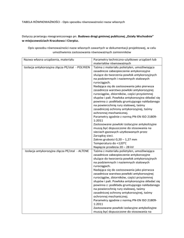TABELA RÓWNOWAŻNOŚCI - Opis sposobu równoważności nazw własnych Dotyczy przetargu nieograniczonego pn. Budowa drogi gminnej publicznej „Działy Wschodnie” w miejscowościach Kraczkowa i Cierpisz. Opis sposobu równoważności nazw własnych zawartych w dokumentacji projektowej, w celu umożliwienia zastosowania równoważnych zamienników Nazwa własna urządzenia, materiału Izolacja antykorozyjna złącza PE/stal - POLYKEN Izolacja antykorozyjna złącza PE/stal - ALTENE Parametry techniczno-użytkowe urządzeń lub materiałów równoważnych Taśma z materiału polietylen, umożliwiająca zasadnicze zabezpieczenie antykorozyjne służące do tworzenia powłok antykorozyjnych na podziemnych i naziemnych stalowych rurociągach. Nadająca się do zastosowania jako pierwsza zasadnicza warstwa powłoki antykorozyjnej rurociągów, zbiorników, części przyziemnej słupów i pali. Powłoka antykorozyjna składać się powinna z: podkładu gruntującego nakładanego na powierzchnię rury stalowej, taśmy zasadniczej ochrony antykorozyjnej, taśmy ochronnej mechanicznej. Parametry zgodnie z normą PN-EN ISO 218091:2011 Zastosowane powłoki izolacyjne antykolizyjne muszą być dopuszczone do stosowania na sieciach gazowych użytkowanych przez Zarządcę sieci. Zakres grubości 0,20 – 1,27 mm Temperatura do +120oC Napięcie przebicia 20 – 28 kV Taśma z materiału polietylen, umożliwiająca zasadnicze zabezpieczenie antykorozyjne służące do tworzenia powłok antykorozyjnych na podziemnych i naziemnych stalowych rurociągach. Nadająca się do zastosowania jako pierwsza zasadnicza warstwa powłoki antykorozyjnej rurociągów, zbiorników, części przyziemnej słupów i pali. Powłoka antykorozyjna składać się powinna z: podkładu gruntującego nakładanego na powierzchnię rury stalowej, taśmy zasadniczej ochrony antykorozyjnej, taśmy ochronnej mechanicznej. Parametry zgodnie z normą PN-EN ISO 218091:2011 Zastosowane powłoki izolacyjne antykolizyjne muszą być dopuszczone do stosowania na Izolacja antykorozyjna złącza PE/stal - PRIMER HOBAS AROT/AROTT Aste Fastener Taśma Denso sieciach gazowych użytkowanych przez Zarządcę sieci. Zakres grubości 0,50 – 1,02 mm Temperatura do +120oC Rekomendowany zakład 50% Podkład gruntujący stosowany przy izolacjach antykorozyjnych Parametry zgodnie z normą PN-EN ISO 218091:2011 Powłoki izolacyjne antykolizyjne muszą być dopuszczone do stosowania na sieciach gazowych użytkowanych przez Zarządcę sieci. Nazwa Hobas pojawia się w opisie pozycji przedmiaru ze względu na nazwę pozycji przedmiarowej wynikającej z KNNR Cała nazwa tej pozycji to KNNR 4 1606-02 Próba wodna szczelności sieci wodociągowych z rur typu HOBAS, PCW, PVC, PE, PEHD o śr. 160 mm Rura ochronna (osłonowa) wykonana z tworzywa sztucznego (HDPE). Powinna umożliwiać zastosowanie do zabezpieczania istniejącej infrastruktury w postaci przewodów lub rur. Powinna posiadać możliwość wzdłużnego dzielenia i możliwość jej zabudowy na działającej instalacji. Przy usuwaniu kolizji z istniejącą infrastrukturą, dopuszczalne są rury osłonowe dwudzielne z tworzywa sztucznego (HDPE). Sztywność obwodowa powinna wynosić od 13 -8 kN/m2 w zależności od średnicy rur. Średnice od 50 – 233mm. Oznaczniki nakładane na kable nn i SN. Wykonane powinny być z poliamidu 6, tworzywa sztucznego samogasnocącego, mocowane za pomocą opasek zaciskowych, koloru białego z wypalaną nazwą użytkownika kabla, typem kabla i napięciem, nazwą linii kablowej, nazwą firmy układającej kabel. Wymiar oznacznika powinien wynosić 80x50x3mm. Taśma hydroizolacyjna, antykorozyjna i antyelektrostatyczna do bezpośredniego izolowania. Taśma powinna być wykonana z tkaniny nasyconej masą impregnacyjną i powinna być zawinięta w folię. Powinna umożliwiać zastosowanie jej do izolowania urządzeń instalowanych w ziemi, w pomieszczeniach wilgotnych, takich jak: Rurociągi stalowe lub betonowe. Armatura stalowa i inne drobne urządzenia. Taśma COT Hak SOT Klamerka COT Album linii napowietrznych nn Tom I ELprojekt Poznań 1992r. oraz Katalog do projektowania linii nn z przewodami izolowanymi samonośnymi ENSTO 2004r. Uchwyt odciągowy typu PA MALIKO Śruby typu SOS COVALENE – opaska termokurczliwa Połączeń spawanych, kołnierzowych, PE/stal, urządzeń i elementów stalowych na czas transportu i składowania. Izolacji antykorozyjnej i przeciwwilgociowej w tunelach przepustach i innych przejściach podziemnych. Taśma powinna posiada możliwość być nawijania w obecności wilgoci na zabezpieczanej powierzchni oraz umożliwiać nawijanie na przedmioty o skomplikowanym kształcie. Taśma powinna być o szerokości 20cm. Taśma ze stali nierdzewnej o wymiarach 0,7x20 i dopuszczalnej sile jednego zwoju 784 daN. Powinna umożliwiać do mocowanie osprzętu elektrycznego na żerdziach słupowych Haki stalowe ocynkowane na gorąco o sile użytkowej 11-27kN. Powinny umożliwiać mocowania linii energetycznych izolowanych na żerdziach słupowych Element spinający taśmę stalową powinien umożliwiać mocowanie osprzętu elektrycznego na żerdziach słupowych. Musi być wykonany ze stali nierdzewnej. Minimalna wytrzymałość klamerki na zrywanie 0,7kN/mm2 Katalog do projektowania linii nn z przewodami izolowanymi samonośnymi akceptowany zatwierdzony przez energolinię – organ zatwierdzający oraz akceptujący zastosowanie produktów w energetyce Uchwyt odciągowy stosowany do podwieszania w liniach napowietrznych kabli miedzianych, samonośnych ze stalową linką nośną (np. typu XzTKMXpwn). Średnica linki nośnej kabla 3-6 mm, długość linki uchwytu od korpusu do szekli zabezpieczającej 200 mm, min. siła zrywająca 250 daN. Korpus uchwytu wykonany z polimeru odpornego na ultrafiolet, kliny z tworzywa termoplastycznego odpornego na ultrafiolet. Śruba hakowa umożliwiająca zawieszenia odporowe przewodu telekomunikacyjnego. Materiał wykonania - 
