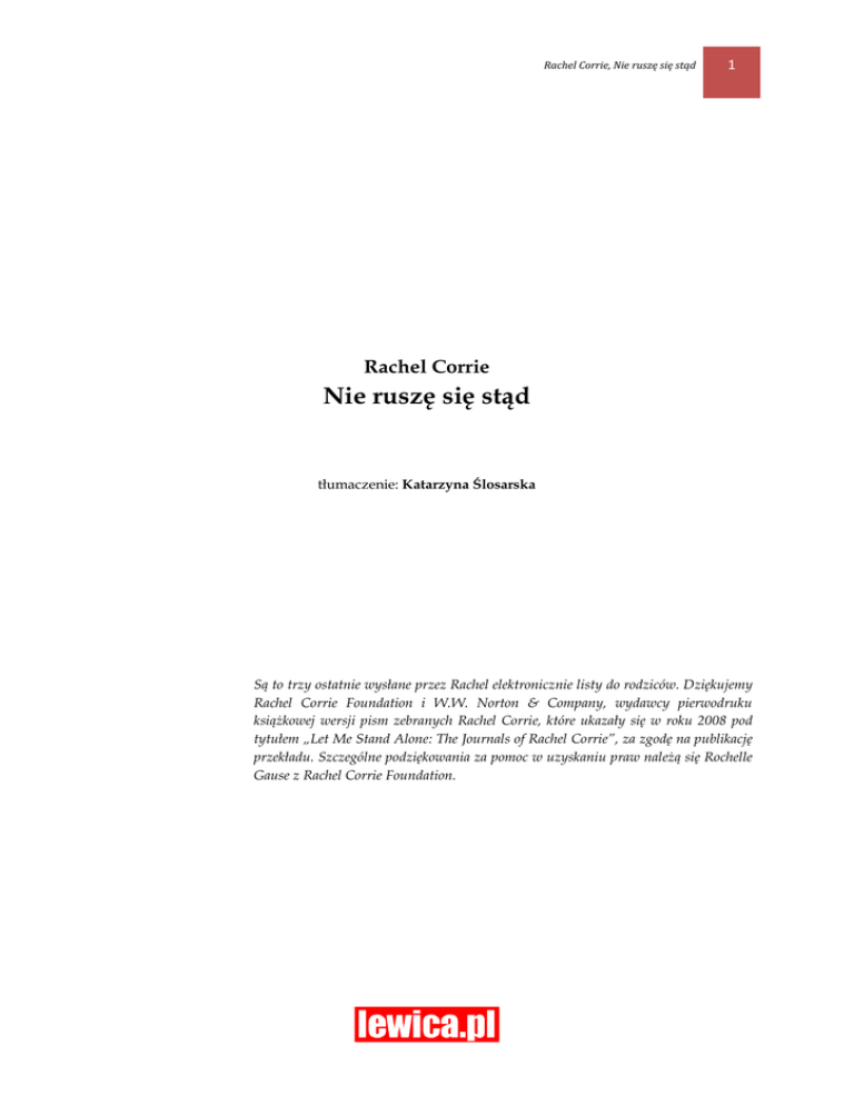 Rachel Corrie, Nie ruszę się stąd 1 Rachel Corrie Nie ruszę się stąd tłumaczenie: Katarzyna Ślosarska Są to trzy ostatnie wysłane przez Rachel elektronicznie listy do rodziców. Dziękujemy Rachel Corrie Foundation i W.W. Norton & Company, wydawcy pierwodruku książkowej wersji pism zebranych Rachel Corrie, które ukazały się w roku 2008 pod tytułem „Let Me Stand Alone: The Journals of Rachel Corrie”, za zgodę na publikację przekładu. Szczególne podziękowania za pomoc w uzyskaniu praw należą się Rochelle Gause z Rachel Corrie Foundation. Rachel Corrie, Nie ruszę się stąd 2 27 lutego 2003 Mamo, Kocham Cię. Bardzo za Tobą tęsknię. Śnią mi się czołgi i buldożery, które jeżdżą dokoła naszego domu, podczas gdy my siedzimy w środku. Czasami adrenalina działa znieczulająco przez całe tygodnie – po to, by pewnego wieczoru lub nocy realność obecnej sytuacji znów mnie dopadła. Naprawdę boję się o ludzi tutaj. Wczoraj widziałam jak ojciec wyprowadził za rękę dwójkę malutkich dzieci wystawiając je przy tym na widok czołgów, wieży snajperskiej, buldożerów i dżipów, bo myślał że jego dom zostanie wysadzony w powietrze. Razem z Jenny zostałyśmy w domu z kilkoma innymi kobietami i dwójką małych dzieci. To przez nasz błąd w tłumaczeniu pomyślał, że jego dom ma zostać wysadzony. Chociaż skoro przylega do ulicy, która jest zaraz obok osiedla Gusz Katif, to pewnie tylko kwestia czasu. Tak naprawdę armia izraelska była akurat w trakcie detonacji materiałów wybuchowych znajdujących się w gruncie nieopodal. Materiałów, które najwyraźniej zostały zainstalowane przez Palestyński ruch oporu. To jest ta sama okolica, gdzie w niedzielę wyprowadzono i przytrzymano 150 mężczyzn strzelając ponad nimi i dookoła nich, podczas gdy czołgi i buldożery równały z ziemią 25 szklarni, źródło utrzymania trzystu ludzi. Materiały wybuchowe znajdowały się tuż przed szklarniami, zaraz przy wjeździe, przez który czołgi mogłyby powrócić. Przeraził mnie fakt, że ten mężczyzna uważał narażenie siebie i dzieci na obecność czołgów za mniejsze ryzyko od pozostania w domu. Bardzo się bałam, że zostaną zastrzeleni i próbowałam stać między nimi a czołgiem. Tak jest każdego dnia, ale ten ojciec z dwójką małych dzieci, wyglądający tak smutno, w tym szczególnym momencie przykuł moją uwagę. Pewnie dlatego, że czułam, że to nasz błąd w tłumaczeniu doprowadził go do opuszczenia domu. Wiele myślałam o tym, co mówiłaś mi przez telefon - że przemoc ze strony Palestyńczyków nie ułatwia sytuacji. Sześćdziesiąt tysięcy robotników z Rafah pracowało w Izraelu jeszcze dwa lata temu. Teraz tylko sześciuset może dostać się do Izraela, by pracować. Z tych sześciuset wielu się wyprowadziło, bo przez obecność trzech punktów kontrolnych między nami a Aszkelonem (najbliższe miasto w Izraelu) dotychczasowa czterdziestominutowa jazda stała się w dwunastogodzinną wyprawą, czasem nie do przebycia. Poza tym to, co w 1999 stanowiło źródło gospodarczego rozwoju Rafah, zostało kompletnie zniszczone: międzynarodowe lotnisko w Gazie (pasy startowe zdemolowane, zupełnie zamknięte), granica dla handlu z Egiptem (teraz stoi tam wielka izraelska wieża snajperska w samym środku przejścia granicznego), dostęp do oceanu (zupełnie odcięci przez ostatnie dwa lata przez punkt kontrolny i osiedle Gusz Katif), wioska Mawassi, której nie wolno opuszczać, ani odwiedzać ludziom w wieku od 14 do 35 lat. Studnie w osadzie są głębsze niż studnie tutaj. Osady w Strefie Gazy są umiejscowione na zachodzie, ponad warstwą wodonośną ze świeżą wodą. Poza tym IDF [Israeli Defense Forces, Siły Obronne Izraela] zniszczyły dwie studnie, o czym Ci już opowiadałam. Rachel Corrie, Nie ruszę się stąd 3 Liczba domów zniszczonych od czasu rozpoczęcia tej Intifady jest niemal równa sześciuset. Na ogół są to domy należące do osób nie mających żadnych związków z ruchem oporu, a które po prostu znalazły się blisko granicy. Większość z tych budynków przeznaczona była dla uchodźców, którzy przybyli tutaj w 1948, kiedy ich domy w Izraelu / Palestynie historycznej przestały się już nadawać do zamieszkania. W 1948 Rafah składało się z trzech dużych rodzin i około 600 ludzi. Wielu z nich zostało już przeniesionych od czasu przybycia do Rafah, przede wszystkim do obozów kanadyjskich i brazylijskich, które z kolei zostały przemieszczone z powrotem do Strefy Gazy, kiedy Izrael wycofał się z Synaju. Dołącz do tego zabójstwa odbywające się co parę dni. Wydaje mi się, że obecnie można oficjalnie uznać Rafah za najbiedniejsze miejsce na ziemi. Jeszcze do niedawna była tu klasa średnia. Pewnie czytasz teraz o tym w książce Amiry Hass. Doniesiono nam też kiedyś, że załadunek z kwiatami z Gazy do Europy był opóźniony o dwa tygodnie na przejściu granicznym w Erez z powodu kontroli bezpieczeństwa. Możesz wyobrazić sobie jaką wartość miały dwutygodniowe cięte kwiaty na europejskim rynku, więc handel ustał. A potem buldożery niszczą ludziom ogrody i działki warzywne. Co im pozostaje? Powiedz mi, jeśli masz jakiś pomysł. Ja nie mam żadnego. Więc jeśli ktoś mówi, że jakiś akt palestyńskiej przemocy usprawiedliwia działania Izraela, powątpiewam w takie rozumowanie nie tylko w świetle prawa międzynarodowego, które uznaje prawo ludzi do uzasadnionej zbrojnej walki w obronie swojej ziemi i swoich rodzin; powątpiewam w takie rozumowanie nie tylko w świetle IV Konwencji Genewskiej, która zakazuje stosowania odpowiedzialności zbiorowej, zakazuje przesiedlania populacji kraju okupującego na teren okupowany, zakazuje ograniczania dostępu do źródeł wody i niszczenia cywilnej infrastruktury takiej jak gospodarstwa. Powątpiewam w takie rozumowanie także dlatego, że za zupełnie niedorzeczne uważam przekonanie, że pię