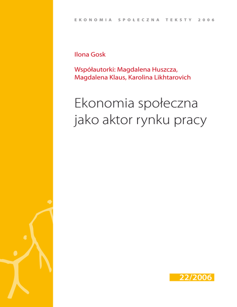 E K O N O M I A S P O Ł E C Z N A T E K S T Y 2 0 0 6 Ilona Gosk Współautorki: Magdalena Huszcza, Magdalena Klaus, Karolina Likhtarovich Ekonomia społeczna jako aktor rynku pracy 22/2006 Ilona Gosk 22/2006 Streszczenie Jednym z ważniejszych zadań ekonomii społecznej jest integracja grup wykluczonych, między innymi poprzez pracę. Podmioty ekonomii społecznej działające na rynku pracy pełnią różne funkcje: pracodawcy, instytucji wspierającej zatrudnienie, dostarczyciela usług rynku pracy czy rzecznika. W opracowaniu koncentrujemy się na wybranych funkcjach i podmiotach – analizujemy potencjał organizacji pozarządowych jako pracodawców i opisujemy specyfikę świadczonych przez nie usług. Przedstawiamy również spółdzielnie socjalne, jako podmioty torujące swoim pracownikom wejście na otwarty rynek pracy. W podsumowaniu wskazujemy obszary dalszych poszukiwań, które pozwoliłyby sprecyzować rekomendacje dotyczące formułowania aktywnych polityk rynku pracy w zakresie reintegracji zawodowej grup wykluczonych. Autorzy Ilona Gosk – Prezes Fundacji Inicjatyw Społeczno-Ekonomicznych, od 2004 roku menedżer projektu „Bezrobocie – co robić?”, współautorka publikacji „Bezrobocie – co robić? Rola organizacji pozarządowych na rynku usług pracy” oraz „Zarządzenie, planowanie i ocena własnych działań”, publikacja wydana w ramach projektu „Wiedza i doświadczenie”, Warszawa 2006. Magdalena Huszcza – psycholog, członek zespołu programu „Bezrobocie – co robić?”, realizowanego przez Fundację Inicjatyw Społeczno-Ekonomicznych. Magdalena Klaus – andragog, trener, koordynator Szkoły Przedsiębiorczości FISE, członek zespołu programu „Bezrobocie- co robić?”, realizowanego przez Fundację Inicjatyw Społeczno-Ekonomicznych. Karolina Likhtarovich – socjolog, członek zespołu programu „Bezrobocie – co robić?”, realizowanego przez Fundację Inicjatyw Społeczno-Ekonomicznych. Fundacja Inicjatyw Społeczno-Ekonomicznych (FISE) to organizacja pozarządowa, założona w 1990 r. Jej misją jest wspieranie publicznych i prywatnych służb zatrudnienia w coraz lepszym działaniu na rzecz aktywizacji zawodowej osób bezrobotnych i poszukujących pracy. FISE wypełnia swoją misję poprzez wspieranie merytoryczne instytucji związanych z rynkiem pracy oraz lobbing na rzecz rozwiązań systemowych z zakresu usług zatrudnienia. W obszarze zainteresowań organizacji znajdują się również podmioty ekonomii społecznej, które pomagają swoim beneficjentom w powrocie na rynek pracy. FISE jest administratorem projektu „W poszukiwaniu polskiego modelu ekonomii społecznej”. Więcej informacji na stronie www.fise.org.pl II Ekonomia społeczna jako aktor rynku pracy 22/2006 Spis treści 1. Wstęp 4 2. Rynek pracy w Polsce 5 3. Organizacje pozarządowe jako usługodawcy na rynku pracy 7 4. Organizacje pozarządowe jako pracodawcy 9 5. Spółdzielnie socjalne 11 6. Rekomendacje do dalszych poszukiwań 12 3 Ilona Gosk 22/2006 1. Wstęp Jedną z ważnych funkcji ekonomii społecznej jest podnoszenie zatrudnienia, a przez to integracja społeczna grup wykluczonych. Funkcja podmiotów ekonomii społecznej aktywnych na rynku pracy W przypadku grup wykluczonych z rynku pracy klasyczne instrumenty (doradztwo zawodowe, pośrednictwo, szkolenia) często przynoszą mizerne rezultaty, w szczególności wtedy, kiedy miarą ich skuteczności jest zdobycie trwałego zatrudnienia. W takich przypadkach konieczne okazuje się budowanie całych sekwencji wsparcia, obejmujących również doświadczenie pracy, często w warunkach dopasowanych do możliwości i potrzeb danej osoby; doświadczenie, które pozwoli beneficjentom na nabycie nawyku pracy i przygotuje ich do wejścia lub powrotu na otwarty rynek pracy. W przypadku niektórych grup stworzenie miejsca pracy dopasowanego do możliwości i potrzeb może w ogóle warunkować podjęcie zatrudnienia. Z tego punktu widzenia podmioty ekonomii społecznej tworzące miejsca pracy dla grup wykluczonych są jądrem tej ekonomii. yy yy yy yy 6TVHPEBXDB SZOLVQSBDZ 1SBDPEBXDB *OTUZUVDKBXTQJFSBKŕDB [BUSVEOJFOJF [BUSVEOJFOJF TPDKBMOF 3[FD[OJL grup społecznych oraz spółdzielnie socjalne, które z definicji powinny pełnić rolę przyczółka dla osób, które nie potrafią się odnaleźć na otwartym rynku. Koncentrujemy się na tych podmiotach, ponieważ tu dystans inicjatorów działań do ostatecznych beneficjentów jest stosunkowo najmniejszy, czasami są to wręcz działania o charakterze samozatrudnieniowym. Pozwala to mieć nadzieję, że – przynajmniej z punktu widzenia beneficjentów – najlepiej odpowiadają one na ich potrzeby. Podmioty ekonomii społecznej aktywne na rynku pracy pełnią następujące funkcje: usługodawcy rynku pracy – świadczenie usług takich, jak szkolenia, poradnictwo, pośrednictwo itp., pracodawcy – tworzenie miejsc pracy dedykowanych grupom wykluczonym, instytucji wspierającej zatrudnienie – inkubowanie przedsięwzięć zatrudnieniowych, pomoc w tworzeniu miejsc pracy, rzecznika – występowanie w imieniu grup wykluczonych. W kolejnych rozdziałach scharakteryzujemy rynek pracy w Polsce, opiszemy organizacje pozarządowe świadczące usługi rynku pracy i organizacje pozarządowe występujące w roli pracodawcy dla grup wykluczonych oraz scharakteryzujemy spółdzielnie socjalne. W ostatniej części przedstawimy rekomendacje do dalszych poszukiwań, których wyniki powinny być brane pod uwagę przy formułowaniu polityk zatrudnieniowych. W poniższym opracowaniu koncentrujemy się na funkcjach usługodawcy rynku pracy i pracodawcy oraz na przestrzeni, na której spotykają się funkcje pracodawcy i instytucji wspierającej zatrudnienie – w obszarze zatrudnienia socjalnego. Podmiotowo opisujemy stowarzyszenia i fundacje używające instrumentów rynku pracy lub tworzące miejsca pracy w celu trwałego przywrócenia do zatrudnienia różnych 4 Ekonom