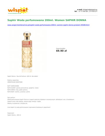 e-mail: [email protected] tel. : 17 77 00 557, 177707177 Saphir Woda perfumowana 200ml. Women SAPHIR DONNA www.wispol.tiointeractive.pl/saphir-woda-perfumowana-200ml.-women-saphir-donna-produkt-35508.html Cena brutto: 69.90 zł Saphir Donna - Eau de Parfums -200 ml -dla kobiet Rodziny zapachów: ORIENTALNO-KWIATOWE NUTY ZAPACHOWE: NUTA GŁOWY: gorzka pomarańcza, grejpfrut, melon NUTA SERCA: róża, płatki jaśminu NUTA BAZY: wanilia, cynamon, piżmo Opis perfum: Woda perfumowana Saphir Donna to zapach polecany kobietom romantycznym, delikatnym, ale z charakterem. Zapach otula ciało kobiety, dostarczając energii i ciepła. Idealny na jesiennie i zimowe dni. Linia Saphir to wody perfumowane inspirowane światowymi zapachami! Pojemność: Saphir Donna - 200 ml O marce SAPHIR PARFUMS: Jesteśmy wiodącą hiszpańską firmą, liderem w segmencie rynku, który rozwija i produkuje perfumy i który ma ponad 50 letnie doświadczenie w sektorze perfumeryjnym. W Saphir prowadzimy całościowy proces produkcyjny, począwszy od rozwoju zapachów, mieszania i maceracji, do napełniania i dystrybucji Naszych perfum. Łącząc najnowocześniejsze technologie z doświadczeniem i umiejętnościami Naszych pracowników, poszukujemy pełnej satysfakcji Naszych klientów, w otoczeniu produkcyjnym bezpiecznym, niezawodnym i szanującym środowisko. Stosujemy najbardziej zaawansowane systemy do produkcji perfum, chcąc spełnić najwyższe oczekiwania Naszych klientów. *Ceny obowiązują wyłącznie przy składaniu zamówień przez sklep internetowy. Ceny w sklepach mogą nieznacznie różnić się od cen prezentowanych na stronach sklepu internetowego. Przedstawiona oferta w sklepie internetowym nie stanowi oferty w rozumieniu Kodeksu Cywilnego, i jest jedynie zaproszeniem do rozpoczęcia rokowań (zgodnie z art. 71 k.c.). Zastrzegamy sobie prawo do niezrealizowania zamówień z ważnych przyczyn ekonomicznych.