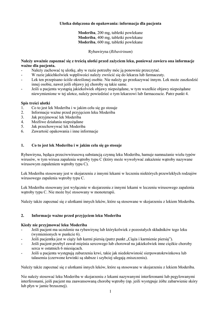 Ulotka dołączona do opakowania: informacja dla pacjenta Moderiba, 200 mg, tabletki powlekane Moderiba, 400 mg, tabletki powlekane Moderiba, 600 mg, tabletki powlekane Rybawiryna (Ribavirinum) Należy uważnie zapoznać się z treścią ulotki przed zażyciem leku, ponieważ zawiera ona informacje ważne dla pacjenta. Należy zachować tę ulotkę, aby w razie potrzeby móc ją ponownie przeczytać. W razie jakichkolwiek wątpliwości należy zwrócić się do lekarza lub farmaceuty. Lek ten przepisano ściśle określonej osobie. Nie należy go przekazywać innym. Lek może zaszkodzić innej osobie, nawet jeśli objawy jej choroby są takie same. Jeśli u pacjenta wystąpią jakiekolwiek objawy niepożądane, w tym wszelkie objawy niepożądane niewymienione w tej ulotce, należy powiedzieć o tym lekarzowi lub farmaceucie. Patrz punkt 4. Spis treści ulotki 1. Co to jest lek Moderiba i w jakim celu się go stosuje 2. Informacje ważne przed przyjęciem leku Moderiba 3. Jak przyjmować lek Moderiba 4. Możliwe działania niepożądane 5. Jak przechowywać lek Moderiba 6. Zawartość opakowania i inne informacje 1. Co to jest lek Moderiba i w jakim celu się go stosuje Rybawiryna, będąca przeciwwirusową substancją czynną leku Moderiba, hamuje namnażanie wielu typów wirusów, w tym wirusa zapalenia wątroby typu C (który może wywoływać zakażenie wątroby nazywane wirusowym zapaleniem wątroby typu C). Lek Moderiba stosowany jest w skojarzeniu z innymi lekami w leczeniu niektórych przewlekłych rodzajów wirusowego zapalenia wątroby typu C. Lek Moderiba stosowany jest wyłącznie w skojarzeniu z innymi lekami w leczeniu wirusowego zapalenia wątroby typu C. Nie może być stosowany w monoterapii. Należy także zapoznać się z ulotkami innych leków, które są stosowane w skojarzeniu z lekiem Moderiba. 2. Informacje ważne przed przyjęciem leku Moderiba Kiedy nie przyjmować leku Moderiba Jeśli pacjent ma uczulenie na rybawirynę lub którykolwiek z pozostałych składników tego leku (wymienionych w punkcie 6). Jeśli pacjentka jest w ciąży lub karmi piersią (patrz punkt „Ciąża i karmienie piersią”). Jeśli pacjent przebył zawał mięśnia sercowego lub chorował na jakiekolwiek inne ciężkie choroby serca w ostatnich 6 miesiącach. Jeśli u pacjenta występują zaburzenia krwi, takie jak niedokrwistość sierpowatokrwinkowa lub talasemia (czerwone krwinki są słabsze i szybciej ulegają zniszczeniu). Należy także zapoznać się z ulotkami innych leków, które są stosowane w skojarzeniu z lekiem Moderiba. Nie należy stosować leku Moderiba w skojarzeniu z lekami nazywanymi interferonami lub pegylowanymi interferonami, jeśli pacjent ma zaawansowaną chorobę wątroby (np. jeśli występuje żółte zabarwienie skóry lub płyn w jamie brzusznej). 1 Ostrzeżenia i środki ostrożności Przed zastosowaniem leku Moderiba należy poinformować lekarza prowadzącego, jeśli: pacjentka jest w wieku rozrodczym (patrz punkt „Ciąża i karmienie piersią”); partnerka pacjenta jest kobietą w wieku rozrodczym (patrz punkt „Ciąża i karmienie piersią”); u pacjenta występują zaburzenia serca; konieczne jest ścisłe monitorowanie stanu klinicznego przez lekarza; zaleca się przeprowadzenie kontrolnych badań EKG (elektrokardiogram) przed rozpoczęciem leczenia i w trakcie jego trwania; u pacjenta ujawniły się nowe zaburzenia serca wraz z występującym równocześnie znacznym zmęczeniem; mogą one być wynikiem niedokrwistości wywołanej lekiem Moderiba; pacjent miał kiedykolwiek niedokrwistość (ryzyko rozwoju niedokrwistości jest ogólnie większe u kobiet niż u mężczyzn); u pacjenta występują choroby nerek; może być konieczne zmniejszenie dawki leku Moderiba; pacjent miał przeszczepiony narząd (taki jak wątroba lub nerki) lub zabieg taki jest planowany w niedalekiej przyszłości; u pacjenta wystąpiły objawy reakcji alergicznej, takie jak trudności w oddychaniu, świszczący oddech, nagły obrzęk skóry i błon śluzowych, świąd lub wysypki; należy natychmiast przerwać przyjmowanie leku Moderiba i natychmiast skorzystać z pomocy lekarskiej; pacjent miał depresję w przeszłości lub objawy związane z depresją pojawiły się podczas stosowania leku Moderiba (np. uczucie smutku, przygnębienia itp.), patrz punkt 4; pacjent nadużywa lub nadużywał w przeszłości różnych substancji psychoaktywnych (np. alkohol lub narkotyki); pacjent nie ukończył 18. roku życia; skuteczność i bezpieczeństwo stosowania leku Moderiba w połączeniu z peginterferonem alfa-2a lub interferonem alfa-2a nie były oceniane w wystarczającym stopniu u pacjentów w wieku poniżej 18 lat; u pacjenta występuje jednoczesne zakażenie HIV i jest on leczony którymkolwiek z leków przeciwko HIV; pacjent musiał przerwać poprzednie leczenie wirusowego zapalenia wątroby typu C z powodu niedokrwistości lub zmniejszonej liczby krwinek. Przed rozpoczęciem stosowania leku Moderiba u każdego pacjenta należy przeprowadzić badania czynności nerek. Lekarz prowadzący powinien również zlecić badania krwi przed wdrożeniem leczenia lekiem Moderiba. Badania krwi należy powtórzyć po 2 i 4 tygodniach leczenia oraz w późniejszym okresie tak często, jak uzna to za konieczne lekarz prowadzący. U kobiet w wieku rozrodczym należy wykonać test ciążowy przed rozpoczęciem stosowania leku Moderiba oraz co miesiąc w czasie leczenia i w okresie 4 miesięcy po jego zakończeniu (patrz punkt „Ciąża i karmienie piersią”). Poniżej wymieniono poważne działania niepożądane związane ze stosowaniem leku Moderiba przede wszystkim w skojarzeniu z interferonem alfa-2a lub peginterferonem alfa-2a. Należy zapoznać się z ulotkami tych leków, gdzie znaleźć można bardziej szczegółowe informacje o bezpieczeństwie ich stosowania. - - - Zaburzenia psychiczne i ośrodkowego układu nerwowego (takie jak depresja, myśli samobójcze, próba samo