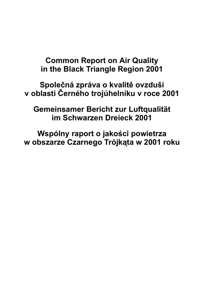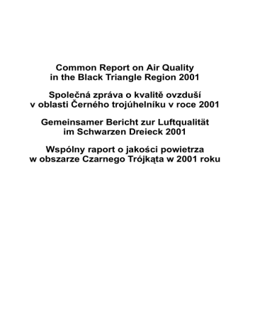 Common Report on Air Quality in the Black Triangle Region 2001 Spoleèná zpráva o kvalitì ovzduší v oblasti Èerného trojúhelníku v roce 2001 Gemeinsamer Bericht zur Luftqualität im Schwarzen Dreieck 2001 Wspólny raport o jakoœci powietrza w obszarze Czarnego Trójk¹ta w 2001 roku Impress participating agencies: »esk˝ hydrometeorologick˝ ˙stav (»HM⁄), WojewÛdzki Inspektorat Ochrony årodowiska we Wroc≥awiu (WIOå), S‰chsisches Landesamt f¸r Umwelt und Geologie (LfUG), Umweltbundesamt (UBA) Autors: Jan Abraham, Frank Berger, RÛøa Ciechanowicz-Kusztal, Graøyna Jod≥owska-Opyd, Dagmar Kallweit, Josef Keder, Waldemar Kulaszka, Ji¯Ì Nov·k Source of cover: Photo: Wies≥awa Morawiak, Artur Krajewski Janusz Moniatowicz Technical revision: Jan Abraham, Evûen »ern˝ Sources of data: »HM⁄, WIOå, LfUG, UBA, Instytut Meteorologii i Gospodarki Wodnej we Wroc≥awiu (IMGW), Urzπd Marsza≥kowski we Wroc≥awiu (UM) This report is also available in pdf-format via CD-ROM and via Internet: URLs: Czech: www.env.cz German: www.umweltbundesamt.de www.umwelt.sachsen.de/lfug Polish: www.jgora.pios.gov.pl/wwm.htm Sources of financing: WIOå NFOåiGW (Narodowy Fundusz Ochrony årodowiska i Gospodarki Wodnej) »HM⁄ UBA © 2002 »HM⁄, WIOå, LfUG, UBA ISBN 80-86-690-02-4 Edition I. Issue 300 copies. Format A4. Printed on recycled paper Printed at: EnviTypo Prague INTRODUCTION . . . . . . . . . . . . . . . . . . 6 ⁄VOD . . . . . . . . . . . . . . . . . . . . . . . . . 6 1. GEOGRAPHY, ECONOMY AND CLIMATE CONDITIONS IN THE BLACK TRIANGLE REGION . . . . . . . . . . . . . . . . . . . . . 12 1. GEOGRAFICK…, EKONOMICK… A KLIMATICK… PODMÕNKY V OBLASTI »ERN…HO TROJ⁄HELNÕKU . . . . . . . . 12 1.1 DESCRIPTION OF THE BLACK TRIANGLE AIR MONITORING SYSTEM . . . . . . . . . . . . . . . . . . 12 1.1 POPIS SYST…MU MONITOROV¡NÕ OVZDUäÕ V »ERN…M TROJ⁄HELNÕKU . . . . . . . . . . . . . . 12 1.2 CLIMATE AND GEOGRAPHICAL CONDITIONS . . . . . . . . . . . . . . . . 16 1.2 KLIMATICK… A GEOGRAFICK… PODMÕNKY . . . . . . . . . . . . . . . . . 16 2. AIR QUALITY STANDARDS . . . . . . . . . 24 2. NORMY KVALITY OVZDUäÕ . . . . . . . . 24 2.1 CZECH REPUBLIC . . . . . . . . . . . . . 24 2.1 »ESK¡ REPUBLIKA . . . . . . . . . . . . 24 2.2 GERMANY . . . . . . . . . . . . . . . . . 28 2.2 NÃMECKO . . . . . . . . . . . . . . . . . 28 2.3 POLAND . . . . . . . . . . . . . . . . . . 30 2.3 POLSKO . . . . . . . . . . . . . . . . . . . 30 2.4 EUROPEAN COMMUNITIES . . . . . . . 36 2.4 EVROPSK¡ SPOLE»ENSTVÕ . . . . . . . 36 3. CHARACTERISTICS OF THE AMBIENT AIR QUALITY . . . . . . . . . . . . . . . . . 40 3. CHARAKTERISTIKA KVALITY OVZDUäÕ . . . . . . . . . . . . . . . . . . . . 40 3.1 EMISSION TENDENCIES . . . . . . . . . 40 3.1 V›VOJ EMISÕ . . . . . . . . . . . . . . . 40 3.2 CHANGES IN AIR POLLUTION 1996ñ2001 . . . . . . . . . . . . . . . . . . 44 3.2 ZMÃNY ZNE»IäTÃNÕ OVZDUäÕ V OBDOBÕ LET 1996ñ2001 . . . . . . . . 44 3.3 AIR POLLUTION IN THE BLACK TRIANGLE REGION IN 2001 WITH REFERENCE TO EUROPEAN COMMUNITIES . . . . . . . . . . . . . 3.3.1 Annual mean concentrations . . . . 3.3.2 Values of 98 percentiles . . . . . . 3.3.3 Ozone limit value for the protection of vegetation (92/72 EWG) . . . . . 3.3.4 Heavy metals in PM10 . . . . . . . . 3.3.5 Wet deposition . . . . . . . . . . . 3.3.6 Polycyclic Aromatic Hydrocarbons (PAH) and benzene . . . . . . . . . 3.3.6.1 Polycyclic Aromatic Hydrocarbons (PAH) . . . . 3.3.6.2 Benzene . . . . . . . . . . 3.3 ZNE»IäTÃNÕ OVZDUäÕ V OBLASTI »ERN…HO TROJ⁄HELNÕKU V ROCE 2001 S OHLEDEM NA NORMY EVROPSK›CH SPOLE»ENSTVÕ . . . . . 3.3.1 RoËnÌ pr˘mÏrnÈ koncentrace . . . . . 3.3.2 Hodnoty 98. percentil˘ . . . . . . . . 3.3.3 MeznÌ hodnota ozonu pro ochranu vegetace (92/72 EWG) . . . . . . . . 3.3.4 TÏûkÈ kovy v PM10 . . . . . . . . . . 3.3.5 Mokr· depozice . . . . . . . . . . . . 3.3.6 PolycyklickÈ aromatickÈ uhlovodÌky (PAH) a benzen . . . . . . . . . . . . 3.3.6.1 PolycyklickÈ aromatickÈ uhlovodÌky (PAH) . . . . . . 3.3.6.2 Benzen . . . . . . . . . . . . . 50 . 52 . 54 . 56 . 58 . 58 . 62 . 62 . 70 50 52 54 56 58 58 62 62 70 3.4 AIR POLLUTION EPISODES IN THE BLACK TRIANGLE REGION IN 2001. . . . . . . . . . . . . . . . . . . . 92 3.4.1 Summer smog episode . . . . . . . . 92 3.4.2 Maximum concentration of SO2 in wintertime . . . . . . . . . . . . . 98 3.4 EPIZODY ZNE»IäTÃNÕ OVZDUäÕ V OBLASTI »ERN…HO TROJ⁄HELNÕKU V ROCE 2001 . . . . . 92 3.4.1 LetnÌ smogov· epizoda . . . . . . . . 92 3.4.2 Maxim·lnÌ koncentrace SO2 v zimnÌm obdobÌ . . . . . . . . . . . 98 4. INTERLABORATORY EXERCISES . . . . . . . . . . . . . . . . . . 106 4. MEZILABORATORNÕ ZKOUäKY . . . . . . . . . . . . . . . . . . . 106 5. SUMMARY AND CONCLUSIONS . . . . . 112 5. SHRNUTÕ A Z¡VÃRY . . . . . . . . . . . . 112 6. RECOMMENDATIONS FOR FURTHER WORK . . . . . . . . . . . 116 6. DOPORU»ENÕ PRO DALäÕ PR¡CI . . . . 116 LIST OF FIGURES . . . . . . . . . . . . . . . . 120 SEZNAM OBR¡ZKŸ . . . . . . . . . . . . . . 120 LIST OF TABLES. . . . . . . . . . . . . . . . . 124 SEZNAM TABULEK . . . . . . . . . . . . . . 124 EINF‹HRUNG . . . . . . . . . . . . . . . . . . . 7 WST P . . . . . . . . . . . . . . . . . . . . . . . . 7 1. GEOGRAPHIE, WIRTSCHAFT UND KLIMATISCHE BEDINGUNGEN IM SCHWARZEN DREIECK . . . . . . . . . 13 1. WARUNKI GEOGRAFICZNE, EKONOMICZNE I KLIMATYCZNE W REGIONIE CZARNEGO TR”JK•TA . . 13 1.1 BESCHREIBUNG DES LUFT‹BERWACHUNGSSYSTEMS DES SCHWARZEN DREIECKS . . . . . . . . . 13 1.1 OPIS SYSTEMU MONITORINGU POWIETRZA CZARNY TR”JK•T . . . . . . . . . . . . . . . . . . 13 1.2 KLIMA UND GEOGRAPHIE . . . . . . . 17 1.2 WARUNKI KLIMATYCZNE I GEOGRAFICZNE . . . . . . . . . . . . . 17 2. LUFTQUALITƒTSSTANDARDS . . . . . . . 25 2. NORMY JAKOåCI POWIETRZA . . . . . . 25 2.1 TSCHECHISCHE REPUBLIK . . . . . . . 25 2.1 REPUBLIKA CZESKA . . . . . . . . . . . 25 2.2 DEUTSCHLAND . . . . . . . . . . . . . . 2