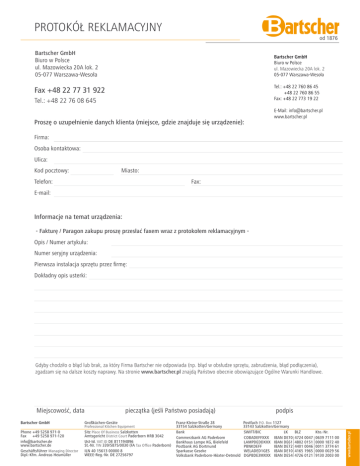 PROTOKÓŁ REKLAMACYJNY od 1876 Bartscher GmbH Biuro w Polsce ul. Mazowiecka 20A lok. 2 05-077 Warszawa-Wesoła Bartscher GmbH Biuro w Polsce ul. Mazowiecka 20A lok. 2 05-077 Warszawa-Wesoła Tel.: +48 22 760 86 45 +48 22 760 86 55 Fax: +48 22 773 19 22 Fax +48 22 77 31 922 Tel.: +48 22 76 08 645 Proszę o uzupełnienie danych klienta (miejsce, gdzie znajduje się urządzenie): E-Mail: [email protected] www.bartscher.pl Firma: Osoba kontaktowa: Ulica: Kod pocztowy:Miasto: Telefon: Fax: E-mail: Informacje na temat urządzenia: - Fakturę / Paragon zakupu proszę przesłać faxem wraz z protokołem reklamacyjnym Opis / Numer artykułu: Numer seryjny urządzenia: Pierwsza instalacja sprzętu przez firmę: Dokładny opis usterki: Gdyby chodziło o błąd lub brak, za który Firma Bartscher nie odpowiada (np. błąd w obsłudze sprzętu, zabrudzenia, błąd podłączenia), zgadzam się na dalsze koszty naprawy. Na stronie www.bartscher.pl znajdą Państwo obecnie obowiązujące Ogólne Warunki Handlowe. Bartscher GmbH Phone+49 5258 971-0 Fax +49 5258 971-120 [email protected] www.bartscher.de Geschäftsführer Managing Director Dipl.-Kfm. Andreas Heumüller pieczątka (jeśli Państwo posiadają) Großküchen-Geräte Professional Kitchen Equipment Sitz Place Of Business Salzkotten Amtsgericht District Court Paderborn HRB 3042 Ust-Id. VAT ID DE 811194896 St.-Nr. TIN 339/5875/0030 (FA Tax Office Paderborn) ILN 40 15613 00000 8 WEEE-Reg.-Nr. DE 27256797 Franz-Kleine-Straße 28 33154 Salzkotten/Germany Bank Commerzbank AG Paderborn Bankhaus Lampe KG, Bielefeld Postbank AG Dortmund Sparkasse Geseke Volksbank Paderborn-Höxter-Detmold podpis Postfach P.O. Box 1127 33143 Salzkotten/Germany SWIFT/BIC LKBLZ COBADEFFXXX IBANDE70 4724 0047 LAMPDEDDXXX IBANDE61 4802 0151 PBNKDEFF IBANDE72 4401 0046 WELADED1GES IBANDE10 4165 1965 DGPBDE3MXXX IBANDE54 4726 0121 Kto.-Nr. 0639 7111 00 0000 1872 40 0011 3774 61 0000 0029 56 9130 2003 00 www.bartscher.pl Miejscowość, data