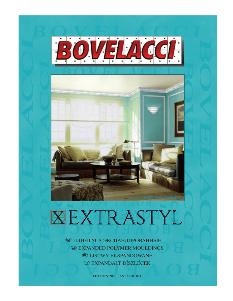 Dott. Ing. Bovelacci Marco 2008 УА ЭАОА EXPANDED POLYMER MOULDINGS LISTWY EKSPANDOWANE EXPANDÁLT DÍSZLÉCEK EDITION 2008 EAST EUROPA AMERICANSTYL: A10W, A70W CLASSICSTYL: D3713HQ EXTRASTYL: X125 PROFILSTYL: B75 NOCE LE CORNICI IN POLIMERI ESPANSI EXPANDED POLYMER MOULDINGS ZIERLEISTEN AUS EXPANDIERTEM POLYMER CORNICHES EN POLYMÈRES EXPANSÉES MOLDURAS DE POLÌMERO EXPANDIDO MOLDURAS DO POLÌMERO EXPANDIDO SIERPROFIELEN UIT GEËXPANDEERD POLYMERR ΚΟΡΝΙΖΕΣ ΔΙΟΓΚΩΜΕΝΗΣ ΠΟΛΥΜΕΡΩΝ DESENLI POLIMER KARTONPIYER EXPANDERADE POLYMER LISTER STUKKATURLISTER I POLYMER STUKLISTER AF EKSPANDERET POLYMER POLIMEERLISTAT EKSPANDIRANI OKRASNE PROFILE IZ POLYMER EKSPANDIRANI POLYMER PROFILI УА ЭАОА LISTWY EKSPANDOWANE ˘ LISTY POLYSTYREN EXPADOVAN¥ CORNISE DIN POLISTIREN EXPANS EXPANDÁLT DÍSZLÉCEK PLIУ EAOА EAHА PO УА ЭАОА EXPANDED POLYMER MOULDINGS Dott. Ing. Bovelacci Marco 2008 3 CEILINGS MOULDINGS LISTWY SUFITOWE MENNYEZETI DÍSZLÉCEK аздвижные полимерные молдинги, внешняя поверхность которых обработана под цвет белого гипса Expanded polymer mouldings with external surface treated plaster-like white colour Wytłaczane formy polimerowe Expandált polimer díszléc, z zewnętrzną powierzchnią kültéri fehér vakolatszerű impregnowaną tynkopodob- bevonattal олистирол самозатухающый !ласс "1 #лина: 2 пм Self extinguishing polystyrene Class B1 Length: 2 lm (78 3/4”) УА ООО nym białym kolorem 4 X42 X44 30 mm 30 mm 1 1/8” x 1 1/8” 30 mm 1 1/8” x 1 1/8” 30 mm 30 mm 30 mm 1 1/8” x 1 1/8” 1 1/8” x 1 1/8” X40 3/ ” x 3/ ” 4 4 30 mm 30 mm X35 30 mm 1 1/8” x 1 1/8” X43 20 mm 30 mm 30 mm X41 Hosszúság: 2 m 30 mm 3/ ” x 3/ ” 4 4 X39 (nehezen éghető) Długość: 2 mb 20 mm X30 Díszlécek önoltó polisztirol-ból samogasnącego Klasa 1 20 mm 20 mm Listwy ze styropianu 1 1/8” x 1 1/8” 30 mm 30 mm 30 mm 30 mm 1 5/8” x 2 3/8” X71 35 mm 1 3/8” x 2” 40 mm 60 mm 40 mm X70 1 1/8” x 1 5/8” 40 mm 1 5/8” x 1 5/8” X60 30 mm 1 1/8” x 1 1/8” 40 mm X55 1 1/8” x 1 5/8” 1 1/8” x 1 1/8” 1 1/8” x 1 1/8” X50 65 mm X49 X48 50 mm X47 40 mm 30 mm X46 30 mm 1 1/8” x 1 1/8” 40 mm X45 30 mm 30 mm 30 mm 1 5/8” x 2 1/2” 5 #лина: 2 пм Length: 2 lm (78 3/4”) Długość: 2 mb Hosszúság: 2 m 55 mm 2 1/8” x 2 1/8” 55 mm 55 mm 55 mm 2 1/8” x 2 1/8” 2 1/8” x 2 1/8” 55 mm 40 mm 55 mm 2 1/8” x 2 1/8” 2 1/8” x 2 1/8” X82 X80 X90 50 mm 2 1/8” x 2 1/8” 2” x 3” 6 X78 1 5/8” x 2 3/4” 55 mm 55 mm X76 75 mm 55 mm 70 mm X79 55 mm 55 mm X77 2 1/8” x 2 1/8” X74 55 mm X75 2 1/8” x 2 1/8” 55 mm X73 55 mm 55 mm 55 mm X105 2 3/4” x 3 1/8” X108 1 3/4” x 3 1/8” 45 mm 80 mm 70 mm X94 95 mm 2 3/8” x 2 1/2” 80 mm X92 45 mm 65 mm 60 mm 1 3/4” x 3 3/4” X125 85 mm 85 mm 3 3/8” x 3 3/8” EUROCOLL IL DISPLAY EXTRASTYL LA SEGA SPECIALE E LA CASSETTA PER TAGLIO mlt 310 - Kg 7 - Kg 1,8 7 УА Ь UNIVERSAL УО Я ОО О CORNER BLOCKS ཚ UNIWERSALNE NAROŻA 먙 UNIVERZÁLIS SAROKELEMEK риспособления для молдингов Extrastyl: dla form Extrastyl: Extrastyl formákhoz: for Extrastyl mouldings: mm 30x30: X30, X35, X39, X40, X41, X42, X43, X44, X45, X47, X48 ENLP30I dim=mm 30x30 L=cm 4x4 ENLP30C dim=mm 30x30 ENDP30I dim=mm 30x30 L=cm 4x4 риспособления для молдингов Extrastyl: L=cm 3,5 ENDP30C dim=mm 30x30 for Extrastyl mouldings: L=cm 3,5 dla form Extrastyl: ENLP30E dim=mm 30x30 L=cm 4x4 ENDP30E dim=mm 30x30 L=cm 4x4 Extrastyl formákhoz: mm 50x50: X46, X50, X55, X60 ENLM50I dim=mm 50x50 L=cm 7x7 ENLM50C dim=mm 50x50 ENDM50I dim=mm 50x50 L=cm 7x7 риспособления для молдингов Extrastyl: L=cm 5,5 ENDM50C dim=mm 50x50 for Extrastyl mouldings: L=cm 5,5 dla form Extrastyl: ENLM50E dim=mm 50x50 L=cm 7x7 ENDM50E dim=mm 50x50 L=cm 7x7 Extrastyl formákhoz: mm 80x80: X70, X71, X73, X74, X75, X76, X77, X78, X79, X80, X82, X90, X92, X94, X105 ENLG80I dim=mm 80x80 L=cm 10,5x10,5 ENLG80C dim=mm 80x80 ENDG80I dim=mm 80x80 L=cm 10,5x10,5 риспособления для молдингов Extrastyl: L=cm 8,5 ENDG80C dim=mm 80x80 for Extrastyl mouldings: L=cm 8,5 dla form Extrastyl: ENLG80E dim=mm 80x80 L=cm 10,5x10,5 ENDG80E dim=mm 80x80 L=cm 10,5x10,5 Extrastyl formákhoz: mm 110x110: X108, X125 ENLXG110I dim=mm 110x110 L=cm 13,5x13,5 ENDXG110I dim=mm 110x110 L=cm 13,5x13,5 8 ENLXG110C dim=mm 110x110 L=cm 11,5 ENDXG110C dim=mm 110x110 L=cm 11,5 ENLXG110E dim=mm 110x110 L=cm 13,5x13,5 ENDXG110E dim=mm 110x110 L=cm 13,5x13,5 ОЯ еобработанные покрытия больших размеров из глянцевых полимеров, ласс 1, идеалены для покрытия штукатурной плитки, сухой штукатурки RAW COVES ཚ 먙 SERIE LISTWPÓŁOKRĄGŁYCH FÉLKÖRALAKÚ SZEGŐLÉCEK Raw coves, wide-sized, are made of glossy expanded polymers, Class 1, perfect for plasterboard combination Llistwy w stanie surowym, o Fényes polimerből expandált, dużych rozmiarach, wykonane nagy méretű nyers, I. osztályú z błyszczących polimerów léc kiválóan alkalmas ekspandowych, Klasa 1, gipszkarton felületek znakomicie nadają się do összedolgozásá-hoz połączenia z okładziną tynkową 200 mm G20 300 mm G15 200 mm 150 mm 150 mm G30 5 7/8” x 5 7/8” 7 7/8” x 7 7/8” G25 300 mm 250 mm 250 mm 9 7/8” x 9 7/8” 11 3/4” x 11 3/4” лина: 2 пм Length: 2 lm (78 3/4”) Długość: 2 mb Hosszúság: 2 m еобработанные покрытия могут быть заштукатурены или окрашены водоэмульсионной краской, эффективная длина должна составлять около 195 см. Raw coves must be finished, filled and painted with water-based paints, so the useful l