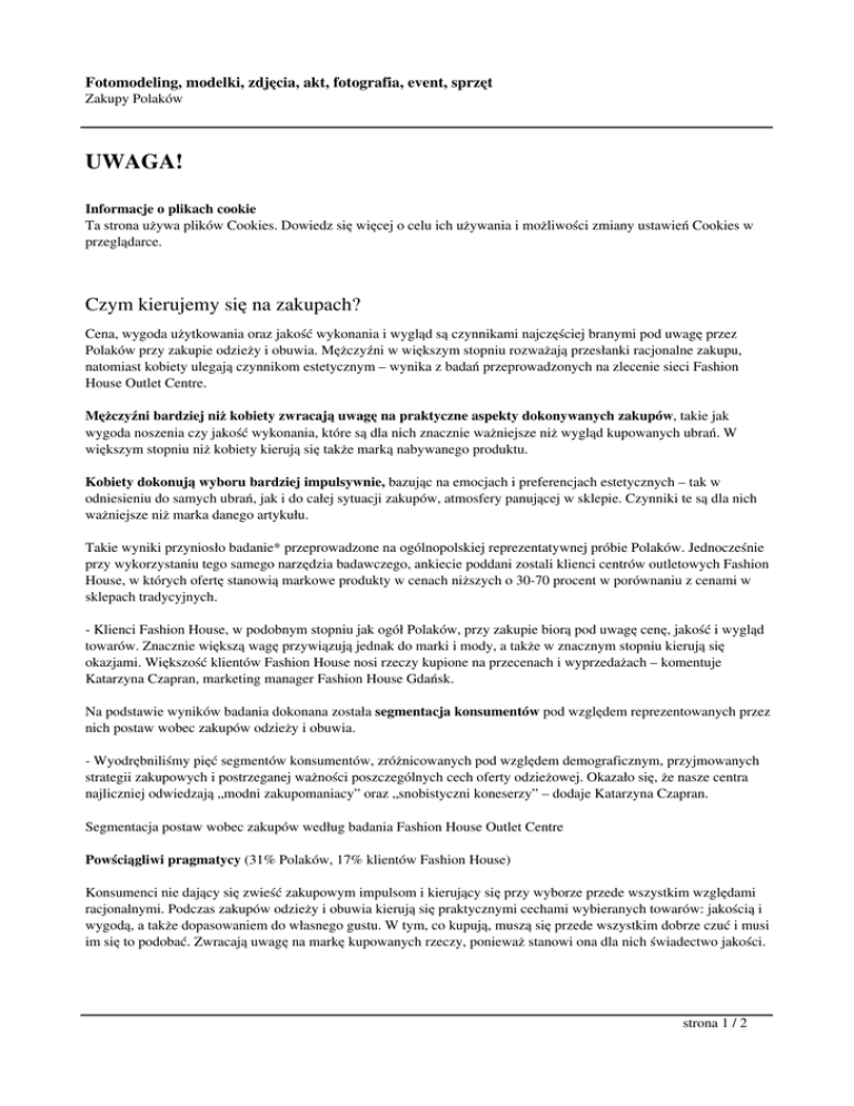Fotomodeling, modelki, zdjęcia, akt, fotografia, event, sprzęt Zakupy Polaków UWAGA! Informacje o plikach cookie Ta strona używa plików Cookies. Dowiedz się więcej o celu ich używania i możliwości zmiany ustawień Cookies w przeglądarce. Czym kierujemy się na zakupach? Cena, wygoda użytkowania oraz jakość wykonania i wygląd są czynnikami najczęściej branymi pod uwagę przez Polaków przy zakupie odzieży i obuwia. Mężczyźni w większym stopniu rozważają przesłanki racjonalne zakupu, natomiast kobiety ulegają czynnikom estetycznym – wynika z badań przeprowadzonych na zlecenie sieci Fashion House Outlet Centre. Mężczyźni bardziej niż kobiety zwracają uwagę na praktyczne aspekty dokonywanych zakupów, takie jak wygoda noszenia czy jakość wykonania, które są dla nich znacznie ważniejsze niż wygląd kupowanych ubrań. W większym stopniu niż kobiety kierują się także marką nabywanego produktu. Kobiety dokonują wyboru bardziej impulsywnie, bazując na emocjach i preferencjach estetycznych – tak w odniesieniu do samych ubrań, jak i do całej sytuacji zakupów, atmosfery panującej w sklepie. Czynniki te są dla nich ważniejsze niż marka danego artykułu. Takie wyniki przyniosło badanie* przeprowadzone na ogólnopolskiej reprezentatywnej próbie Polaków. Jednocześnie przy wykorzystaniu tego samego narzędzia badawczego, ankiecie poddani zostali klienci centrów outletowych Fashion House, w których ofertę stanowią markowe produkty w cenach niższych o 30-70 procent w porównaniu z cenami w sklepach tradycyjnych. - Klienci Fashion House, w podobnym stopniu jak ogół Polaków, przy zakupie biorą pod uwagę cenę, jakość i wygląd towarów. Znacznie większą wagę przywiązują jednak do marki i mody, a także w znacznym stopniu kierują się okazjami. Większość klientów Fashion House nosi rzeczy kupione na przecenach i wyprzedażach – komentuje Katarzyna Czapran, marketing manager Fashion House Gdańsk. Na podstawie wyników badania dokonana została segmentacja konsumentów pod względem reprezentowanych przez nich postaw wobec zakupów odzieży i obuwia. - Wyodrębniliśmy pięć segmentów konsumentów, zróżnicowanych pod względem demograficznym, przyjmowanych strategii zakupowych i postrzeganej ważności poszczególnych cech oferty odzieżowej. Okazało się, że nasze centra najliczniej odwiedzają „modni zakupomaniacy” oraz „snobistyczni koneserzy” – dodaje Katarzyna Czapran. Segmentacja postaw wobec zakupów według badania Fashion House Outlet Centre Powściągliwi pragmatycy (31% Polaków, 17% klientów Fashion House) Konsumenci nie dający się zwieść zakupowym impulsom i kierujący się przy wyborze przede wszystkim względami racjonalnymi. Podczas zakupów odzieży i obuwia kierują się praktycznymi cechami wybieranych towarów: jakością i wygodą, a także dopasowaniem do własnego gustu. W tym, co kupują, muszą się przede wszystkim dobrze czuć i musi im się to podobać. Zwracają uwagę na markę kupowanych rzeczy, ponieważ stanowi ona dla nich świadectwo jakości. strona 1 / 2 Fotomodeling, modelki, zdjęcia, akt, fotografia, event, sprzęt Zakupy Polaków Modni zakupomaniacy (29% Polaków, 32% klientów Fashion House) Lubią zakupy, sprawia im przyjemność kupowanie nowej odzieży i obuwia, więc robią to często i impulsywnie, emocjonalnie. Kierują się przy zakupie modą i oryginalnością wybieranych rzeczy, zwracają też uwagę na markę jednocześnie nie będąc przesadnie wrażliwi na cenę – za rzeczy markowe i dobrej jakości są gotowi zapłacić więcej. Lubią przeceny i wyprzedaże, dzięki którym mogą kupić więcej nowych rzeczy. Alternatywni łowcy okazji (18% Polaków, 16% klientów Fashion House) Nastawieni są na poszukiwanie tańszych alternatyw dla ogólnodostępnych towarów. Zdecydowanie wolą kupić więcej rzeczy tańszych, niż jedną drogą. Entuzjaści wszelkich form przecen i wyprzedaży. Wierzą, że nie zawsze dobre towary muszą być drogie by gwarantowały wysoką jakość. Szukają więc skarbów pośród rzeczy przecenionych, a także używanych. Snobistyczni koneserzy (11% Polaków, 29% klientów Fashion House) Kierują się przede wszystkim wyglądem rzeczy, które kupują. Polegają na własnym wyrobionym smaku. Cenią estetykę, wygodę i wysoką jakość. Zwracają dużą uwagę na modę i cenią sobie markę. Odzież i obuwie kupują często, cena ma dla nich mniejsze znaczenie. Kiedy wybierają rzeczy markowe i wysokiej jakości, przestają liczyć się z pieniędzmi. Coś co się podoba kupują od razu, nie czekając na przeceny. Oszczędni asceci (10% Polaków, 1% klientów Fashion House) Konsumenci o najmniejszym potencjale nabywczym, ograniczający nie tylko swojej wydatki, ale w ogóle wszelkie zakupy do niezbędnego minimum. Kierują się przede wszystkim ceną. W dalszej kolejności biorą pod uwagę praktyczność, wygodę noszenia i użytkowania kupowanych rzeczy. Mniej wagi przywiązują do wyglądu, czy mody. --* Badanie zostało przeprowadzone na zlecenie Fashion House Outlet Centre przez ośrodek badań Pentor Research International w czerwcu 2007 na próbie reprezentatywnej ogólnopolskiej (1015 osób) oraz próbie klientów Fashion House Outlet Centres w Gdańsku, Sosnowcu i Piasecznie. strona 2 / 2