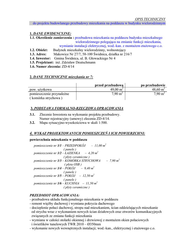 OPIS TECHNICZNY do projektu budowlanego przebudowy mieszkania na poddaszu w budynku wielorodzinnym 1. DANE EWIDENCYJNE: 1.1. Określenie zamierzenia : przebudowa mieszkania na poddaszu budynku mieszkalnego wielorodzinnego polegająca na zmianie funkcji mieszkania, wymianie instalacji elektrycznej, wod.-kan. z montażem etażowego c.o. 1.2. Obiekt: Budynek mieszkalny wielorodzinny, wolnostojący 1.3. Adres: Makowice Nr 27/7, 58-100 Świdnica, działka nr 216/7 1.4. Inwestor: Gmina Świdnica, ul. B. Głowackiego Nr 4 1.5. Projektant: inż. Zdzisław Deutschmann 1.6. Numer zlecenia: ZD-4/14 2. DANE TECHNICZNE mieszkania nr 7: pow. użytkowa pomieszczenie przynależne ( komórka strychowa ) przed przebudową 49,00 m2 7,90 m2 po przebudowie 48,60 m2 7,90 m2 3. PODSTAWA FORMALNO-RZECZOWA OPRACOWANIA 3.1. 3.2. Zlecenie Inwestora na wykonanie projektu przebudowy. Numer rejestracyjny (umowy) zlecenia ZD-4/14. Mapa sytuacyjno-wysokościowa w skali 1:500. 4. WYKAZ PROJEKTOWANYCH POMIESZCZEŃ I ICH POWIERZCHNI: powierzchnia mieszkania w poddaszu pomieszczenie nr 3/1 – PRZEDPOKÓJ – 11,00 m2 ( panele ) pomieszczenie nr 3/2 – ŁAZIENKA – 4,20 m2 ( płyty ceramiczne ) pomieszczenie nr 3/3 – KOMÓRKA STRYCHOWA – 7,90 m2 ( płyta OSB ) pomieszczenie nr 3/4 – POKÓJ – 9,40 m2 ( panele ) pomieszczenie nr 3/5 – POKÓJ – 12,50 m2 ( panele ) pomieszczenie nr 3/6 – KUCHNIA – 11,50 m2 ( płyty ceramiczne ) PRZEDMIOT OPRACOWANIA: - przebudowa układu funkcjonalnego mieszkania w poddaszu - remont więźby dachowej i wymiana pokrycia dachowego - docieplenie połaci dachowej, stropu nad mieszkaniem, ścian oddzielających mieszkanie od strychu wraz z wykonaniem nowych ścian działowych oraz otworów komunikacyjnych związanych ze zmiana funkcji mieszkania - wymiana w całości stolarki okiennej i drzwiowej z montażem okien połaciowych i świetlików tunelowych TWR 2010 – Ø350mm - wykonanie nowych wewnętrznych instalacji; wod.-kan., elektrycznej i etażowego c.o. - wykonanie po impregnacji istniejącego deskowania podłogowego nowych podłóg z płyt OSB i FARMACEL pod płytami ceramicznymi i panelami podłogowymi - rozebranie pieca kaflowego oraz wykonanie nowej wentylacji grawitacyjnej w kuchni i łazience ANALIZA MOŻLIWOŚCI RACJONALNEGO WYKORZYSTANIA Brak technicznych, środowiskowych i ekonomicznych możliwości zastosowania wysokoefektywnych systemów alternatywnego zaopatrzenia w energię i ciepło ze źródeł odnawialnych, kogenerację, ogrzewania lub chłodzenie lokalne lub blokowe. 5.PROJEKT ZAGOSPODAROWANIA DZIAŁKI 1. Przedmiotem zamierzenia budowlanego jest przebudowa mieszkania na poddaszu w budynku mieszkalnym wielorodzinnym, zlokalizowanym w Makowicach k/Świdnicy. Przebudowa mieszkania polega na: zmianie funkcji pomieszczeń wg opisu j.w. 2. Istniejący stan zagospodarowania działki zapewnia normalne funkcjonowanie i użytkowanie obiektu i terenu przyległego. Nie przewiduje się zmian w zagospodarowaniu terenu. 3. Działka nr 216/7 oraz budynek nie są wpisane do rejestru zabytków, jedynie figurują w spisie zabytków i podlegają ochronie konserwatorskiej na podstawie przepisów o ochronie zabytków. 4. Zagrożenie dla środowiska oraz higieny i zdrowia użytkowników. Nie przewiduje się zagrożeń dla środowiska oraz higieny i zdrowia użytkowników budynku mieszkalnego wielorodzinnego i jego otoczenia. 5.Odprowadzenie wód opadowych z połaci dachowych po wymianie części pokrycia połaci dachowych nad mieszkaniem. Odprowadzenie wód opadowych z połaci dachowych przebudowywanego obiektu przewiduje się do istniejących rur spustowych zlokalizowanych i zamocowanych do ścian podłużnych. 6. Wykonanie wjazdów na działkę. Funkcjonują istniejące wjazdy na teren działki obsługujące obiekt. 6. DANE KONSTRUKCYJNO-BUDOWLANE • Układ konstrukcyjny Budynek mieszkalny powstał w latach 20-tych XIXw., częściowo podpiwniczony, w technologii tradycyjnej o podłużnym układzie konstrukcyjnym ścian nośnych, założony na planie prostokąta, dwukondygnacyjny z poddaszem użytkowym i dachem dwuspadkowym z naczółkami. Elewacja prosta, z nieznacznymi detalami architektonicznymi. Cokół obłożony płytami z piaskowca z nieznacznymi śladami uszkodzeń mechanicznych. • Założenia przyjęte do obliczeń konstrukcyjnych Projekt konstrukcji wykonano w oparciu o następujące normy: - PN-82/B-02000;/B-02001;/B-02003 Obciążenia budowli - PN-77/B-02011 Obciążenie wiatrem - PN-80/B-02010 Obciążenie śniegiem - PN-81/B-03150 Konstrukcje drewniane - PN-90/B-03200 Konstrukcje stalowe - PN-84/B-03264 Konstrukcje betonowe, żelbetowe i sprężone - PN-87/B-03002 Konstrukcje murowe - PN-81/B-03020 Posadowienia bezpośrednie budowli Przyjęto założenia: - Lokalizacja w III strefie wiatrowej oraz I strefie śniegowej - Dopuszczalny nacisk na grunt qf = 150kPa ( 1,50 kg/cm2 ) - I kategoria geotechniczna • Podstawowe założenia obliczeń DACH Obciążenia wiatrem strefa III Obciążenie śniegiem strefa I 7. PROJEKT ARCHITEKTONICZNO-BUDOWLANY Opis stanu istniejącego obiektu: Budynek mieszkalny wielorodzinny wolnostojący, zlokalizowany jest w Makowicach k/Świdnicy, na działce nr 216/7. Dojście i dojazdy bezpośrednie z jezdni ulicy dojazdowej. W pobliżu budynku od strony frontowej znajduje się infrastruktura techniczna- sieci uzbrojenia podziemnego. 1. Przeznaczenie i program użytkowy – istniejący budynek mieszkalny wg stanu na dzień 3.03.2014 jest aktualnie zamieszkały i użytkowany zgodnie z jego przeznaczeniem. 2. Forma architektoniczna obiektu – typowa dla okresu budownictwa z przełomu XIX i XXw. ( o rzucie prostokąta z dwuspadkowym dachem z naczółkami, krytym dachówką ceramiczną ). 3. Układ konstrukcyjny obiektu: Budynek dwukondygnacyjny, częściowo podpiwniczony, z poddaszem użytkowym o podłużnym układzie konstrukcyjnym. Obiekt wyposażony jest w instalacje: elektryczną, wodną, kanalizacyjną. Ogrzewany piecami kaflowymi i kuch