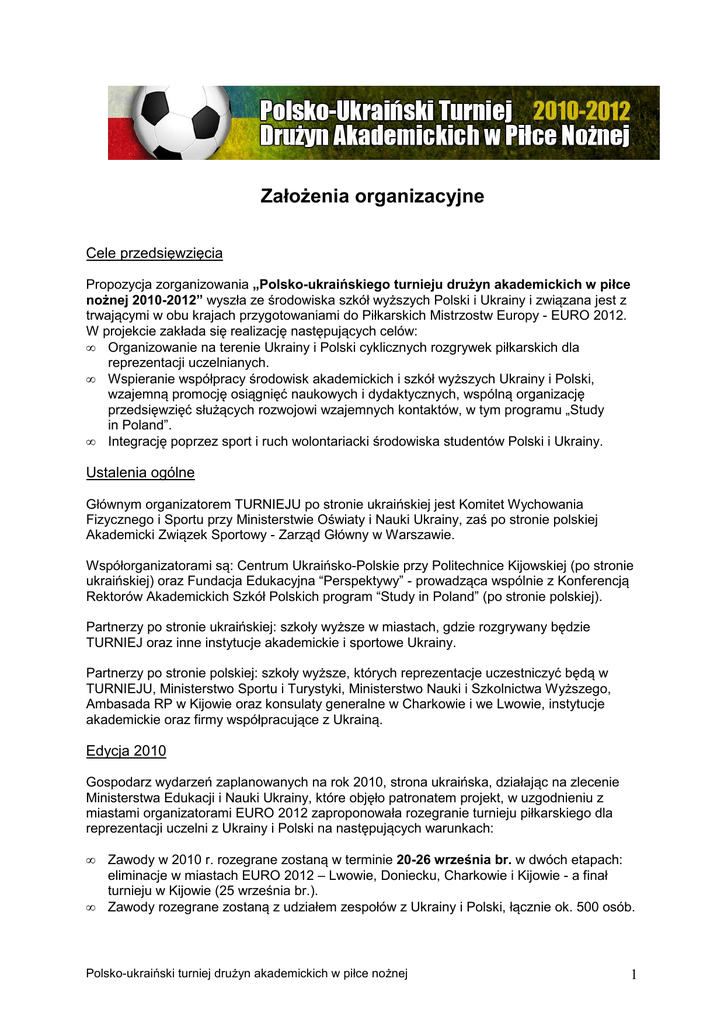 Założenia organizacyjne Cele przedsięwzięcia Propozycja zorganizowania „Polsko-ukraińskiego turnieju drużyn akademickich w piłce nożnej 2010-2012” wyszła ze środowiska szkół wyższych Polski i Ukrainy i związana jest z trwającymi w obu krajach przygotowaniami do Piłkarskich Mistrzostw Europy - EURO 2012. W projekcie zakłada się realizację następujących celów: • Organizowanie na terenie Ukrainy i Polski cyklicznych rozgrywek piłkarskich dla reprezentacji uczelnianych. • Wspieranie współpracy środowisk akademickich i szkół wyższych Ukrainy i Polski, wzajemną promocję osiągnięć naukowych i dydaktycznych, wspólną organizację przedsięwzięć służących rozwojowi wzajemnych kontaktów, w tym programu „Study in Poland”. • Integrację poprzez sport i ruch wolontariacki środowiska studentów Polski i Ukrainy. Ustalenia ogólne Głównym organizatorem TURNIEJU po stronie ukraińskiej jest Komitet Wychowania Fizycznego i Sportu przy Ministerstwie Oświaty i Nauki Ukrainy, zaś po stronie polskiej Akademicki Związek Sportowy - Zarząd Główny w Warszawie. Współorganizatorami są: Centrum Ukraińsko-Polskie przy Politechnice Kijowskiej (po stronie ukraińskiej) oraz Fundacja Edukacyjna “Perspektywy” - prowadząca wspólnie z Konferencją Rektorów Akademickich Szkół Polskich program “Study in Poland” (po stronie polskiej). Partnerzy po stronie ukraińskiej: szkoły wyższe w miastach, gdzie rozgrywany będzie TURNIEJ oraz inne instytucje akademickie i sportowe Ukrainy. Partnerzy po stronie polskiej: szkoły wyższe, których reprezentacje uczestniczyć będą w TURNIEJU, Ministerstwo Sportu i Turystyki, Ministerstwo Nauki i Szkolnictwa Wyższego, Ambasada RP w Kijowie oraz konsulaty generalne w Charkowie i we Lwowie, instytucje akademickie oraz firmy współpracujące z Ukrainą. Edycja 2010 Gospodarz wydarzeń zaplanowanych na rok 2010, strona ukraińska, działając na zlecenie Ministerstwa Edukacji i Nauki Ukrainy, które objęło patronatem projekt, w uzgodnieniu z miastami organizatorami EURO 2012 zaproponowała rozegranie turnieju piłkarskiego dla reprezentacji uczelni z Ukrainy i Polski na następujących warunkach: • • Zawody w 2010 r. rozegrane zostaną w terminie 20-26 września br. w dwóch etapach: eliminacje w miastach EURO 2012 – Lwowie, Doniecku, Charkowie i Kijowie - a finał turnieju w Kijowie (25 września br.). Zawody rozegrane zostaną z udziałem zespołów z Ukrainy i Polski, łącznie ok. 500 osób. Polsko-ukraiński turniej drużyn akademickich w piłce nożnej 1 • • Koszty pobytu (zakwaterowanie, wyżywienie, transport lokalny w ramach miast, program towarzyszący) ponosi strona ukraińska. Koszty dojazdu do miast ukraińskich ponosi strona polska. W 2010 roku w rywalizacji sportowej wezmą udział zarówno zawodnicy, trenerzy, sędziowie jak również towarzyszący każdemu tego typu wydarzeniu organizatorzy, wolontariusze, dziennikarze, a także reprezentanci środowiska akademickiego i goście. Uczestnictwo w ukraińsko-polskim spotkaniu potwierdziły: Polska Ukraina CHARKÓW Uniwersytet Marii Curie Skłodowskiej, Lublin Narodowy Uniwersytet Samochodowo-Drogowy Uniwersytet im. Adama Mickiewicza, Poznań Charkowski Uniwersytet Narodowy im. Karazina Charkowska Akademia Zooweterynaryjna DONIECK Uniwersytet Jagielloński, Kraków Doniecki Uniwersyet Narodowy Politechnika Świętokrzyska, Kielce Doniecki Narodowy Uniwersytet Techniczny Uniwersytet Zarządzania KIJÓW Politechnika Warszawska Narodowy Techniczny Uniwersytet “KPI” Uniwersytet Śląski, Katowice Narodowy Uniwersytet Pedagogiczny Narodowy Uniwersytet Handlowy LWÓW Uniwersytet Warszawski Narodowy Uniwerystet Rolniczy Politechnika Wrocławska Politechnika Lwowska Uniwersytet Wychowania Fizycznego Komitet Honorowy Do składu polskiego Komitetu Honorowego, działającego pod przewodnictwem Pana Ministra Ryszarda Stachurskiego, sekretarza stanu w Ministerstwie Sportu i Turystyki, zaproszono następujące osoby i instytucje związane ze środowiskiem szkół wyższych, sportem akademickim i polskimi organizatorami EURO 2012: 1. prof. Zbigniew Marciniak – podsekretarz stanu, Ministerstwo Nauki i Szkolnictwa Wyższego 2. Jacek Kluczkowski – ambasador nadzwyczajny i pełnomocny RP na Ukrainie 3. Jan Granat – konsul generalny RP w Charkowie 4. Grzegorz Opaliński – konsul generalny RP we Lwowie 5. prof. Katarzyna Chałasińska-Macukow - przewodnicząca KRASP, rektor Uniwersytetu Warszawskiego 6. prof. Karol Musioł – rektor Uniwersytetu Jagiellońskiego 7. prof. Wiesław Banyś – rektor Uniwersytetu Śląskiego 8. prof. Włodzimierz Kurnik – przewodniczący Konferencji Rektorów Uczelni Warszawskich, rektor Politechniki Warszawskiej 9. prof. Bronisław Marciniak – przewodniczący Konferencji Rektorów Uczelni Poznania, rektor Uniwersytetu im. Adama Mickiewicza Polsko-ukraiński turniej drużyn akademickich w piłce nożnej 2 10. prof. Tadeusz Więckowski – rektor Politechniki Wrocławskiej 11. prof. Stanisław Adamczak - rektor Politechniki Świętokrzyskiej 12. prof. Stanisław Michałowski – prorektor UMCS 13. Ryszard Grobelny – prezydent Poznania 14. Rafał Dutkiewicz – prezydent Wrocławia 15. Paweł Adamowicz – prezydent Gdańska 16. Włodzimierz Paszyński – wiceprezydent m. st. Warszawy 17. Antoni Piechniczek – senator RP, b. trener reprezentacji Polski w piłce nożnej 18. Józef Berger – senator RP 19. Andrzej Smirnow – poseł, przewodniczący Komisji Edukacji, Nauki i Młodzieży Sejmu RP 20. Andrzej Biernat - poseł, przewodniczący sejmowej Podkomisji ds. EURO 2012 21. Grzegorz Lato – prezes Zarządu Głównego PZPN 22. Adam Olkowicz - dyrektor Turnieju UEFA EURO 2012TM w Polsce 23. Marcin Herra - Spółka PL.2012 24. Przedstawiciele KO EURO 2012 z Wrocławia, Poznania, Gdańska i Warszawy a także 25. prof. Marek Rocki - prezes Zarządu Głównego AZS, senator RP, przewodniczący Państwowej Kom