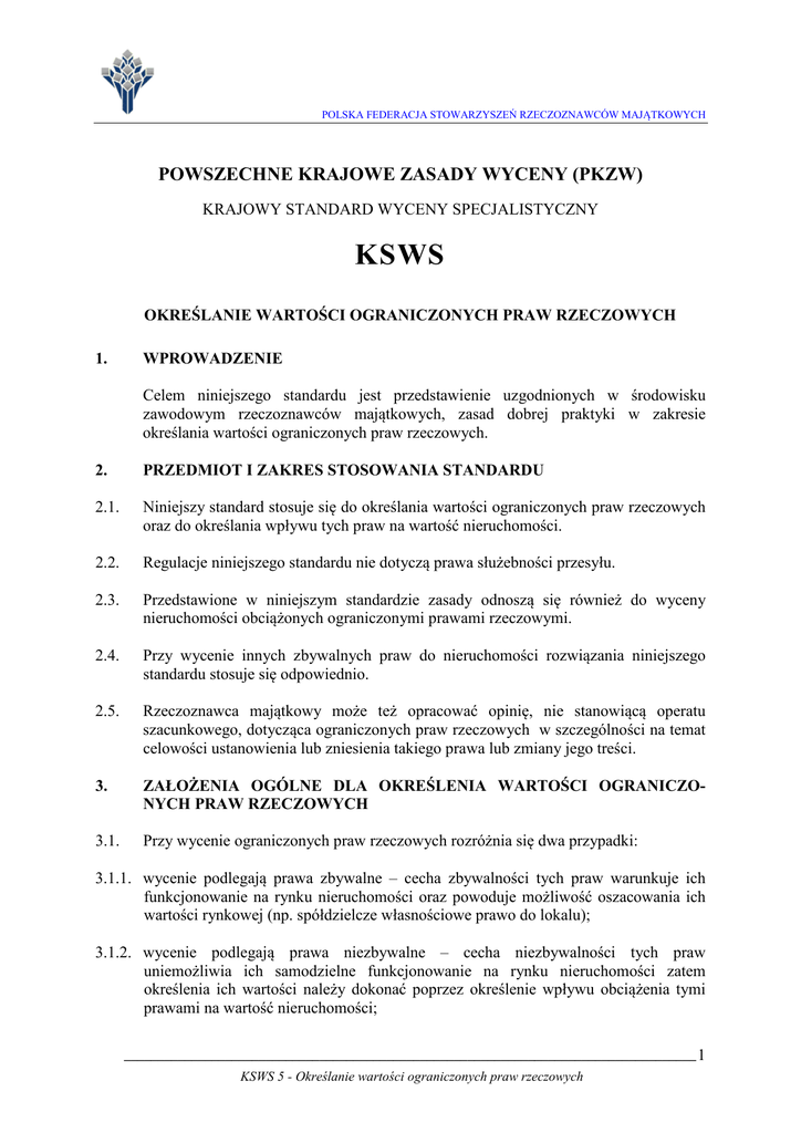 POLSKA FEDERACJA STOWARZYSZEŃ RZECZOZNAWCÓW MAJĄTKOWYCH POWSZECHNE KRAJOWE ZASADY WYCENY (PKZW) KRAJOWY STANDARD WYCENY SPECJALISTYCZNY KSWS OKREŚLANIE WARTOŚCI OGRANICZONYCH PRAW RZECZOWYCH 1. WPROWADZENIE Celem niniejszego standardu jest przedstawienie uzgodnionych w środowisku zawodowym rzeczoznawców majątkowych, zasad dobrej praktyki w zakresie określania wartości ograniczonych praw rzeczowych. 2. PRZEDMIOT I ZAKRES STOSOWANIA STANDARDU 2.1. Niniejszy standard stosuje się do określania wartości ograniczonych praw rzeczowych oraz do określania wpływu tych praw na wartość nieruchomości. 2.2. Regulacje niniejszego standardu nie dotyczą prawa służebności przesyłu. 2.3. Przedstawione w niniejszym standardzie zasady odnoszą się również do wyceny nieruchomości obciążonych ograniczonymi prawami rzeczowymi. 2.4. Przy wycenie innych zbywalnych praw do nieruchomości rozwiązania niniejszego standardu stosuje się odpowiednio. 2.5. Rzeczoznawca majątkowy może też opracować opinię, nie stanowiącą operatu szacunkowego, dotycząca ograniczonych praw rzeczowych w szczególności na temat celowości ustanowienia lub zniesienia takiego prawa lub zmiany jego treści. 3. ZAŁOŻENIA OGÓLNE DLA OKREŚLENIA WARTOŚCI OGRANICZONYCH PRAW RZECZOWYCH 3.1. Przy wycenie ograniczonych praw rzeczowych rozróżnia się dwa przypadki: 3.1.1. wycenie podlegają prawa zbywalne – cecha zbywalności tych praw warunkuje ich funkcjonowanie na rynku nieruchomości oraz powoduje możliwość oszacowania ich wartości rynkowej (np. spółdzielcze własnościowe prawo do lokalu); 3.1.2. wycenie podlegają prawa niezbywalne – cecha niezbywalności tych praw uniemożliwia ich samodzielne funkcjonowanie na rynku nieruchomości zatem określenia ich wartości należy dokonać poprzez określenie wpływu obciążenia tymi prawami na wartość nieruchomości; _____________________________________________________________________________________ 1 KSWS 5 - Określanie wartości ograniczonych praw rzeczowych POLSKA FEDERACJA STOWARZYSZEŃ RZECZOZNAWCÓW MAJĄTKOWYCH 3.2. Założenia i dane wyjściowe przyjęte dla określenia wartości rynkowej ograniczonych praw rzeczowych, muszą mieć charakter rynkowy i wynikać z przeprowadzonej analizy rynku. 4. ZASADY OKREŚLANIA WARTOŚCI ZBYWALNYCH OGRANICZONYCH PRAW RZECZOWYCH 4.1. Poniższe zasady dotyczą zbywalnych ograniczonych praw rzeczowych, w szczególności spółdzielczego własnościowego prawa do lokalu oraz prawa zastawu dotyczącego ekspektatywy odrębnej własności lokalu. 4.2. W opisie stanu prawnego należy m.in. wskazać spółdzielnię mieszkaniową jako właściciela lokalu, a odrębnie wskazać osobę, której przysługuje spółdzielcze własnościowe prawo do lokalu. 4.3. W procesie wyceny należy uwzględnić przede wszystkim dane uzyskane w spółdzielni mieszkaniowej, w tym informacje o budynku, w którym usytuowany jest przedmiotowy lokal (np. rok budowy, rodzaj konstrukcji, kubatura, powierzchnia użytkowa, dane dotyczące remontów). 4.4. Do wyceny spółdzielczego własnościowego prawa do lokalu stosuje się najczęściej podejście porównawcze. 4.5. W przypadku braku lub niewystarczającej liczby transakcji sprzedaży spółdzielczych własnościowych praw do lokalu do określania wartości rynkowej tego prawa można wykorzystać relacje pomiędzy cenami spółdzielczego własnościowego prawa a cenami uzyskiwanymi za nieruchomości lokalowe na danym rynku. 4.6. Przy wycenie spółdzielczego własnościowego prawa do lokalu w podejściu dochodowym określając poziom wydatków operacyjnych należy zwrócić uwagę na strukturę wydatków operacyjnych nieruchomości stanowiących mienie spółdzielni i określić tą ich część która przypada na wyceniany lokal. 4.7. Przy wycenie prawa zastawu dotyczącego ekspektatywy odrębnej własności lokalu należy uwzględnić wartość wniesionego w całości lub w części wkładu budowlanego. 5. ZASADY OKREŚLANIA RZECZOWYCH 5.1. Poniższe zasady dotyczą ograniczonych praw rzeczowych, w szczególności użytkowania i służebności, których wartość nie można określić na podstawie analizy transakcji obejmujących podobne prawa do nieruchomości. 5.2. Zasady określania wartości prawa użytkowania: WARTOŚCI OGRANICZO-NYCH PRAW 5.2.1. określając wartość prawa użytkowania uwzględnia się w szczególności cel wyceny, zakres ustanowionego prawa oraz czas, na który zostało ono ustanowione; _____________________________________________________________________________________ 2 KSWS 5 - Określanie wartości ograniczonych praw rzeczowych POLSKA FEDERACJA STOWARZYSZEŃ RZECZOZNAWCÓW MAJĄTKOWYCH 5.2.2. w zależności od celu wyceny wielkość wpływu ustanowionego prawa użytkowania na wartość nieruchomości obciążonej określa się jako utrata korzyści, które mógłby osiągnąć właściciel nieruchomości gdyby nieruchomość nie była obciążona lub jako korzyści, które może osiągnąć posiadacz prawa użytkowania nieruchomości; 5.2.3. rzeczoznawca majątkowy określa wielkość wpływu prawa użytkowania na wartość całej nieruchomości, ponieważ prawo to jest ustanawiane na całej nieruchomości, chociaż zakres prawa użytkowania może być ograniczony do jego wykonywania na oznaczonej części nieruchomości lub może być ograniczony poprzez wyłączenie oznaczonych pożytków z nieruchomości; 5.2.4. operat szacunkowy prawa użytkowania zawiera informację na temat: – czy, jakie i jak długo będzie ponosił straty właściciel nieruchomości obciążonej; – czy, jakie i jak długo będzie uzyskiwał korzyści użytkownik nieruchomości. 5.2.5. do wyceny wartości prawa użytkowania stosuje się najczęściej podejście dochodowe, metodę inwestycyjną, technikę dyskontowania strumieni dochodów przy pominięciu wartości rezydualnej; 5.2.6. w wycenie po stronie strat właściciela nieruchomości uwzględnia się należy dochody n