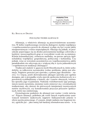 Początki teorii alienacji 27 † PERSPECTIVA Legnickie Studia Teologiczno-Historyczne Rok IV 2005 Nr 2 KS. BOGUSŁAW DROŻDŻ POCZĄTKI TEORII ALIENACJI Alienacja, a właściwie alienacje są przeciwieństwem uczestnictwa. W dobie współczesnego zwrotu ku dialogowi, każdej współpracy i współuczestnictwu powrót do alienacji wydaje się być czymś jakby nieuprawnionym i wielce niepożądanym. Okazuje się jednak, że przeszkody pojawiające się na drodze porozumienia każdego człowieka z każdym i poszczególnych grup ze wszystkimi wcale nie są mniejsze. Klimat komunikacyjny, zwłaszcza medialny, na pewno sprzyja ogólnoludzkiej współpracy gospodarczej, politycznej i kulturalnej. Czy jednak, wraz ze wzrostem uczestnictwa czy współuczestnictwa, jakby paradoksalnie nie odzywają się z większą siłą w życiu jednostkowym i wspólnotowym tendencje alienujące? Trudno jest znaleźć w gąszczu myśli filozoficznych te, które uchodziłyby za całkowicie nowatorskie wobec problemu, jakim jest alienacja. Najpierw przecież jest zjawisko, a potem jego określenie – nazwa. Co więcej, jeżeli doświadczenie jakiegoś zjawiska jest ogólnie dostępne, jak w przypadku wielu zjawisk społeczno-kulturowych, to z pewnością wydobędziemy z historii, ale i czasów obecnych, wielorakie sposoby jego wyjaśniania. Niekiedy wielobarwność ujęć pomaga, innym razem zaciemnia, niemniej warto zmierzyć się z ewentualnymi trudnościami, aby dotrzeć do pierwszych interpretacji teoretycznych nurtów myślowych, czy konsekwentnie przyczyn procesów społecznych, które nas zainteresują. Etymologiczne podejście do alienacji jest ważne i wiele mówiące1. Pojęcie alienacji, podobnie jak wiele innych współcześnie uznawanych terminów naukowych, najpierw funkcjonowało jedynie w sferze języka potocznego. Z czasem, dzięki nadaniu mu bogatszej treści, zgościło już – jako mniej lub bardziej sformułowana teoria – w tu 28 KS. BOGUSŁAW DROŻDŻ i ówdzie głoszonych poglądach, które z kolei uchwyciły publikowane teksty. Wstępnie podając, rozumiemy alienację jako wyobcowanie, tzn. chodzi nam o określenie stosunku do samego siebie, w którym coś pierwotnie własnego traktowane jest jako obce. Czymś własnym może być generalnie wszystko: własne wytwory, odczucia czy zdolności2. Za własny może być uważany ten świat – zewnętrzny, albo ten mój świat – wewnętrzny, czy też tamten, ku któremu zmierzam. Istotą alienacji jest obcość, która jest jakoś określona, nie tylko explicite, ale i implicite. Zatrzymajmy się w niniejszym przedłożeniu na pierwszych próbach formułowania teorii alienacji. Łączyć je musimy przede wszystkim z dwoma filozofami – J. J. Rousseau oraz G. W. F. Heglem. Celem naszej refleksji jest wstępne rozpoznanie zjawiska alienacji. Jest faktem oczywistym, że te pierwsze interpretacje wywarły istotny wpływ na późniejsze teorie alienacji. Obecnie są one nadal podtrzymywane, a ich konstrukcje teoretyczne, ale i weryfikacje praktyczne w wymiarze życia indywidualnego i społecznego nie mogą być pomijane. 1. J. J. Rousseau: jeszcze bez terminu, ale już o alienacji. Człowiek urodził się wolny, a wszędzie jest w okowach. (Umowa społeczna) Jean Jacques Rousseau (1712-1778)3 nie używał tego terminu w znaczeniu teorii alienacji, ale właśnie u niego można odkryć jej początki. Według niego bowiem każdy człowiek, z natury wolny, dobry i szczęśliwy, podlega alienującej deformacji, gdyż bytuje w społeczeństwie, które jest wytworem ludzkim4. Rousseau podkreśla, że 1 Zob. B. DROŻDŻ. Alienacja człowieka w społeczeństwie. „Legnickie Wiadomości Diecezjalne” 11:2002 nr 2 s. 119-120. 2 Słownik filozofii. Hasło: Alienacja. Red. A. Aduszkiewicz. Warszawa 2004 s. 23. 3 T. Hobbes (1588-1679), J. Locke (1632-1704) i J. J. Rousseau oraz I. Kant to filozofowie, których łączy tendencja do myślowego burzenia przekazanych przez tradycję form życia społecznego, uświęconych przez wieki. Po ich zburzeniu, aż do całkowitej eliminacji tych tradycyjnych form, przechodzą do fikcyjnego wyobrażenia o społecznym stanie naturalnym, w tym celu, aby z perspektywy tego naturalnego stanu człowieka zaprojektować nową racjonalną konstrukcję społeczeństwa (umowa społeczna), zdolnego do wzajemnego konsensusu. A. ANZENBACHER. Wprowadzenie do filozofii. Kraków 2003 s. 295. 4 W. CHUDY. Alienacja. W: Powszechna encyklopedia filozofii. T. 1. Red. A. Maryniarczyk. Lublin 2000 s. 190. Początki teorii alienacji 29 wolność człowieka żyjącego w stanie natury jest porównywalna z silnym, przez nic nie poskromionym rumakiem5. Stan natury nie jest jednoznacznie ujmowany przez Rousseau. Nie jest on utożsamiany ze stanem zwierzęcym, chociaż jego charakterystyka w wielu miejscach ociera się o zachowania zwierząt6. Przeciwieństwem dla stanu natury jest stan uspołecznienia i to chyba najmocniej próbuje wykazać w swoich pismach Rousseau7. Autor Rozprawy o pochodzeniu napisał: „Według mego rozumienia dwie spotykamy u gatunku ludzkiego odmiany nierówności: jedną nazywam naturalną lub przyrodzoną, ponieważ ustanowiona jest przez naturę i polega na różnicach wieku, sił, zdrowia, zalet umysłu czy duszy; drugą można by nazwać obyczajową, polityczną albo społeczną, gdyż zależy od czegoś w rodzaju umowy i albo jest zgodnie przez 5 Zob. J. SZACKI. Rousseau: utrata i odzyskanie wolności. W: Antynomie wolności. Z dziejów filozofii wolności. Red. M. Drużkowski, K. Sokół. Warszawa 1966 s. 241. 6 J. J. Rousseau pisze: „człowiek w stanie natury prawie nie potrzebuje lekarstw, a mniej jeszcze – lekarzy; także i pod tym względem gatunek ludzki nie jest w gorszym położeniu niż inne (…) A więc strzeżmy się utożsamiać człowieka dzikiego z człowiekiem, którego widujemy wokoło siebie. Wszystkie pozostawione jej pieczy zwierzęta traktuje natura z łaskawością, która zdaje się świad