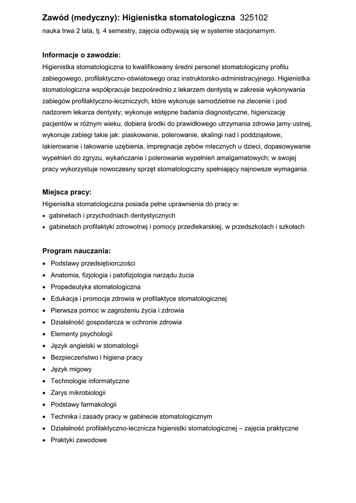 Zawód (medyczny): Higienistka stomatologiczna 325102 nauka trwa 2 lata, tj. 4 semestry, zajęcia odbywają się w systemie stacjonarnym. Informacje o zawodzie: Higienistka stomatologiczna to kwalifikowany średni personel stomatologiczny profilu zabiegowego, profilaktyczno-oświatowego oraz instruktorsko-administracyjnego. Higienistka stomatologiczna współpracuje bezpośrednio z lekarzem dentystą w zakresie wykonywania zabiegów profilaktyczno-leczniczych, które wykonuje samodzielnie na zlecenie i pod nadzorem lekarza dentysty; wykonuje wstępne badania diagnostyczne, higienizację pacjentów w różnym wieku, dobiera środki do prawidłowego utrzymania zdrowia jamy ustnej, wykonuje zabiegi takie jak: piaskowanie, polerowanie, skalingi nad i poddziąsłowe, lakierowanie i lakowanie uzębienia, impregnacje zębów mlecznych u dzieci, dopasowywanie wypełnień do zgryzu, wykańczanie i polerowanie wypełnień amalgamatowych; w swojej pracy wykorzystuje nowoczesny sprzęt stomatologiczny spełniający najnowsze wymagania. Miejsca pracy: Higienistka stomatologiczna posiada pełne uprawnienia do pracy w: gabinetach i przychodniach dentystycznych gabinetach profilaktyki zdrowotnej i pomocy przedlekarskiej, w przedszkolach i szkołach Program nauczania: Podstawy przedsiębiorczości Anatomia, fizjologia i patofizjologia narządu żucia Propedeutyka stomatologiczna Edukacja i promocja zdrowia w profilaktyce stomatologicznej Pierwsza pomoc w zagrożeniu życia i zdrowia Działalność gospodarcza w ochronie zdrowia Elementy psychologii Język angielski w stomatologii Bezpieczeństwo i higiena pracy Język migowy Technologie informatyczne Zarys mikrobiologii Podstawy farmakologii Technika i zasady pracy w gabinecie stomatologicznym Działalność profilaktyczno-lecznicza higienistki stomatologicznej – zajęcia praktyczne Praktyki zawodowe Słuchacz kończąc szkołę otrzymuje: Świadectwo ukończenia szkoły policealnej Dyplom i świadectwo w zawodzie higienistka stomatologiczna oraz suplement w języku obcym potwierdzające kwalifikacje w zawodzie Kwalifikacja: Z.14. Prowadzenie działalności profilaktyczno-leczniczej pod nadzorem i na zlecenie lekarza dentysty oraz utrzymanie gabinetu w gotowości do pracy i prowadzenie promocji zdrowia