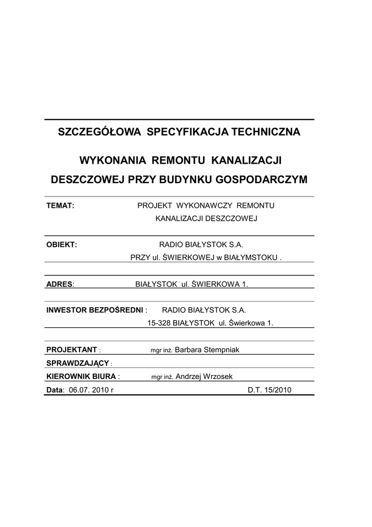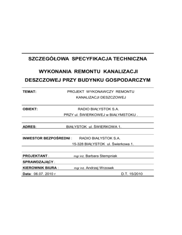 SZCZEGÓŁOWA SPECYFIKACJA TECHNICZNA WYKONANIA REMONTU KANALIZACJI DESZCZOWEJ PRZY BUDYNKU GOSPODARCZYM TEMAT: PROJEKT WYKONAWCZY REMONTU KANALIZACJI DESZCZOWEJ OBIEKT: RADIO BIAŁYSTOK S.A. PRZY ul. ŚWIERKOWEJ w BIAŁYMSTOKU . ADRES: BIAŁYSTOK ul. ŚWIERKOWA 1. INWESTOR BEZPOŚREDNI : RADIO BIAŁYSTOK S.A. 15-328 BIAŁYSTOK ul. Świerkowa 1. PROJEKTANT : mgr inŜ. Barbara Stempniak mgr inŜ. Andrzej Wrzosek SPRAWDZAJĄCY : KIEROWNIK BIURA : Data: 06.07. 2010 r D.T. 15/2010 -1- SZCZEGÓŁOWA SPECYFIKACJA TECHNICZNA WYKONANIA I ODBIORU ROBÓT DOTYCZĄCA REMONTU KANALIZACJI DESZCZOWEJ PRZY BUDYNKU GOSPODARCZYM NA TERENIE RADIO BIAŁYSTOK S.A. PRZY UL. ŚWIERKOWEJ 1 W BIAŁYMSTOKU . CPV 45231300-8; CPV 45111200-0; Obiekt: Inwestor: Kanalizacja deszczowa przy budynku gospodarczym na terenie Radio Białystok S.A. przy ul. Świerkowej 1 w Białymstoku. Radio Białystok S.A. przy ul. Świerkowej 1 w Białymstoku Autor opracowania: mgr inŜ. Barbara Stempniak Data opracowania: 06.07. 2010 r. -2- SPIS TREŚCI SPECYFIKACJI TECHNICZNEJ. 1. WSTĘP S- 01.00.00 1.1. Przedmiot Specyfikacji Technicznych 1.2. Zakres stosowania ST 1.3. Zakres robót objętych ST 1.4. Określenia podstawowe 1.5. Ogólne wymagania dotyczące robót 2. MATERIAŁY 2.1. Rury kanalizacyjne 2.2. Studzienki kanalizacyjne z el. beton. i Ŝelbet. 2.3. Stopnie złazowe 2.4. Piasek na podsypkę i obsypkę rur 2.5. Materiały izolacyjne i uszczelniające 2.6. Składowanie materiałów na placu budowy 2.7. Odbiór materiałów na budowie 3. SPRZĘT 4. TRANSPORT 5.WYKONANIE ROBÓT 5.1. S - 01.00.00 Prace wstępne: 5.2. Roboty przygotowawcze 5.3. Roboty ziemne. 5.4. Podsypka 5.5. Roboty demontaŜowe 5.6. Roboty montaŜowe. 5.6.1. Głębokość ułoŜenia kanału 5.6.2. Opuszczanie rur do wykopu. 5.6.3. Układanie rur. 5.6.4. Połączenia rur kanalizacyjnych 5.6.5. Regulacja studzienek ściekowych i kanalizacyjnych 5.7. Studzienki kanalizacyjne rewizyjne i połączeniowe . 5.8. Zasyp wykopu 5.9. Ochrona przed korozją 6. KONTROLA JAKOŚCI ROBÓT 7. OBMIAR ROBÓT 8. ODBIÓR ROBÓT 9. PODSTAWA PŁATNOŚCI 10.PRZEPISY ZWIĄZANE 10.1. Normy 10.2. Inne dokumenty -3- REMONT KANALIZACJI DESZCZOWEJ PRZY BUDYNKU GOSPODARCZYM. 1.0. WSTĘP S – 01.00.00. 1.1. Przedmiot Specyfikacji Technicznej(ST). Przedmiotem niniejszej Specyfikacji Technicznej są wymagania dotyczące wykonania i odbioru robót związanych z remontem kanalizacji deszczowej przy budynku gospodarczym na terenie rozgłośni radiowej Radio Białystok S.A. przy ul. Świerkowej 1 w Białymstoku. 1.2. Zakres stosowania ST. Specyfikacja Techniczna jest stosowana jako dokument przetargowy i kontraktowy przy zlecaniu i realizacji robót wymienionych w pkt. 1.1. 1.3. Zakres robót objętych ST. Roboty , których dotyczy Specyfikacja obejmują wszystkie czynności umoŜliwiające i mające na celu wykonanie remontu kanalizacji deszczowej. W zakres tych robót wchodzą: - roboty przygotowawcze, - roboty ziemne, - roboty demontaŜowe - roboty montaŜowe , - ochrona przed korozją, - kontrola jakości. 1.4. Określenia podstawowe. Określenia podane w niniejszej ST są zgodne z odpowiednimi normami i Określeniami podanymi w ST D. 1.4.1.Kanał – liniowy obiekt inŜynierski przeznaczony do grawitacyjnego odprowadzenia ścieków. 1.4.2.Kanał ściekowy deszczowy – kanał przeznaczony do odprowadzenia wód opadowych. 1.4.3.Kanał zamknięty – kanał, którego obwód przekroju poprzecznego jest zamknięty. 1.4.4.Przykanalik – kanał przeznaczony do odprowadzenia wód opadowych do kanału głównego. 1.4.5.Kanał przełazowy – kanał zamknięty o wysokości wewnętrznej większej lub równej 1.0 m. 1.4.6.Kanał nieprzełazowy – kanał zamknięty o wysokości wewnętrznej mniejszej niŜ 1.0 m 1.4.7.Studzienka kanalizacyjna (rewizyjna) – obiekt na kanale nieprzełazowym przeznaczony do kontroli i prawidłowej eksploatacji kanałów. 1.4.8. Studzienka przelotowa – studzienka kanalizacyjna zlokalizowana na załamaniach osi kanału w planie na załamaniach spadku kanału oraz na odcinkach prostych. 1.4.9.Studzienka prefabrykowana – studzienka , której co najmniej zasadnicza -4- część komory roboczej i komin włazowy są wykonane z prefabrykatów. 1.4.10.Studzienka kołowa – studzienka z komorą roboczą w kształcie koła w przekroju poziomym. 1.4.11.Studzienka prostokątna – studzienka z komorą roboczą w kształcie prostokąta. 1.4.12.Komora robocza – zasadnicza część studzienki kanalizacyjnej przeznaczona do czynności eksploatacyjnych. 1.4.13.Komin włazowy – szyb łączący komorę roboczą z powierzchnią terenu , przeznaczony do wchodzenia i wychodzenia obsługi. 1.4.14.Kineta – wyprofilowane koryto w dnie studzienki kanalizacyjnej , przeznaczone przepływu ścieków. 1.4.15.Wysokość komory roboczej – odległość pomiędzy rzędną dolnej powierzchni płyty pokrywowej ,lub innego elementu przykrycia komory roboczej , a rzędną spocznika przy ścianie komory. 1.4.16.Spocznik – element dna studzienki pomiędzy kinetą a scianą komory roboczej. 1.4.17.Właz kanałowy – element Ŝeliwny przeznaczony do przykrycia podziemny studzienek kanalizacyjnych , składający się z korpusu i pokrywy. 1.4.18.Eksfiltracja – przenikanie (ubytek) wód lub ścieków z przewodu kanalizacyjnego do gruntu. 1.4.19.Infiltracja – przenikanie wód gruntowych do przewodu kanalizacyjnego. 1.4.20.Płyta pokrywowa (pośrednia) – płyta przykrywająca komorę roboczą studzienki kanalizacyjnej. 1.4.21.Wylot kanału – obiekt na końcu kanału odprowadzającego ścieki do odbiornika. 1.4.22.Wpust ściekowy (deszczowy) – urządzenie do odbioru wód opadowych spływających do kanału z utwardzonych powierzchni terenu. 1.5. Ogólne wymagania dotyczące robót. Wykonawca robót jest odpowiedzialny za jakość ich wykonania , oraz za zgodność z Dokumentacją Projektową , poleceniami Kierownika Projektu oraz sztuką budowlaną. 2.0. MATERIAŁY Ogólne wymagania dotyczące m