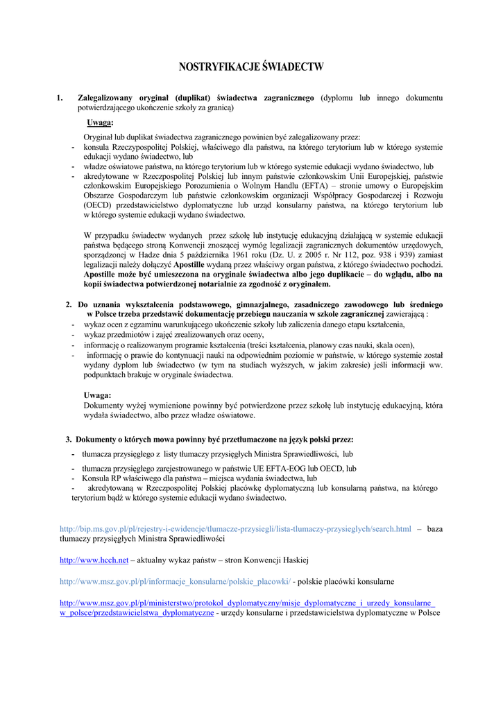 NOSTRYFIKACJE ŚWIADECTW Zalegalizowany oryginał (duplikat) świadectwa zagranicznego (dyplomu lub innego dokumentu potwierdzającego ukończenie szkoły za granicą) 1. Uwaga: - Oryginał lub duplikat świadectwa zagranicznego powinien być zalegalizowany przez: konsula Rzeczypospolitej Polskiej, właściwego dla państwa, na którego terytorium lub w którego systemie edukacji wydano świadectwo, lub władze oświatowe państwa, na którego terytorium lub w którego systemie edukacji wydano świadectwo, lub akredytowane w Rzeczpospolitej Polskiej lub innym państwie członkowskim Unii Europejskiej, państwie członkowskim Europejskiego Porozumienia o Wolnym Handlu (EFTA) – stronie umowy o Europejskim Obszarze Gospodarczym lub państwie członkowskim organizacji Współpracy Gospodarczej i Rozwoju (OECD) przedstawicielstwo dyplomatyczne lub urząd konsularny państwa, na którego terytorium lub w którego systemie edukacji wydano świadectwo. W przypadku świadectw wydanych przez szkołę lub instytucję edukacyjną działającą w systemie edukacji państwa będącego stroną Konwencji znoszącej wymóg legalizacji zagranicznych dokumentów urzędowych, sporządzonej w Hadze dnia 5 października 1961 roku (Dz. U. z 2005 r. Nr 112, poz. 938 i 939) zamiast legalizacji należy dołączyć Apostille wydaną przez właściwy organ państwa, z którego świadectwo pochodzi. Apostille może być umieszczona na oryginale świadectwa albo jego duplikacie – do wglądu, albo na kopii świadectwa potwierdzonej notarialnie za zgodność z oryginałem. 2. Do uznania wykształcenia podstawowego, gimnazjalnego, zasadniczego zawodowego lub średniego w Polsce trzeba przedstawić dokumentację przebiegu nauczania w szkole zagranicznej zawierającą : - wykaz ocen z egzaminu warunkującego ukończenie szkoły lub zaliczenia danego etapu kształcenia, - wykaz przedmiotów i zajęć zrealizowanych oraz oceny, - informację o realizowanym programie kształcenia (treści kształcenia, planowy czas nauki, skala ocen), - informację o prawie do kontynuacji nauki na odpowiednim poziomie w państwie, w którego systemie został wydany dyplom lub świadectwo (w tym na studiach wyższych, w jakim zakresie) jeśli informacji ww. podpunktach brakuje w oryginale świadectwa. Uwaga: Dokumenty wyżej wymienione powinny być potwierdzone przez szkołę lub instytucję edukacyjną, która wydała świadectwo, albo przez władze oświatowe. 3. Dokumenty o których mowa powinny być przetłumaczone na język polski przez: - tłumacza przysięgłego z listy tłumaczy przysięgłych Ministra Sprawiedliwości, lub - tłumacza przysięgłego zarejestrowanego w państwie UE EFTA-EOG lub OECD, lub - Konsula RP właściwego dla państwa – miejsca wydania świadectwa, lub akredytowaną w Rzeczpospolitej Polskiej placówkę dyplomatyczną lub konsularną państwa, na którego terytorium bądź w którego systemie edukacji wydano świadectwo. http://bip.ms.gov.pl/pl/rejestry-i-ewidencje/tlumacze-przysiegli/lista-tlumaczy-przysieglych/search.html – baza tłumaczy przysięgłych Ministra Sprawiedliwości http://www.hcch.net – aktualny wykaz państw – stron Konwencji Haskiej http://www.msz.gov.pl/pl/informacje_konsularne/polskie_placowki/ - polskie placówki konsularne http://www.msz.gov.pl/pl/ministerstwo/protokol_dyplomatyczny/misje_dyplomatyczne_i_urzedy_konsularne_ w_polsce/przedstawicielstwa_dyplomatyczne - urzędy konsularne i przedstawicielstwa dyplomatyczne w Polsce
