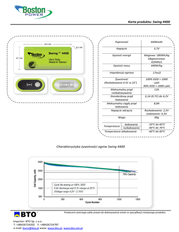 Karta produktu: Swing 4400 Pojemność 4400mAh Napięcie 3,7V Gęstość energii Gęstość mocy Wagowa: 180Wh/kg Objętościowa: 420Wh/L 440W/kg Impedancja ogniwa 17mΩ Żywotność (Rozładowanie 0.5C w 23°) Maksymalny prąd rozładowywania Standardowy prąd ładowania Maksymalny ciągły prąd ładowania Napięcie odcięcia 100% DOD > 1000 cykli 90% DOD > 2000 cykli 12A 3,1A (0.7C) do 4,2V 8,8A Waga Rozładowanie: 2,5V Ładowanie: 4,3V 90g ładowania rozładowania Temperatura składowania -10°C do 60°C -40°C do 70°C -40°C do 60°C Temperatura Charakterystyka żywotności ogniw Swing 4400 Producent zastrzega sobie prawo do dokonywania zmian w specyfikacji niniejszego produktu Importer: BTO Sp. z o.o. T: +48426724202 F: +48426724787 e-mail: [email protected] www: www.bto.pl, www.bto.net.pl Karta produktu: Swing 4400 Charakterystyka pojemności podczas rozładowywania Charakterystyka wydajności ogniw przy różnej temperaturze Producent zastrzega sobie prawo do dokonywania zmian w specyfikacji niniejszego produktu Importer: BTO Sp. z o.o. T: +48426724202 F: +48426724787 e-mail: [email protected] www: www.bto.pl, www.bto.net.pl
